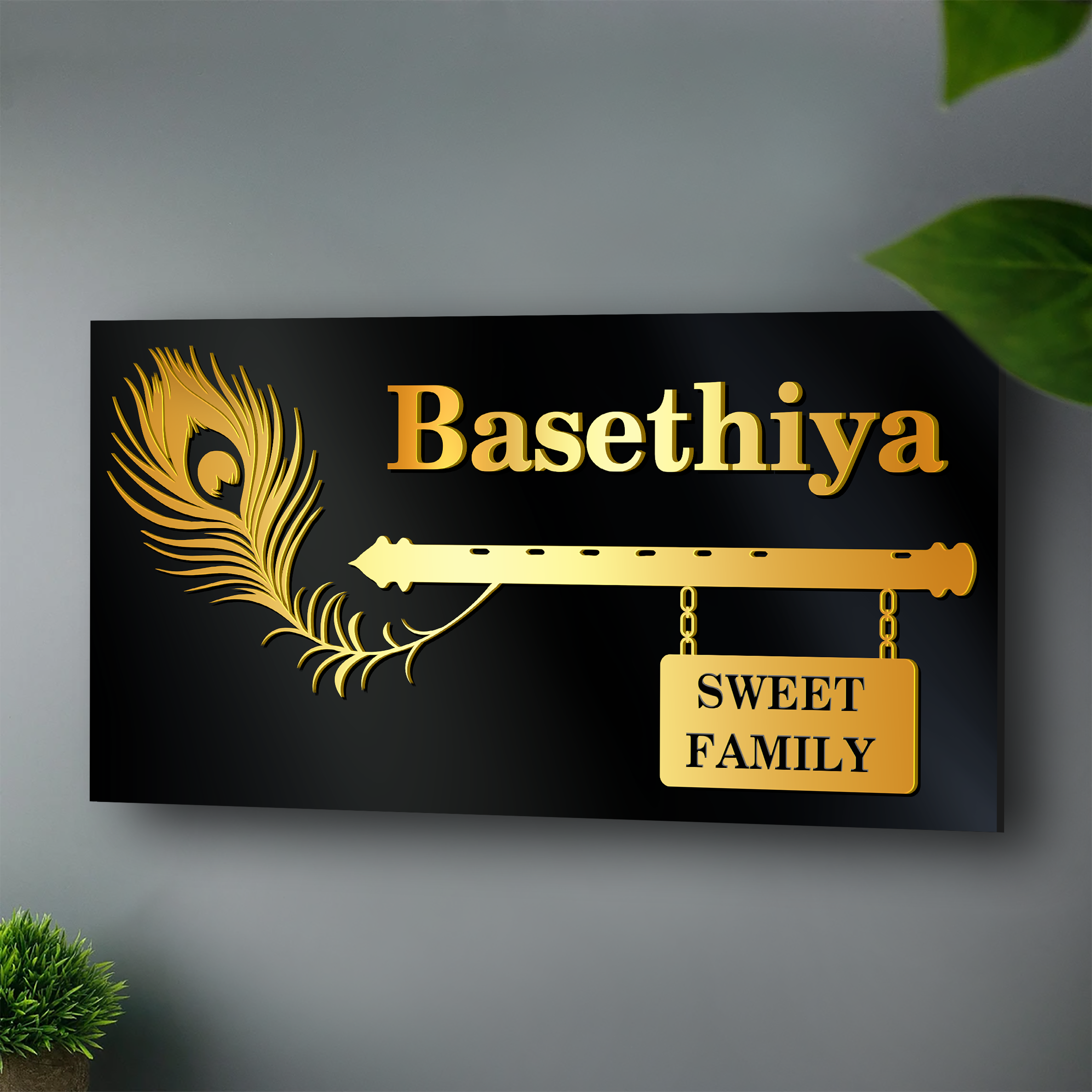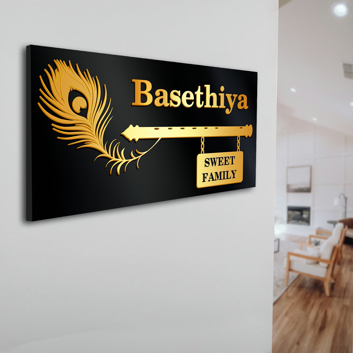 3D Krishna's flute Name Plate for Home| Black Base with Golden 3D Letters