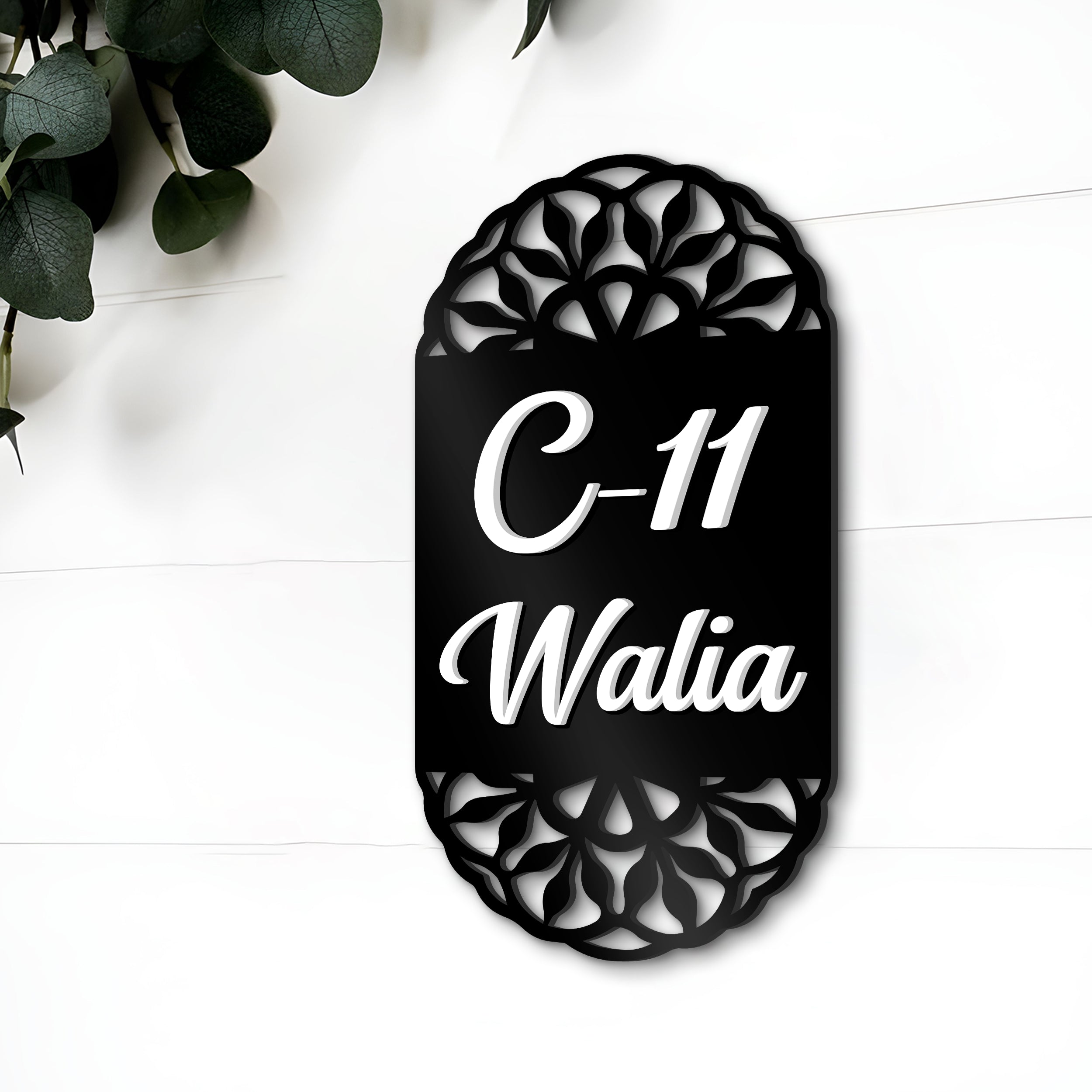 Custom 3D Engraved Acrylic Name Plate – Designer Black Floral Oval Shape