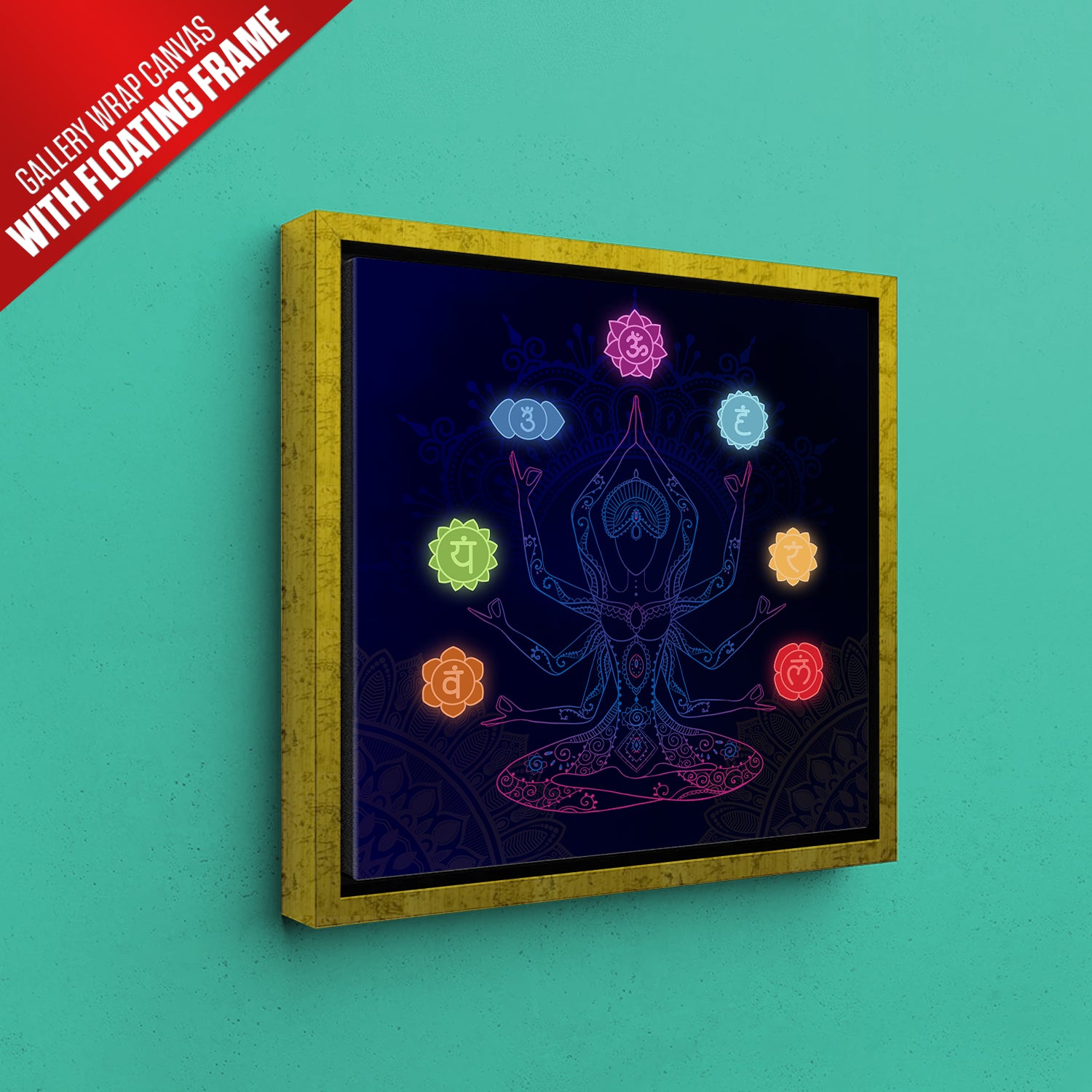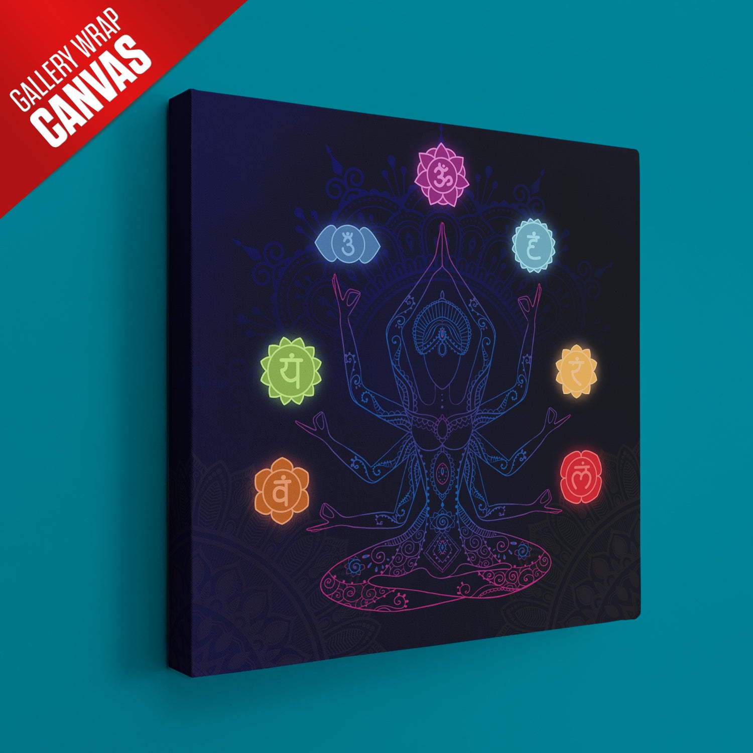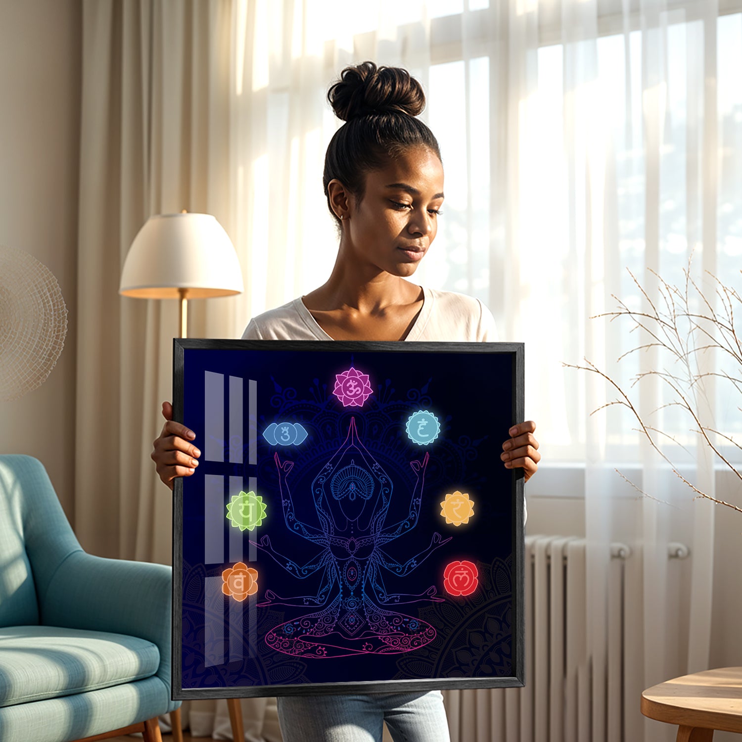 This stunning artwork brings together all seven chakras with their beej mantras—LAM, VAM, RAM, YAM, HAM, AUM, and OM—surrounding a serene meditating figure at the center. Designed in radiant colors with intricate mandalas, it creates a harmonious visual that enhances any room’s ambiance. Perfect for meditation areas, yoga studios, or as a striking piece of modern wall décor, it is available as a framed print, gallery wrap canvas, or poster. A versatile choice for your own collection or as a meaningful gift for someone special.