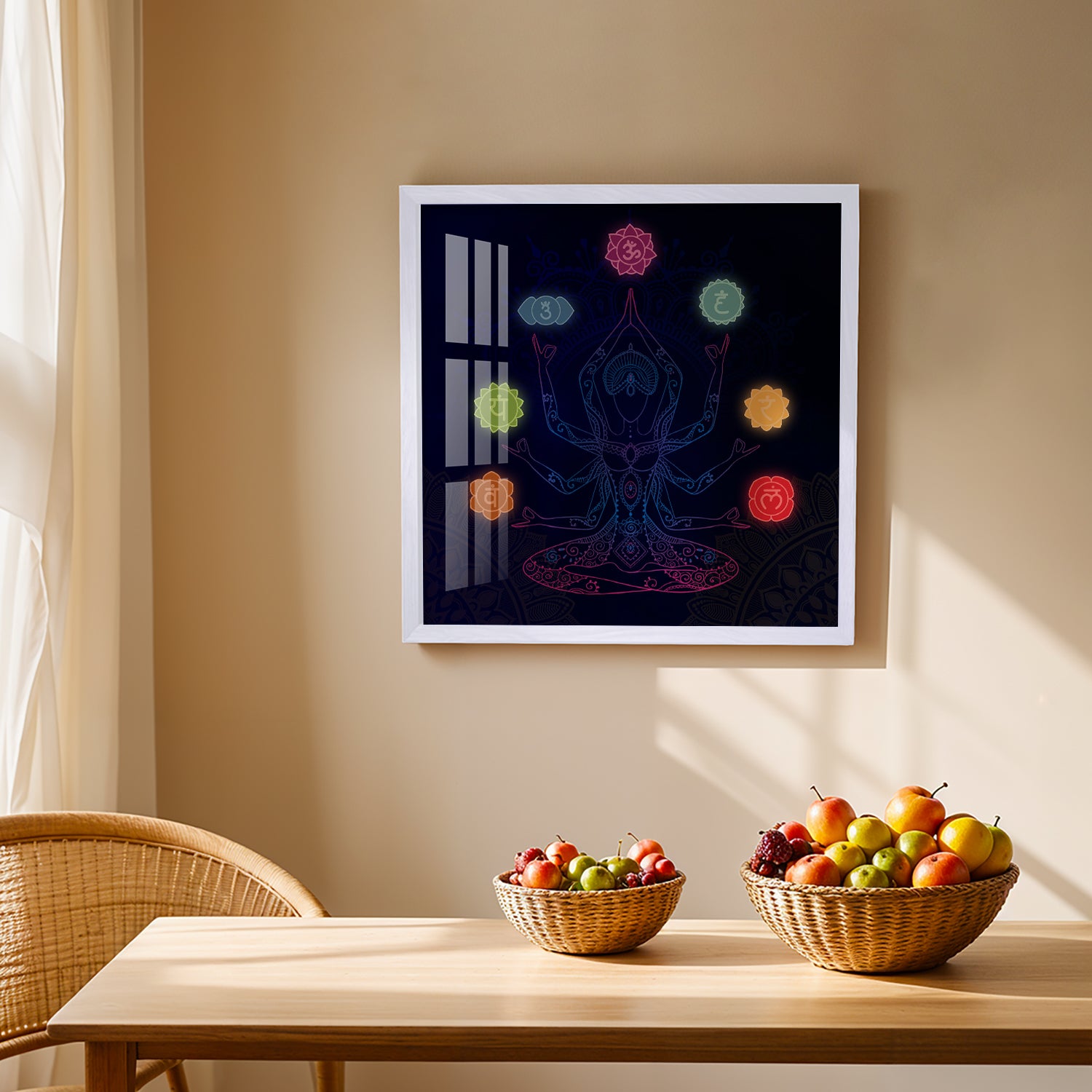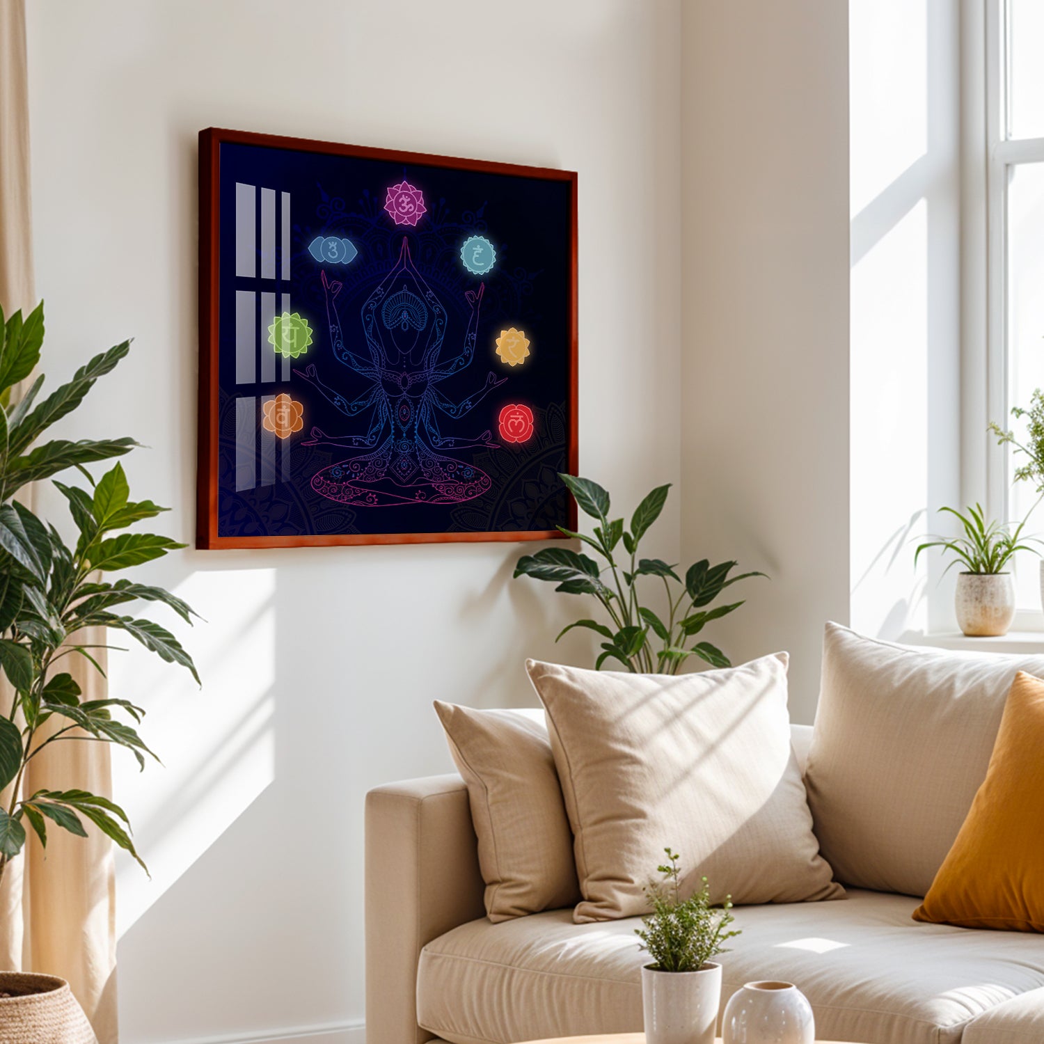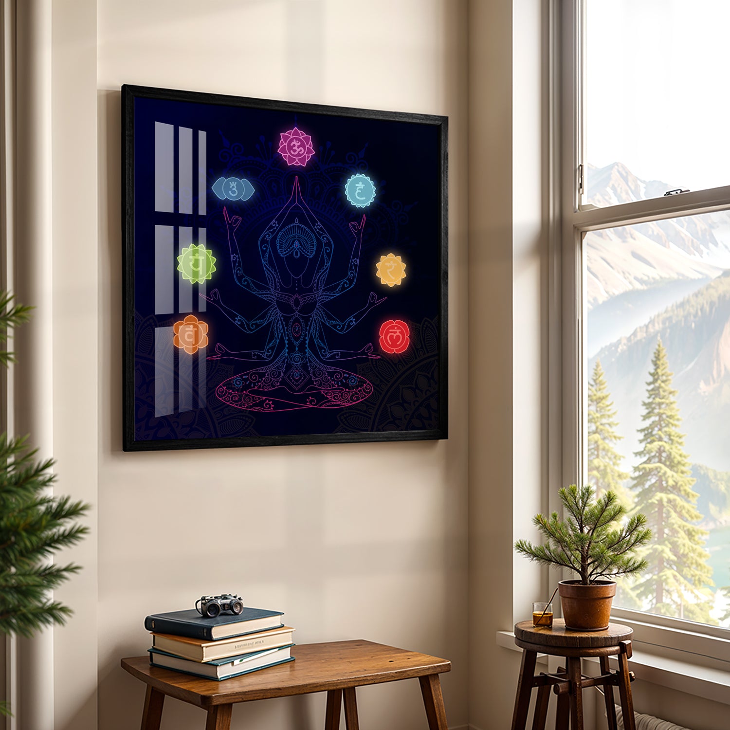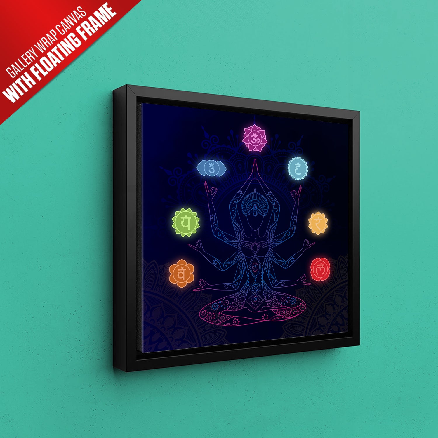 This stunning artwork brings together all seven chakras with their beej mantras—LAM, VAM, RAM, YAM, HAM, AUM, and OM—surrounding a serene meditating figure at the center. Designed in radiant colors with intricate mandalas, it creates a harmonious visual that enhances any room’s ambiance. Perfect for meditation areas, yoga studios, or as a striking piece of modern wall décor, it is available as a framed print, gallery wrap canvas, or poster. A versatile choice for your own collection or as a meaningful gift for someone special.
