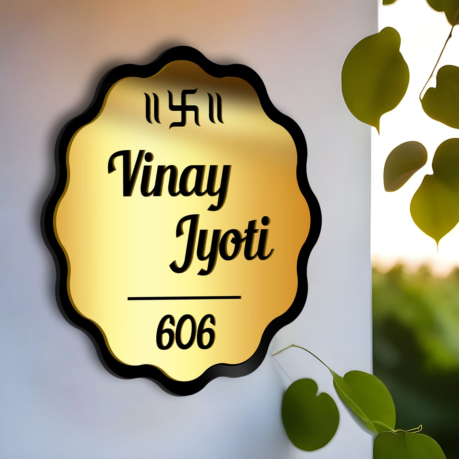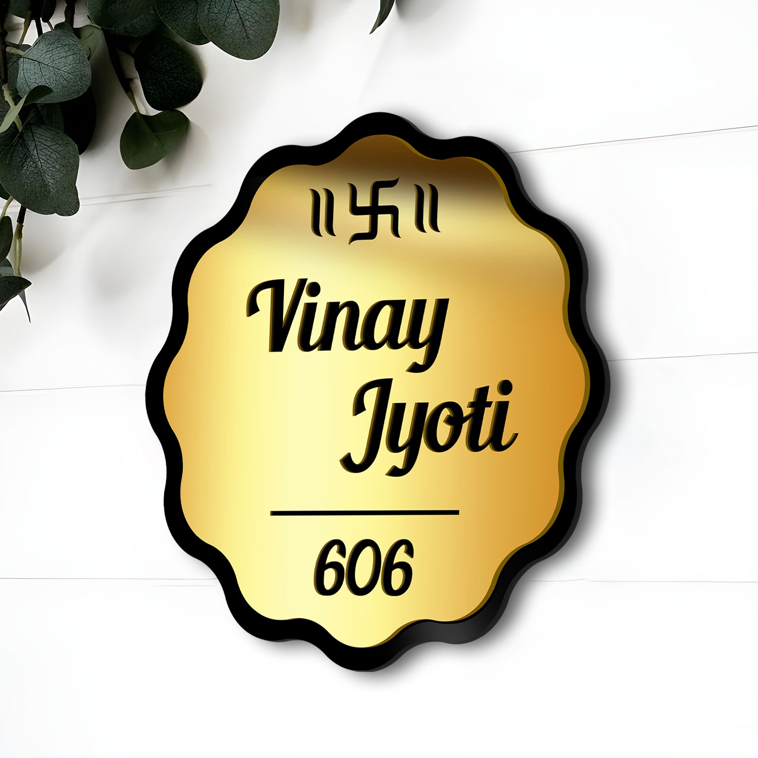 Wavy-Edge Acrylic 3D Name Plate – Custom Engraving with Swastik Symbol