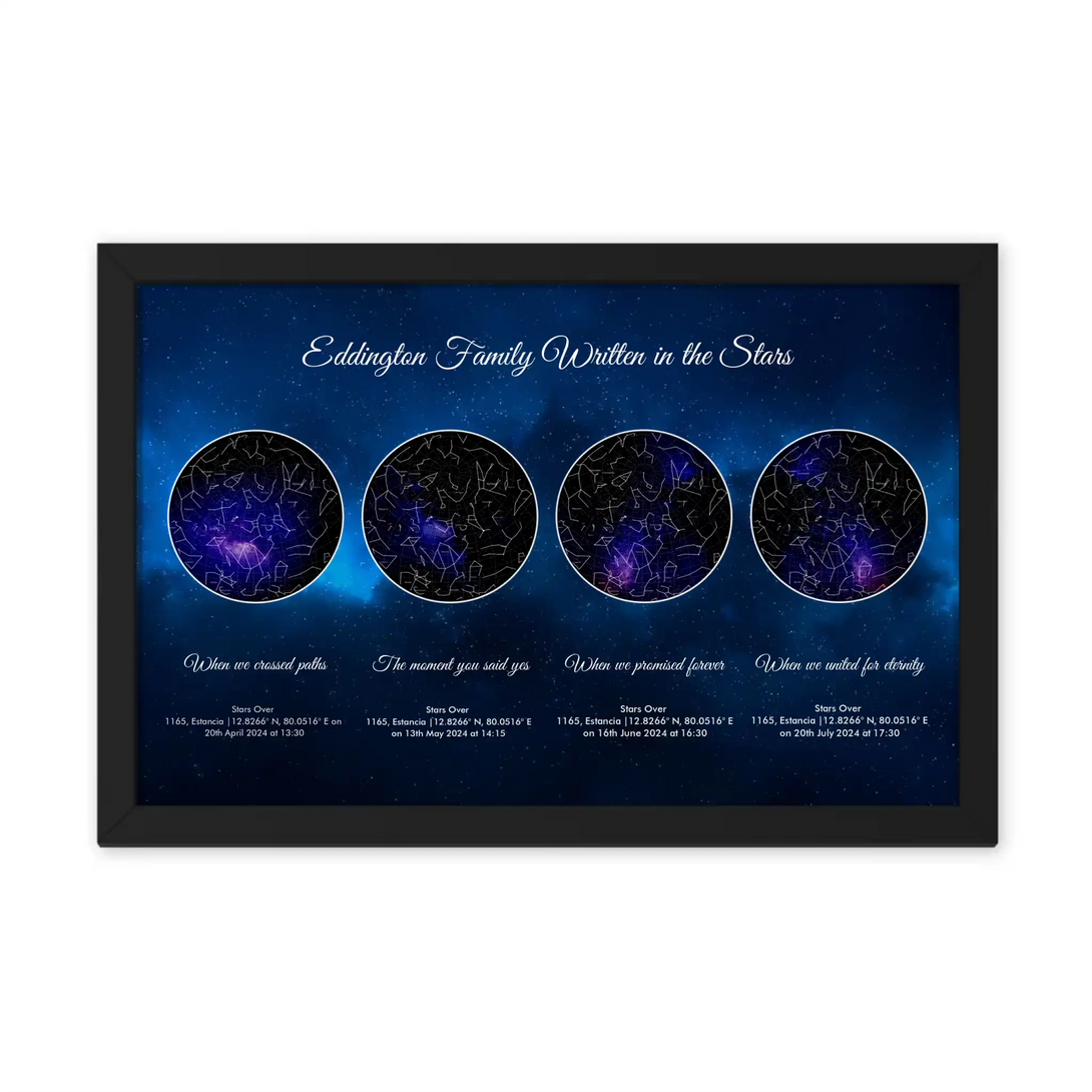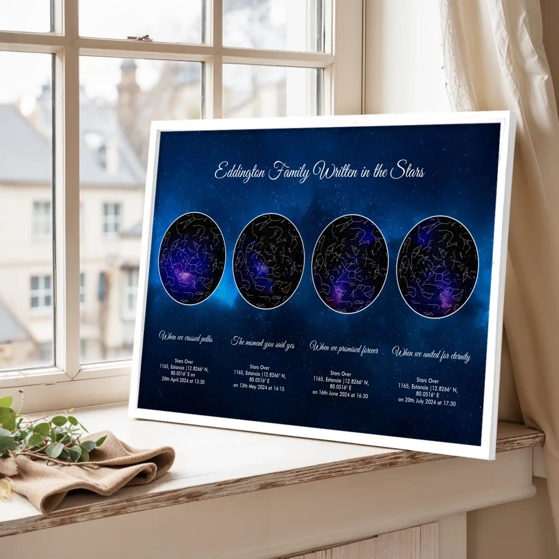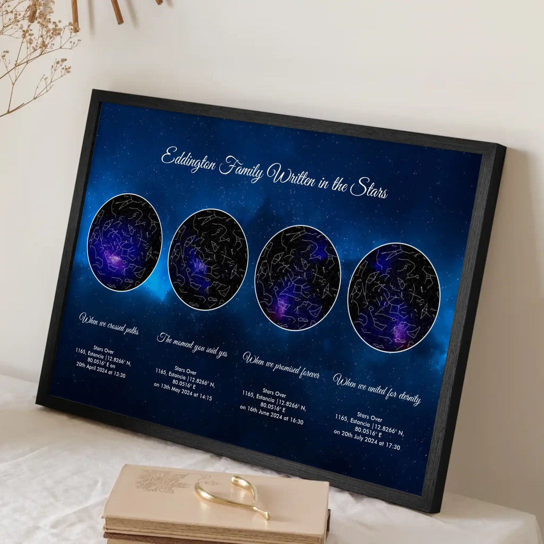 Life’s most cherished milestones deserve to be remembered in a way as unique as the moments themselves. Our Personalized Quadruple Star Map captures the celestial beauty of three key moments in your life—whether it’s the day you met your soulmate, the magical moment of your engagement, and your wedding day, or a journey through other life achievements like the birth of your children or career highlights. Each star map is crafted with precision, showcasing how the universe aligned at the exact time, date, and location of your unforgettable memories. This isn’t just wall art; it’s a story beautifully told through the stars.
