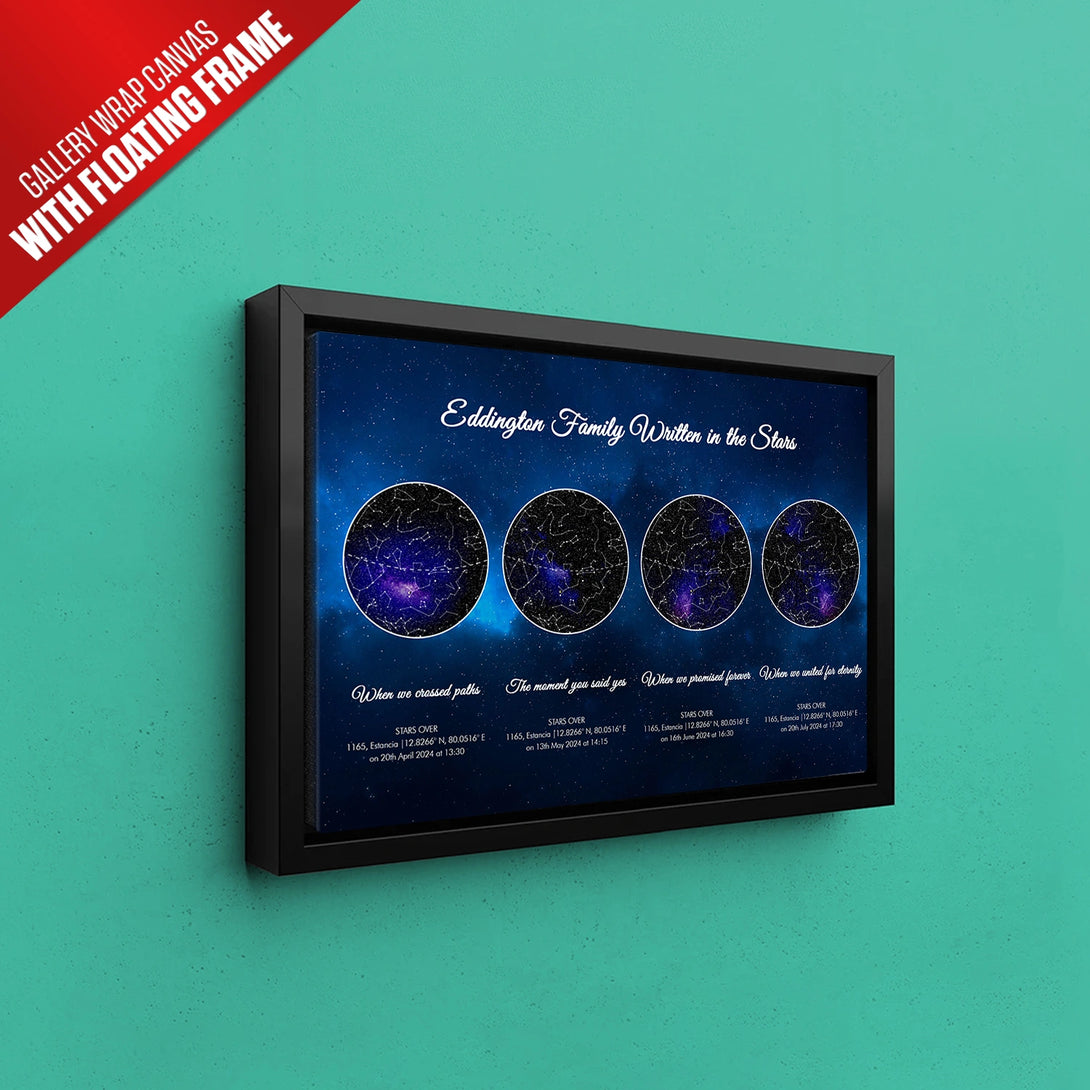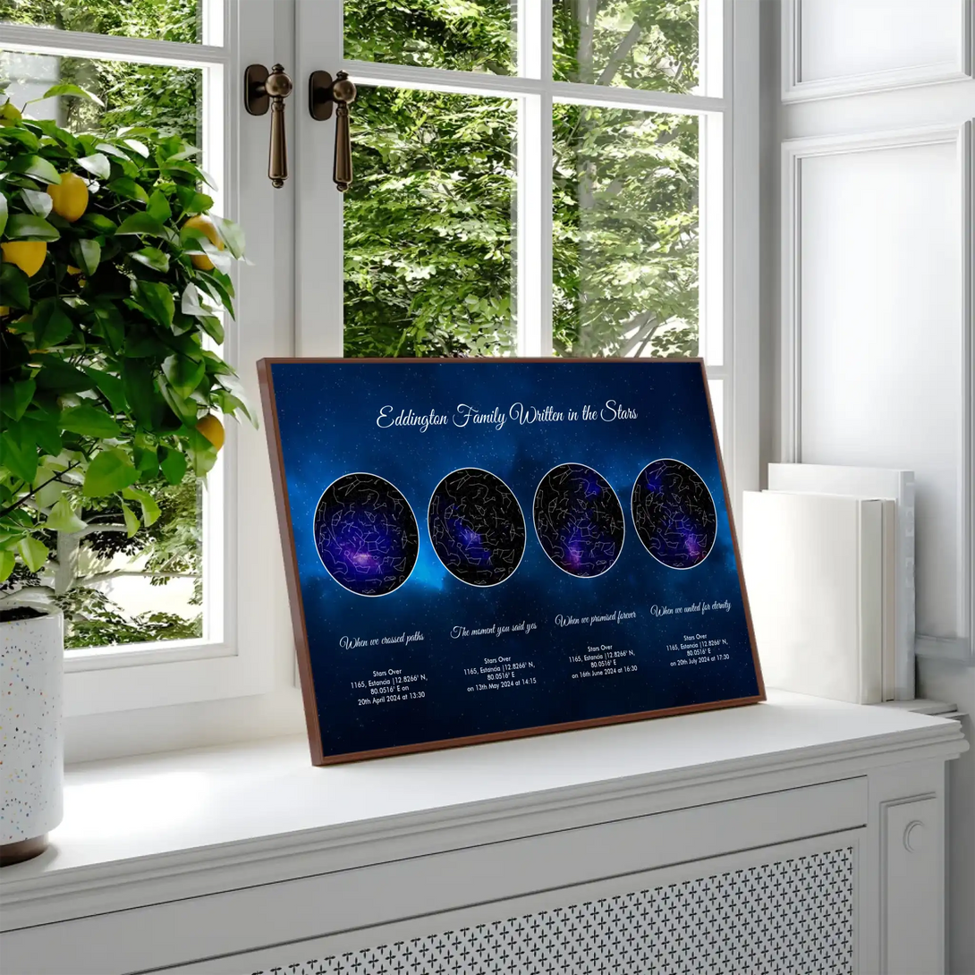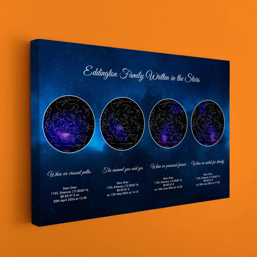 Life’s most cherished milestones deserve to be remembered in a way as unique as the moments themselves. Our Personalized Quadruple Star Map captures the celestial beauty of three key moments in your life—whether it’s the day you met your soulmate, the magical moment of your engagement, and your wedding day, or a journey through other life achievements like the birth of your children or career highlights. Each star map is crafted with precision, showcasing how the universe aligned at the exact time, date, and location of your unforgettable memories. This isn’t just wall art; it’s a story beautifully told through the stars.