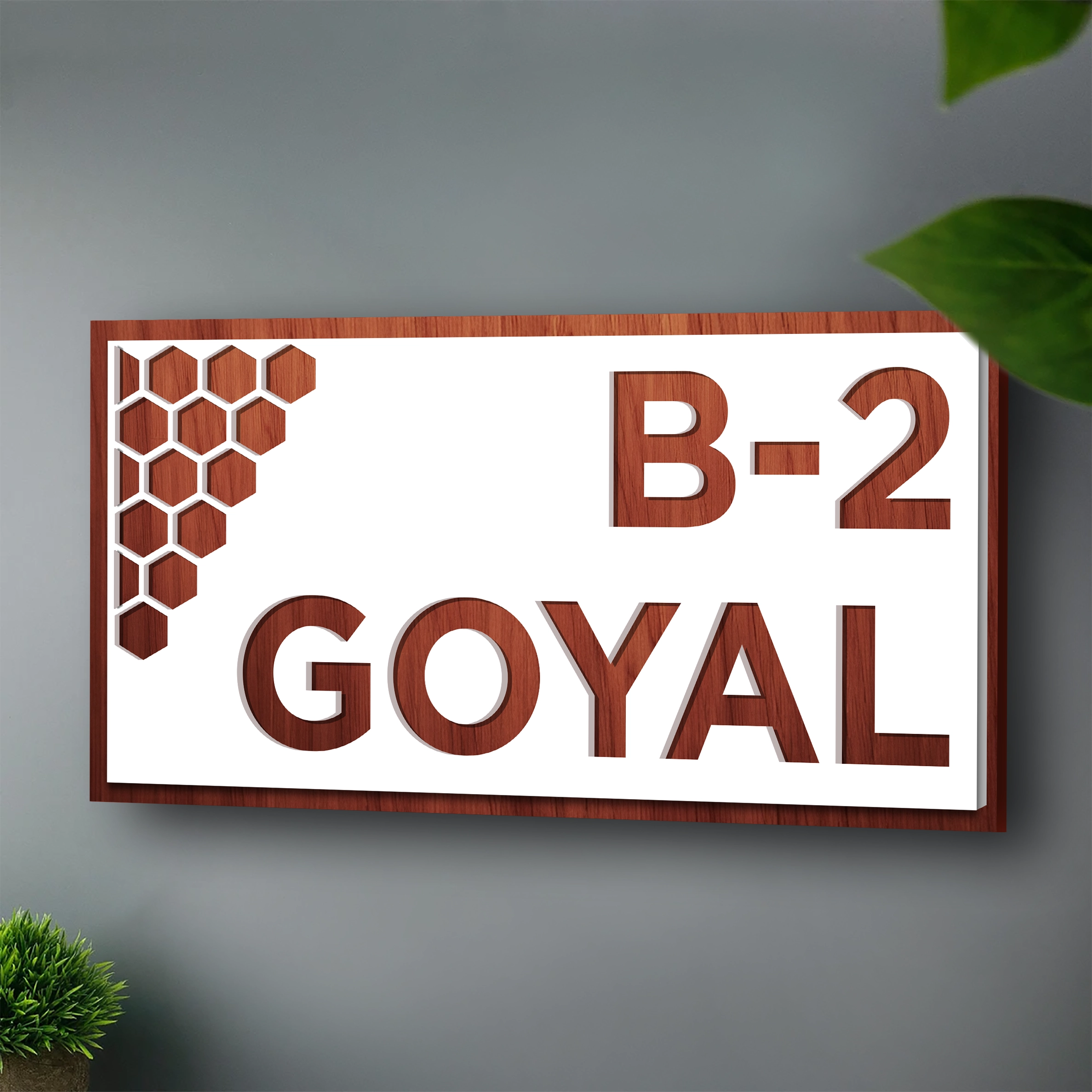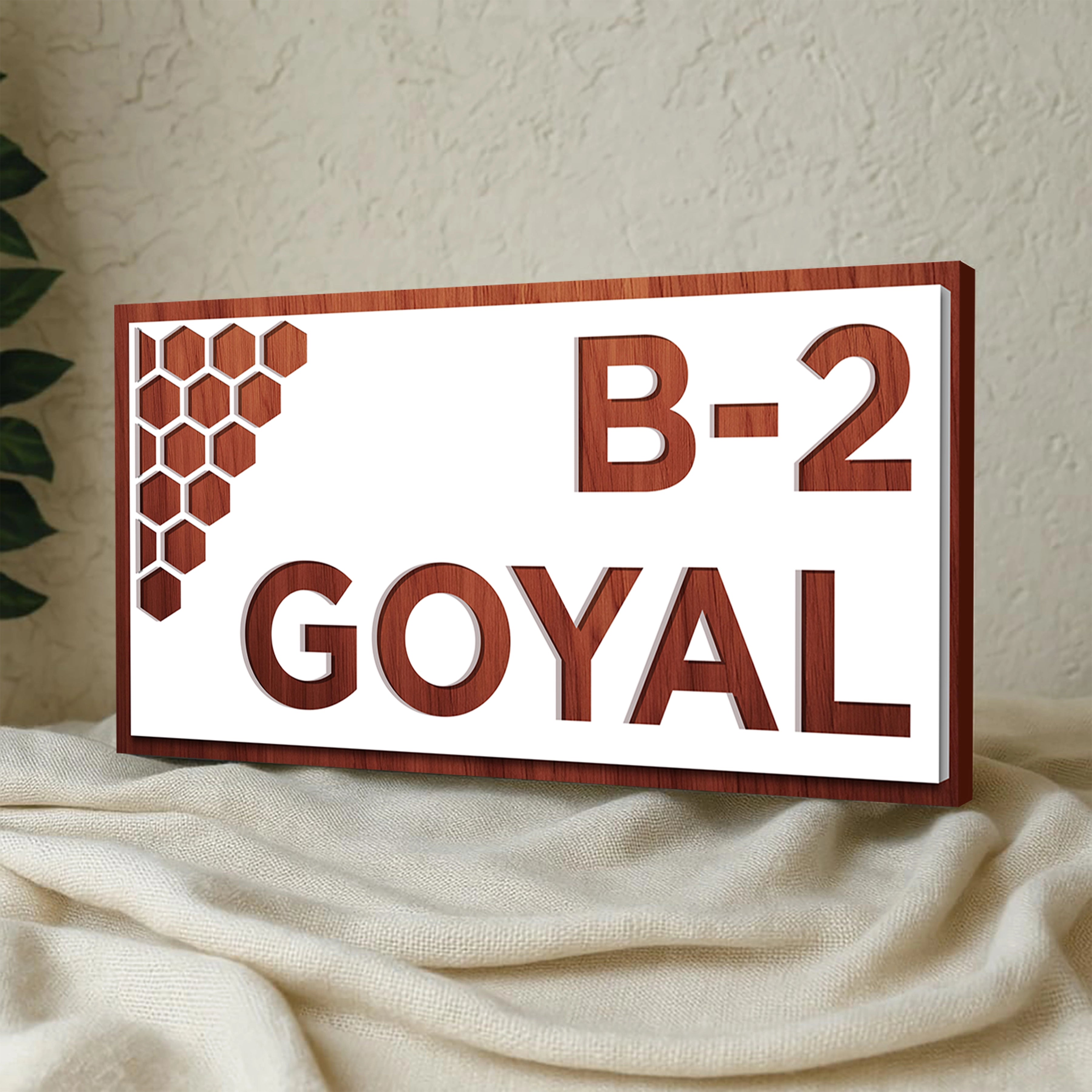 This engraved wooden name plate is crafted on a refined white wooden base with a precision-cut hexagonal pattern on one side, creating a contemporary aesthetic that stands out instantly. The deep wood-engraved text. Offers both visual depth and a luxurious finish, making it ideal for modern homes and professional environments. Its clean geometry and warm wood tones harmonize with any wall color, giving your space a composed and elevated appearance.