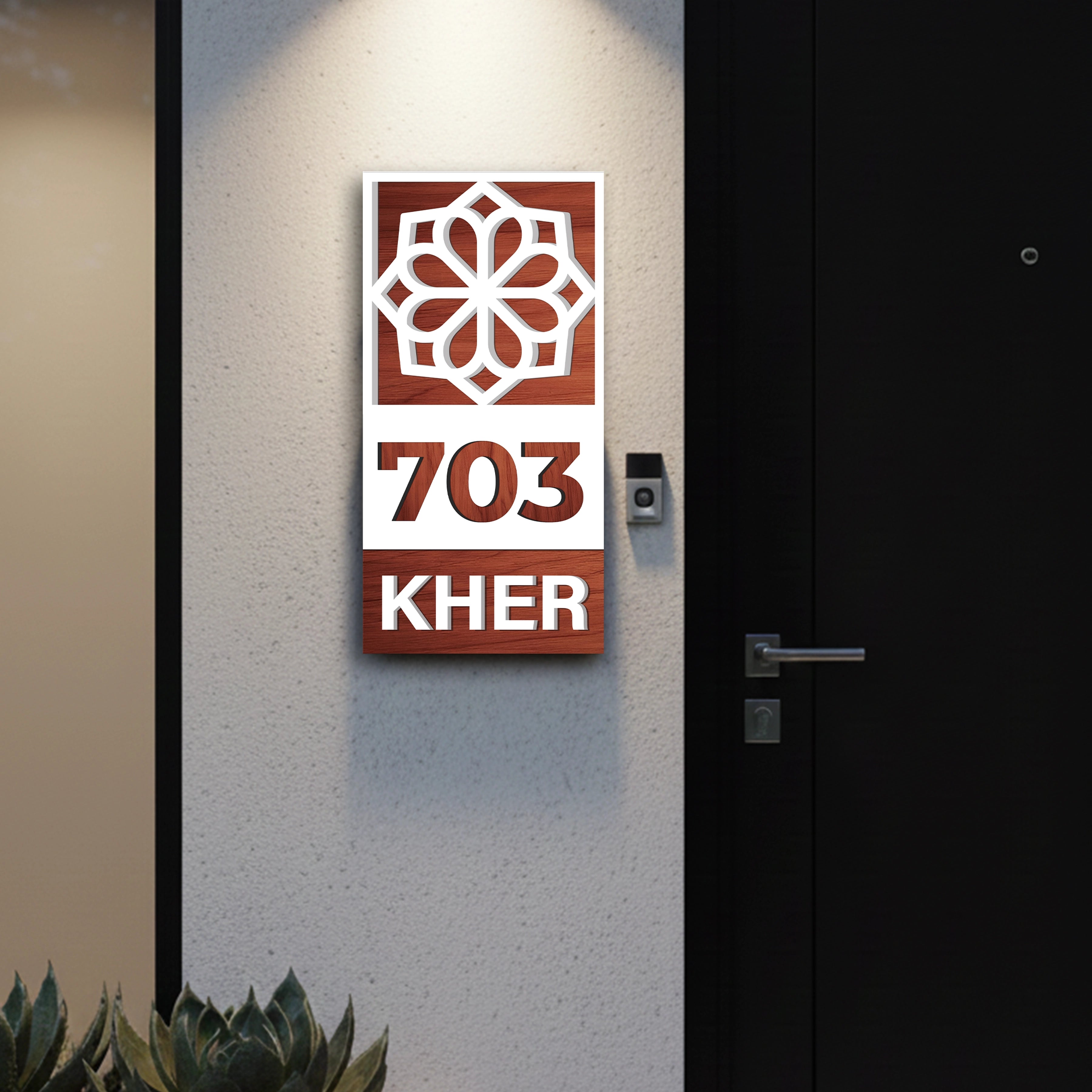 Welcome to a design that blends tradition, craftsmanship, and modern elegance. This premium wooden cut out style name plate is more than a marker—it’s a statement. The geometric floral artwork carved on top tells a story of harmony and unity, adding a warm, welcoming charm to any home entrance. Crafted to perfection, this plate instantly enhances curb appeal, making your doorway feel more personal and luxurious.