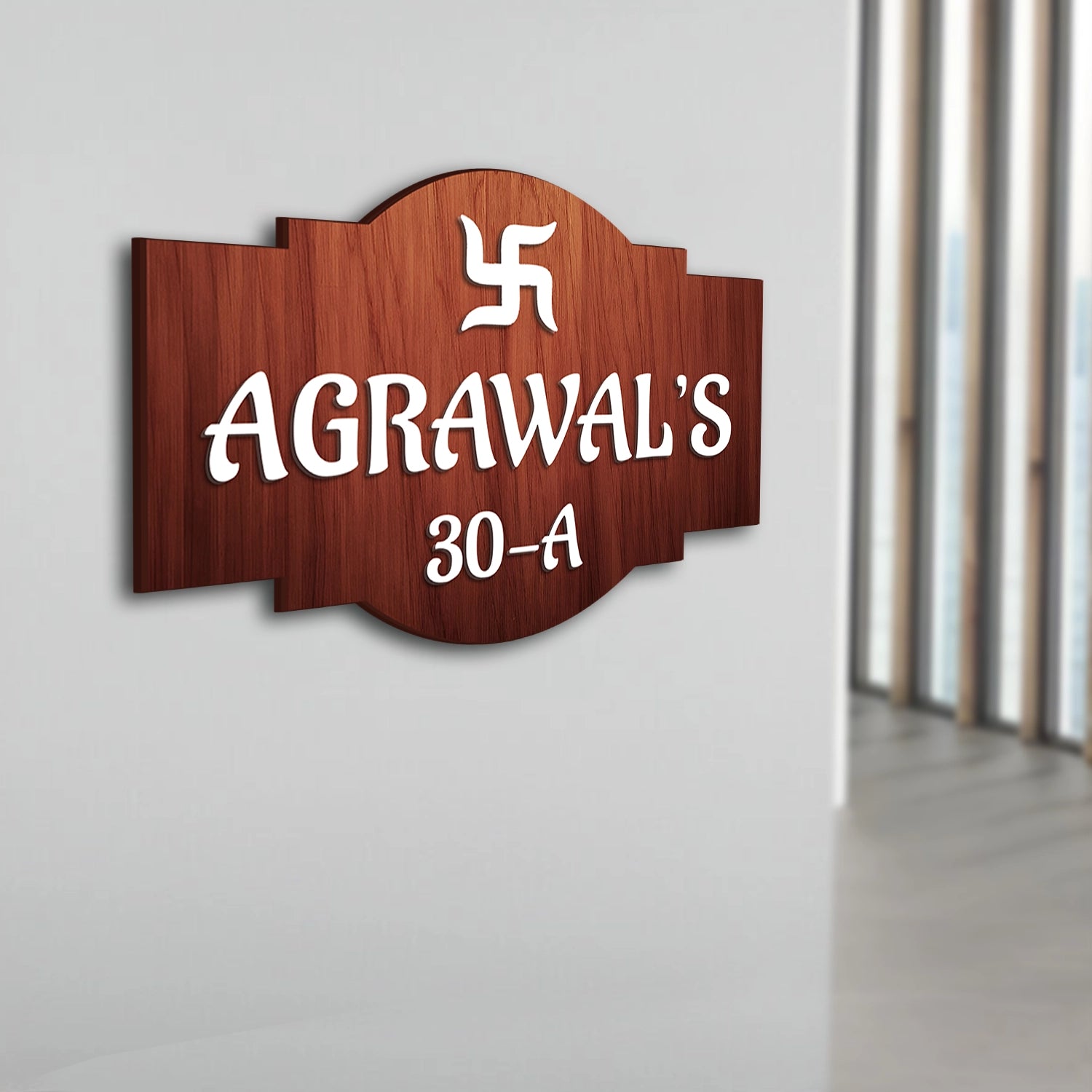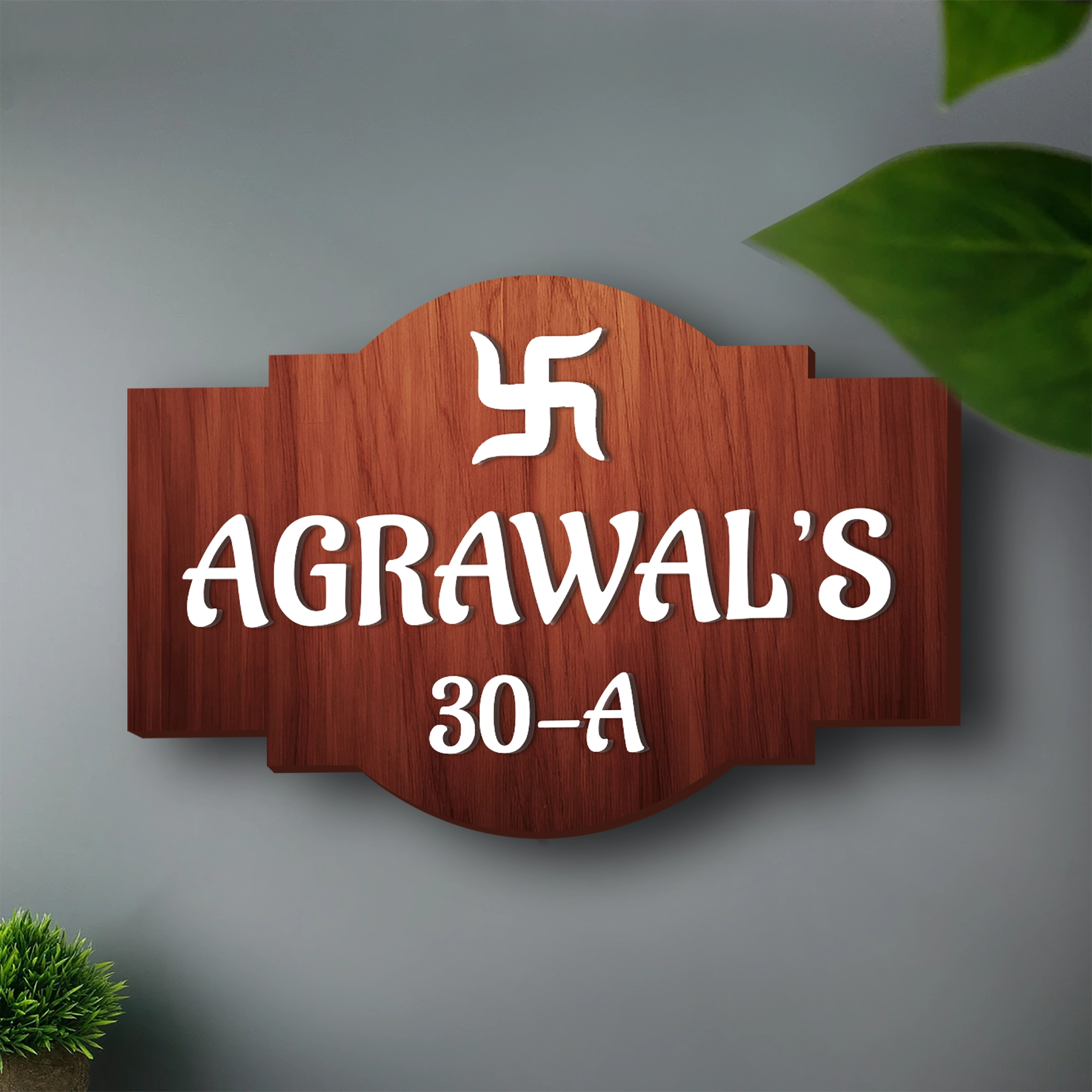 This wooden name plate features a rich brown wood-finish background with crisp white pasted text that stands out clearly from a distance. The centered symbol adds a traditional and auspicious touch,...