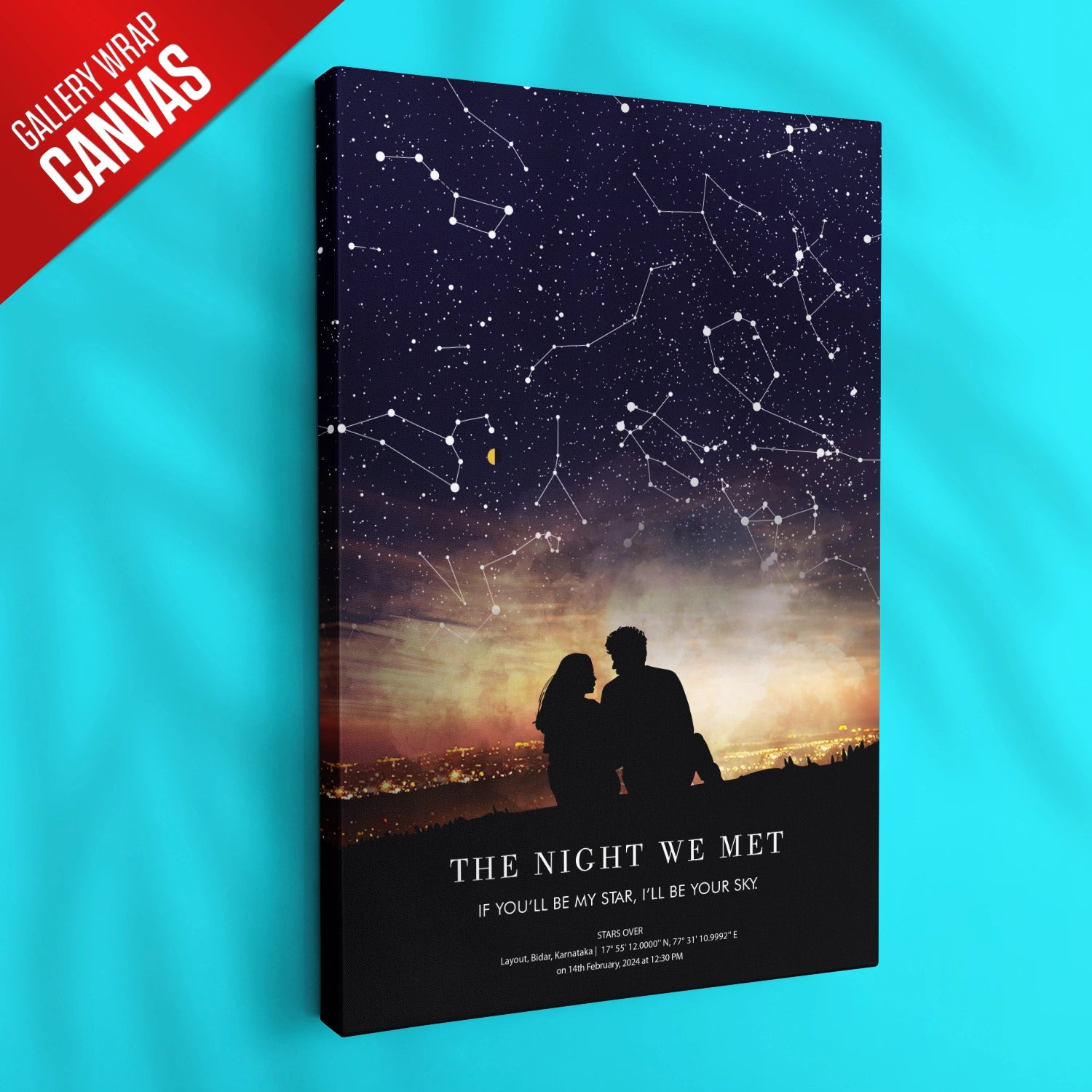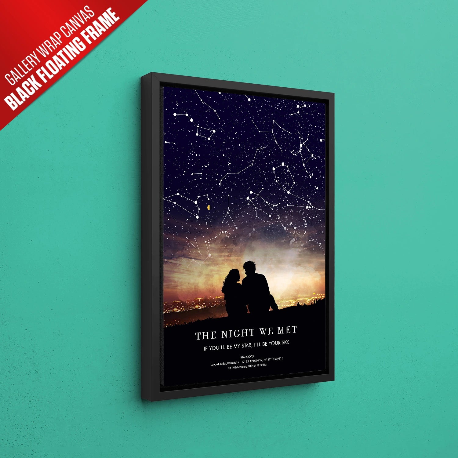 This unique artwork is a masterpiece of personalization, blending celestial beauty with an artistic silhouette scene. Every detail, from the stars above to the illuminated cityscape below, tells your story in a way words alone cannot. Whether it’s a declaration of love, a reminder of a special achievement, or a token of gratitude, this star map adds warmth and sentiment to your home. Available as a framed print or a gallery-style canvas in various sizes, it effortlessly enhances any living space, serving as a daily reminder of the moments that shaped your life.