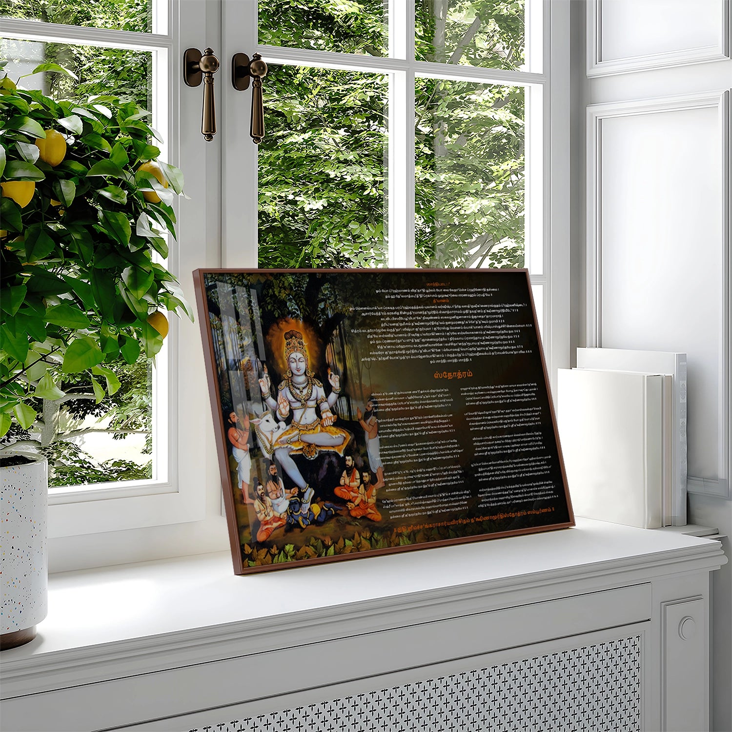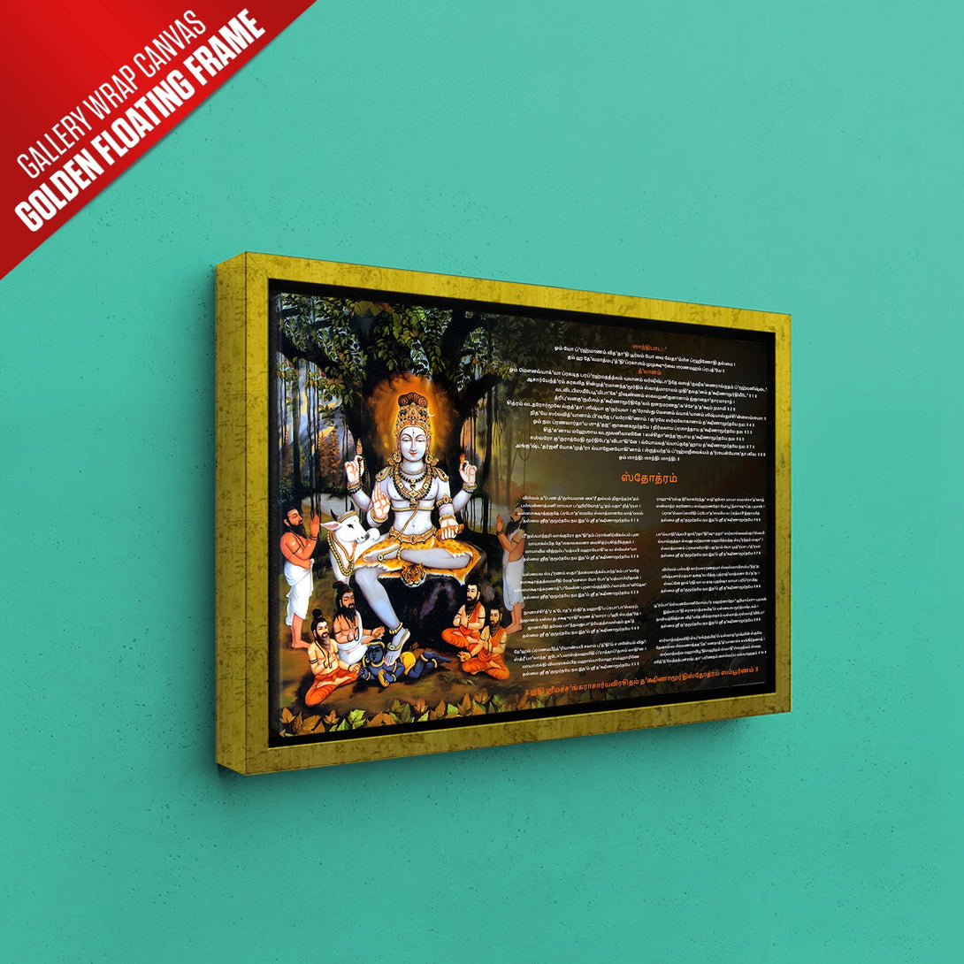 This stunning Dakshinamurthy Tamil Stotram artwork captures Lord Shiva as the eternal teacher of wisdom, seated gracefully under the sacred banyan tree. Surrounded by sages and illuminated in divine radiance, this masterpiece symbolizes knowledge, guidance, and spiritual awakening. Every glance at this painting evokes peace, grounding energy, and timeless inspiration.