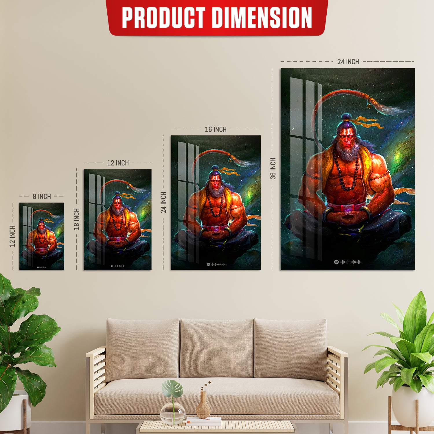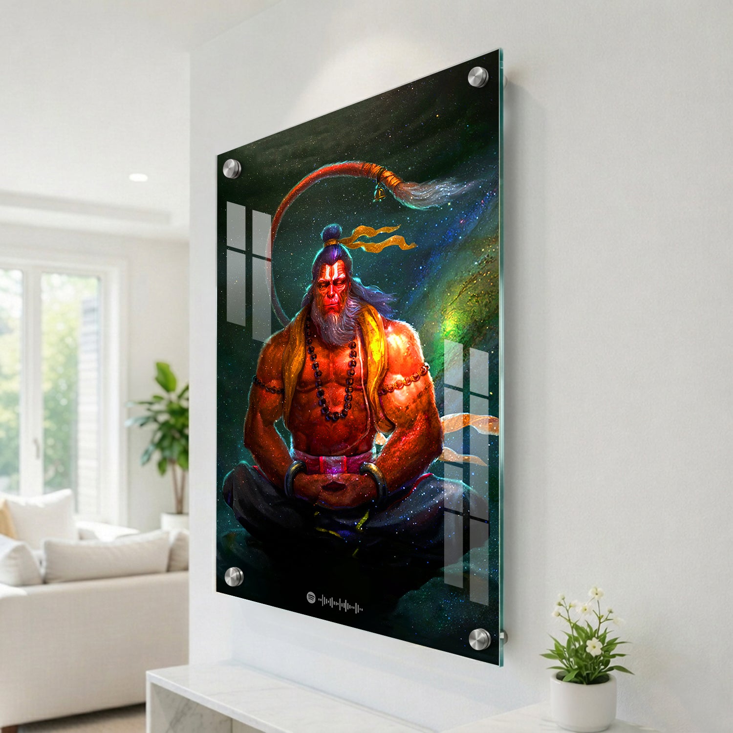 The artwork is printed on high-quality acrylic using advanced UV printing, ensuring sharp details and colors that stay vibrant over time. It is available in 3mm, 5mm, and 8mm thickness options, offering a smooth, glass-like finish that enhances depth and clarity. It also comes with standoff screws, giving it a clean floating look on the wall and making installation simple. Lightweight and durable, it’s designed to add a bold and modern spiritual touch to your space.