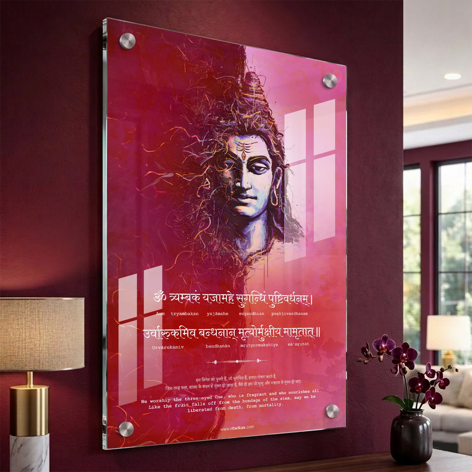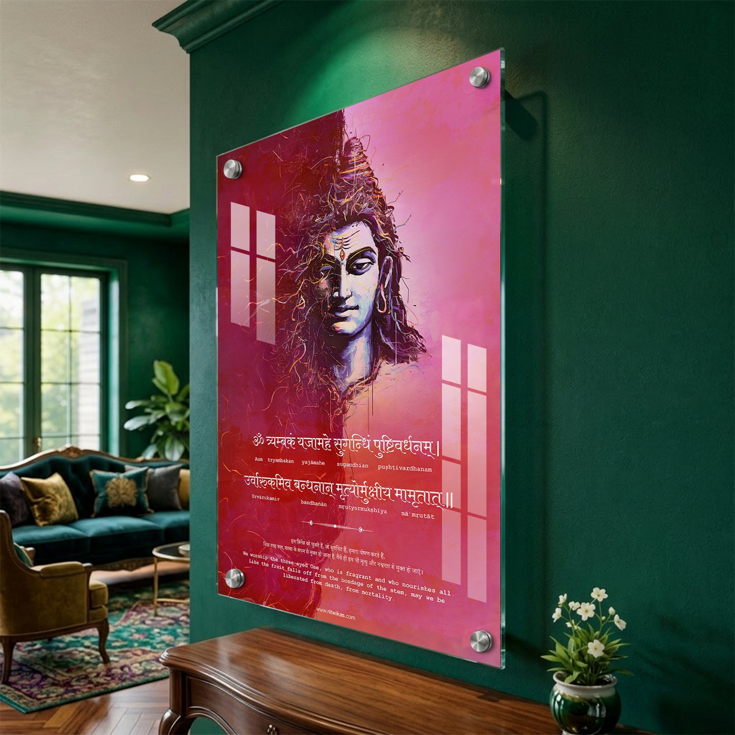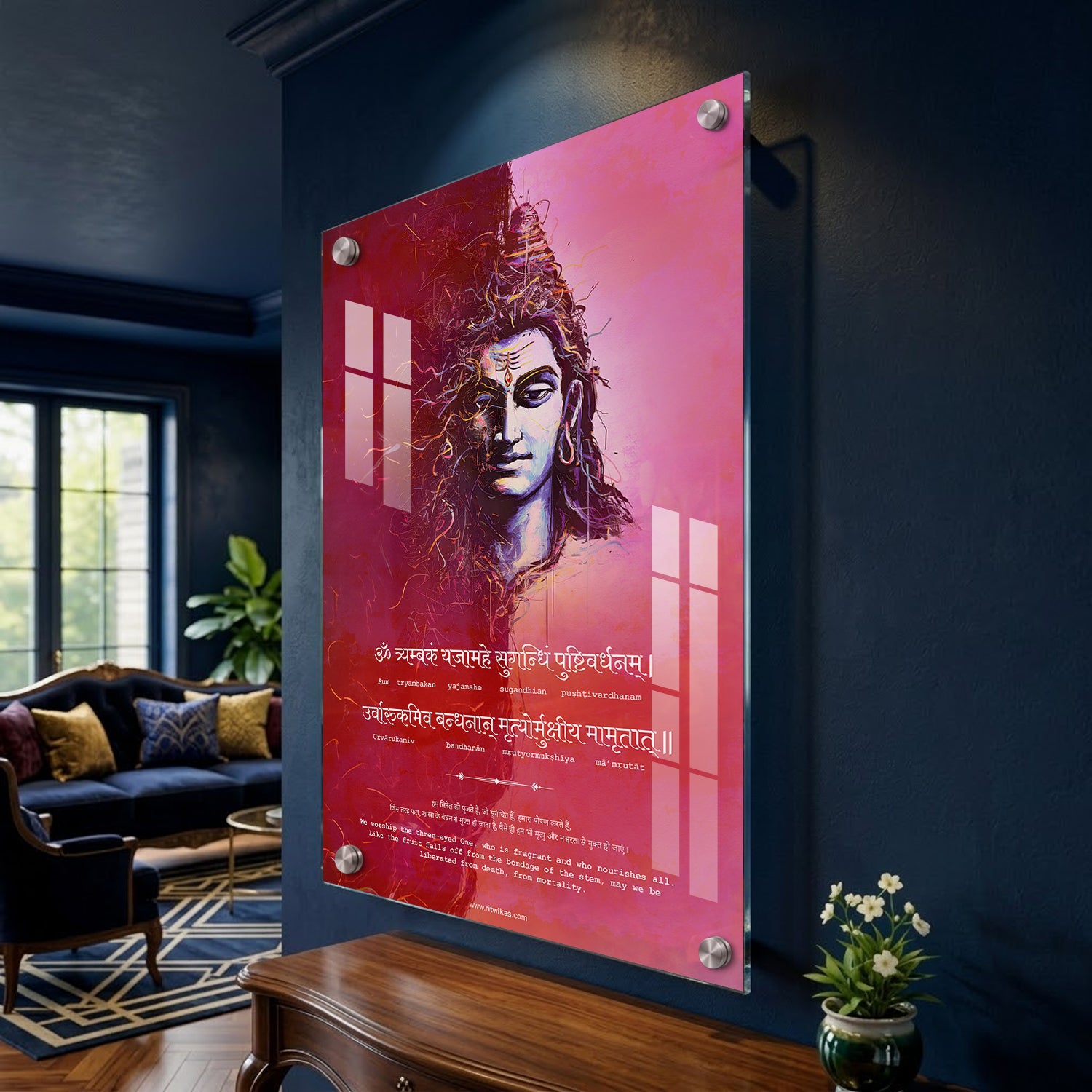 This acrylic print features the powerful Mahamrityunjaya Mantra, a sacred chant dedicated to Lord Shiva and often associated with protection, healing, and inner strength. The artwork presents a modern, expressive depiction of the three-eyed form of Shiva (Tryambakam), designed in rich pink and purple tones that give it a deep and calming presence. It’s a great choice for spaces where you want a sense of focus, positivity, and protection—like your home, meditation area, or yoga studio.