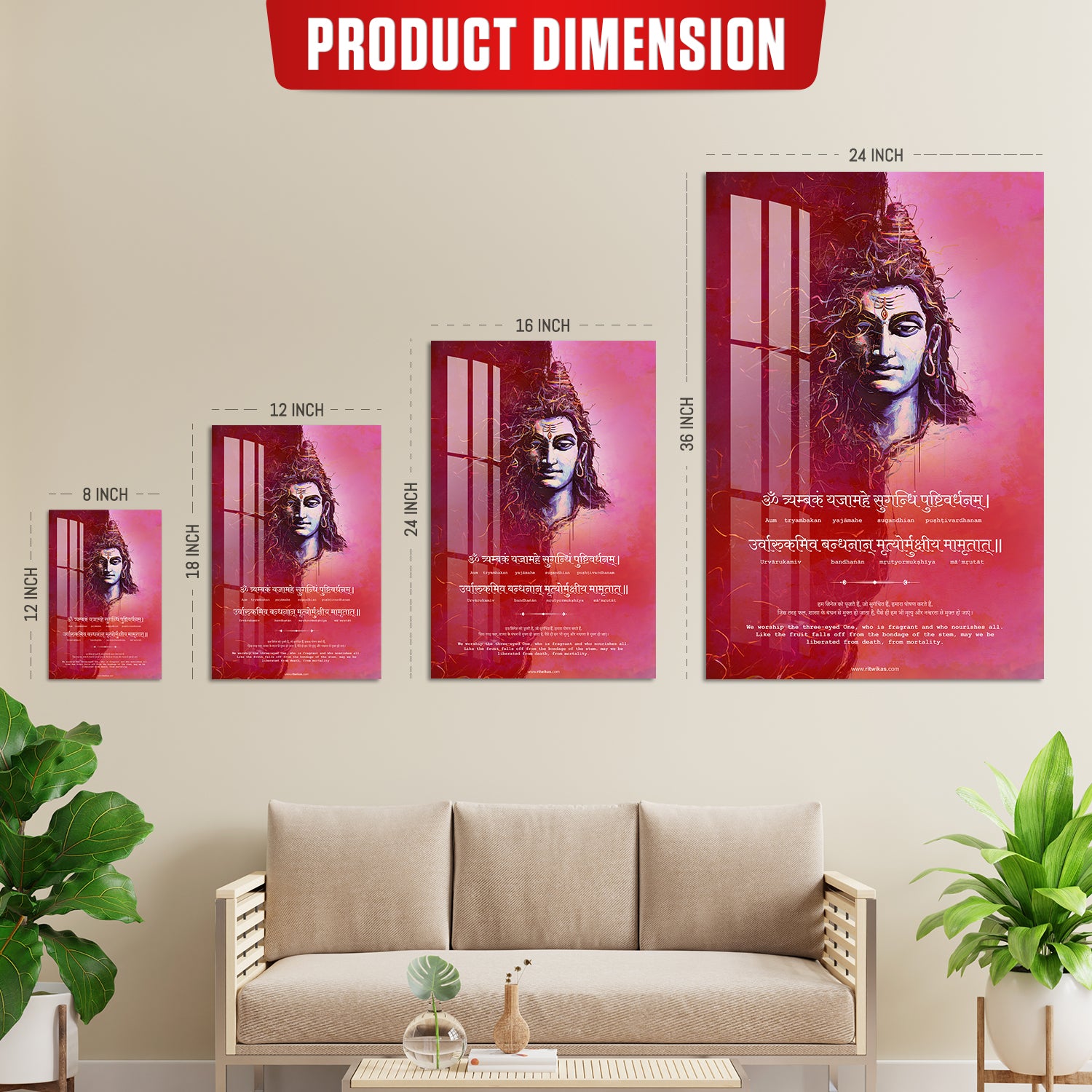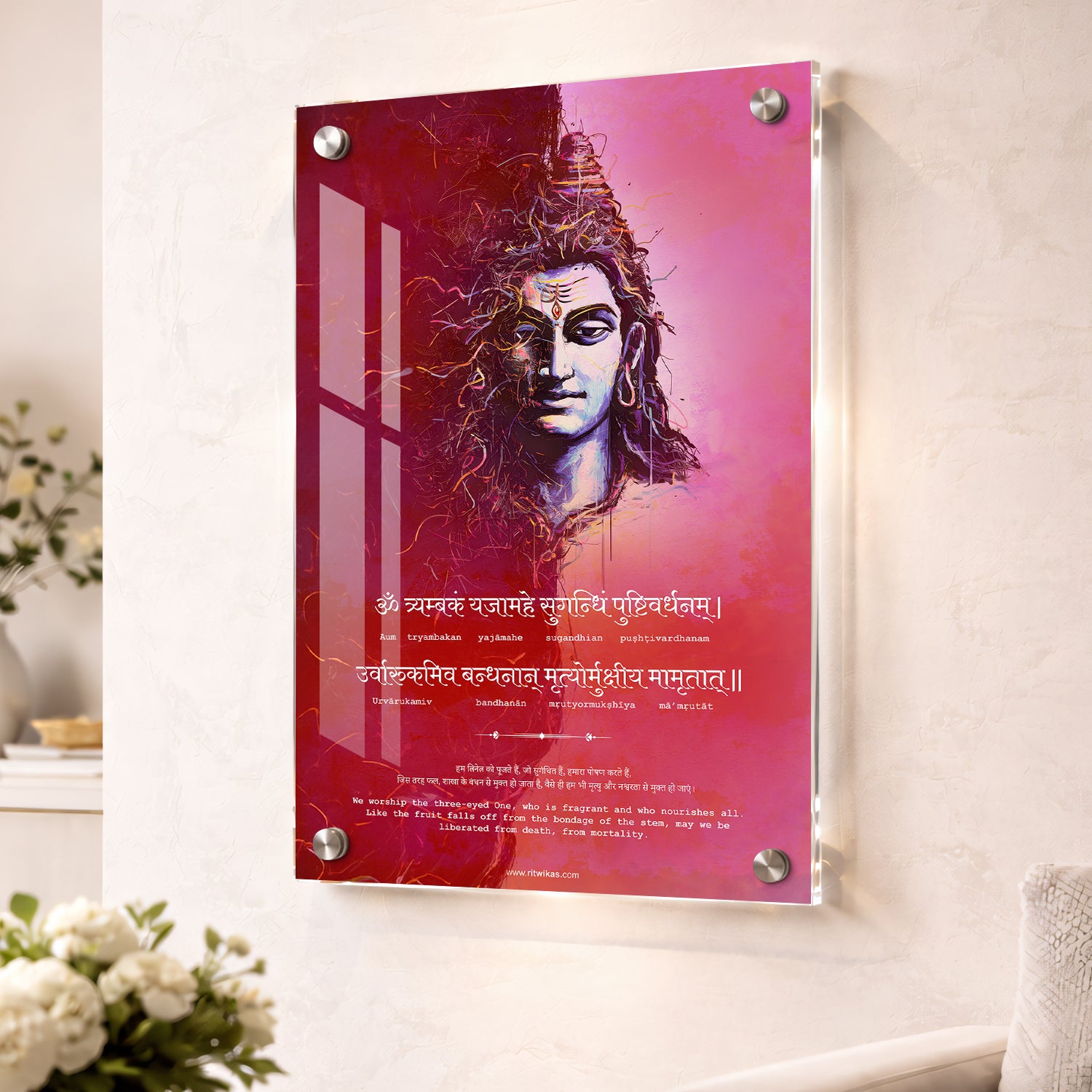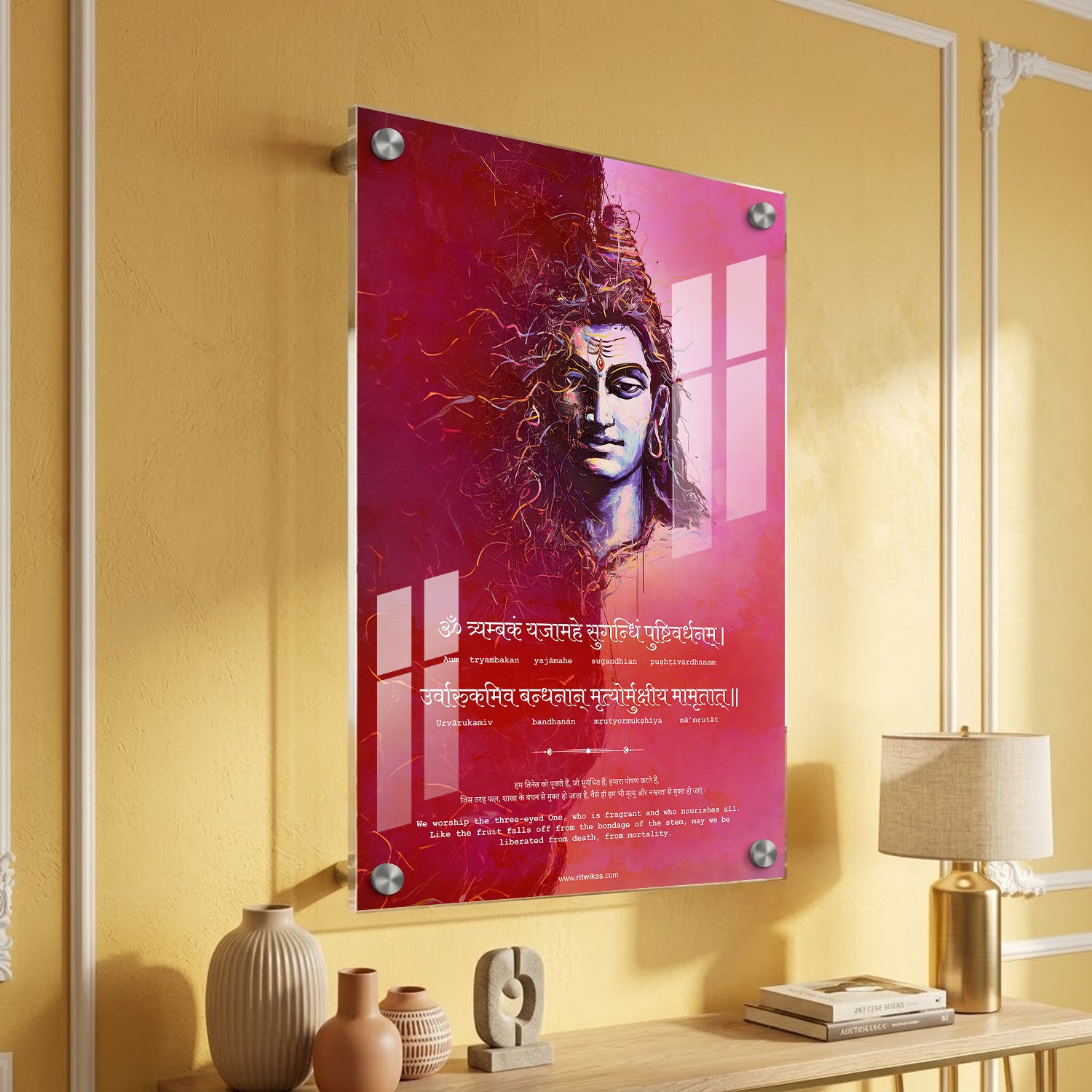 This acrylic print features the powerful Mahamrityunjaya Mantra, a sacred chant dedicated to Lord Shiva and often associated with protection, healing, and inner strength. The artwork presents a modern, expressive depiction of the three-eyed form of Shiva (Tryambakam), designed in rich pink and purple tones that give it a deep and calming presence. It’s a great choice for spaces where you want a sense of focus, positivity, and protection—like your home, meditation area, or yoga studio.