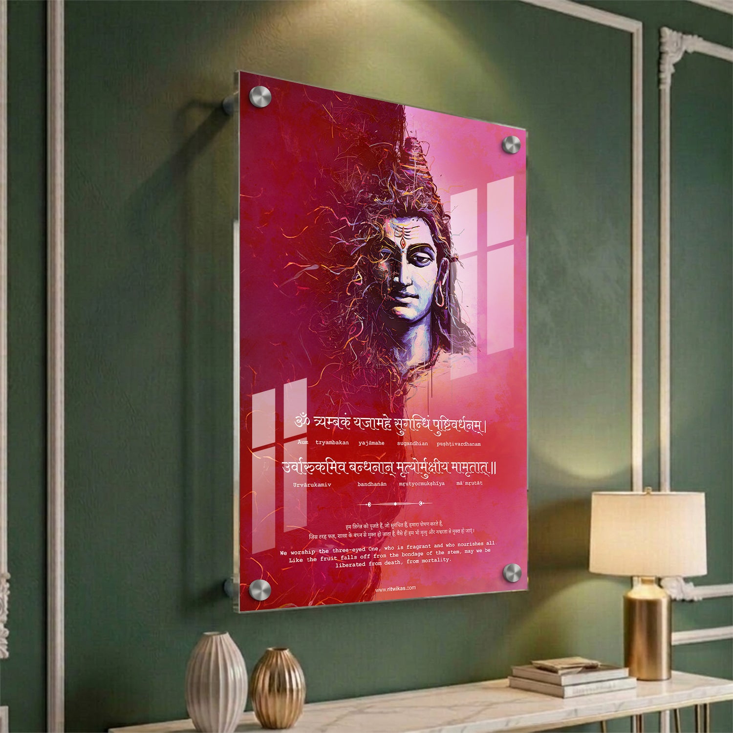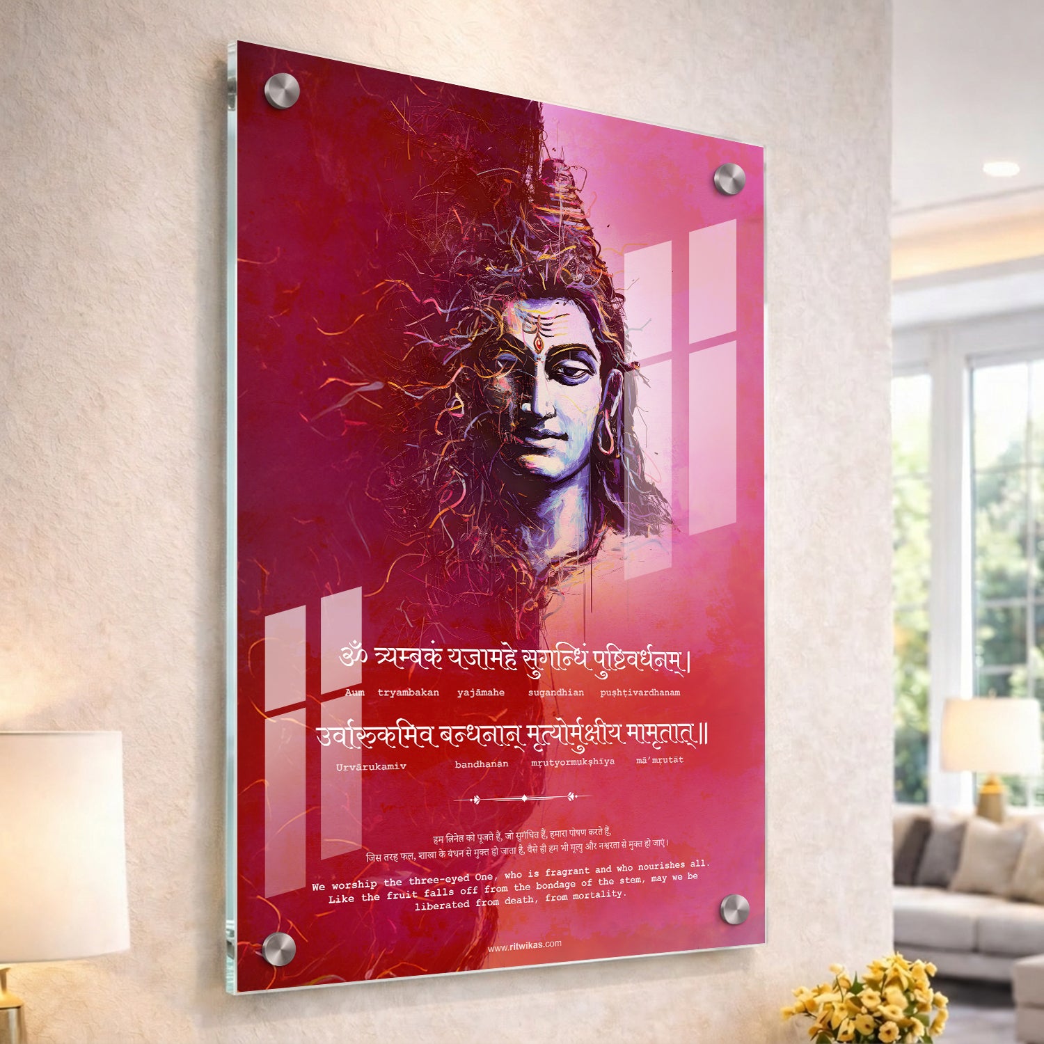 This acrylic print features the powerful Mahamrityunjaya Mantra, a sacred chant dedicated to Lord Shiva and often associated with protection, healing, and inner strength. The artwork presents a modern, expressive depiction...
