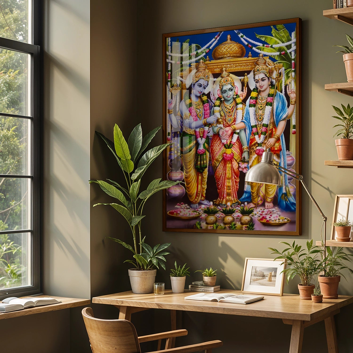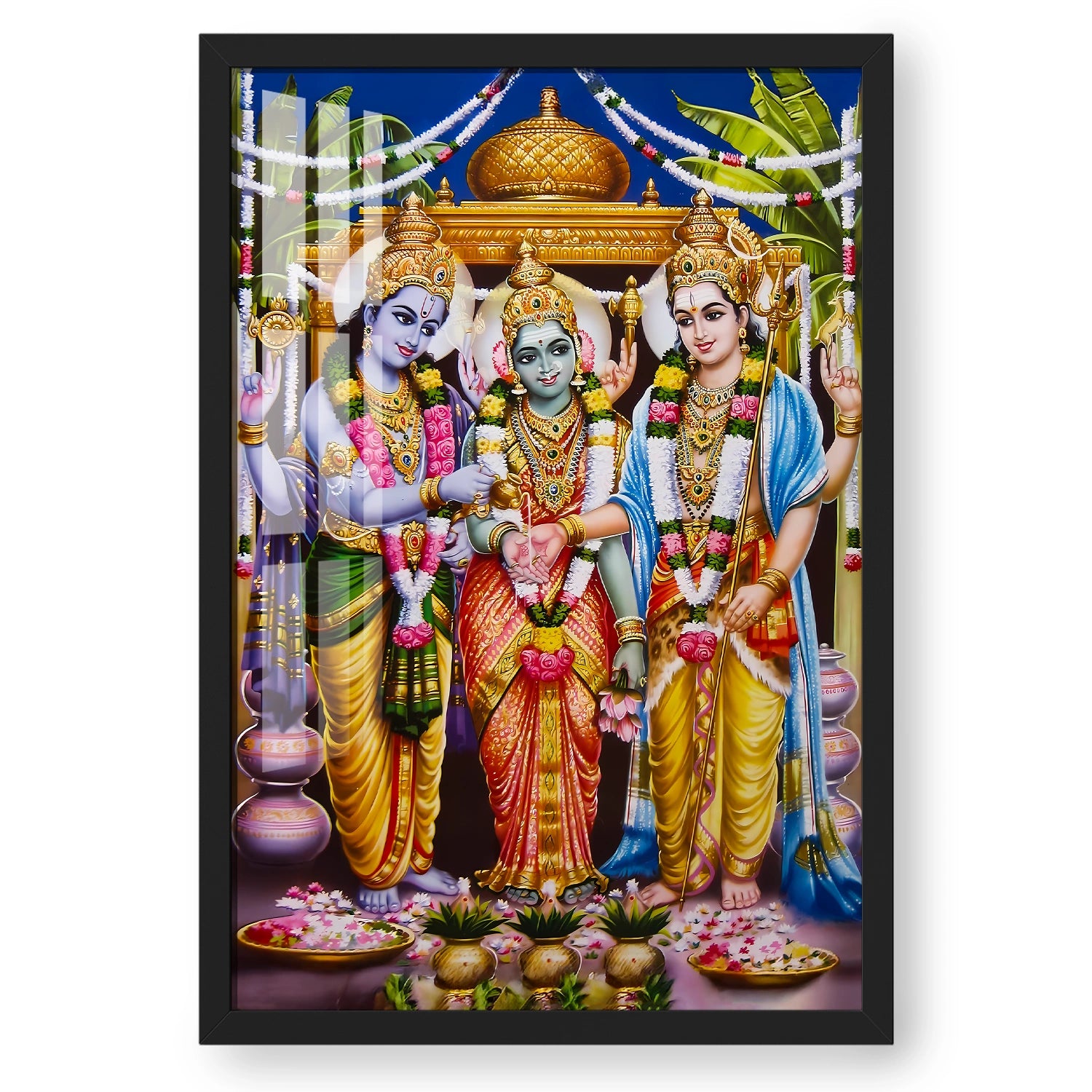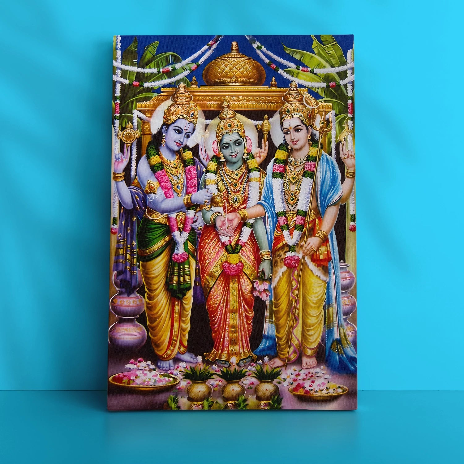 Celebrate the grandeur of divinity with this Meenakshi Kalyanam Wedding Artwork, a masterpiece that beautifully captures the sacred union of Goddess Meenakshi and Lord Sundareswarar. With its rich colors, detailed embellishments, and traditional motifs, this painting radiates auspiciousness and spiritual charm—perfect for creating a serene and blessed atmosphere at home or in your puja room.