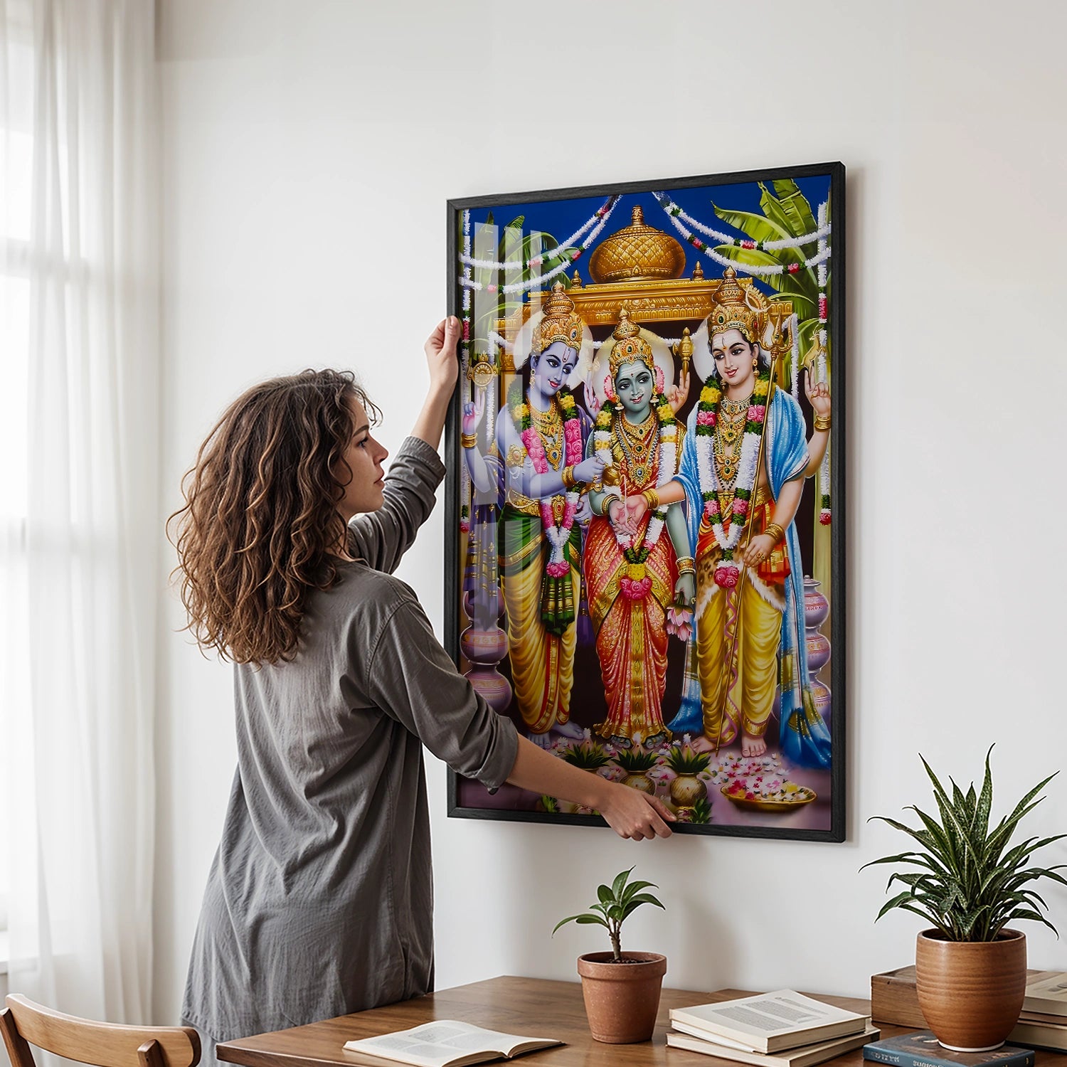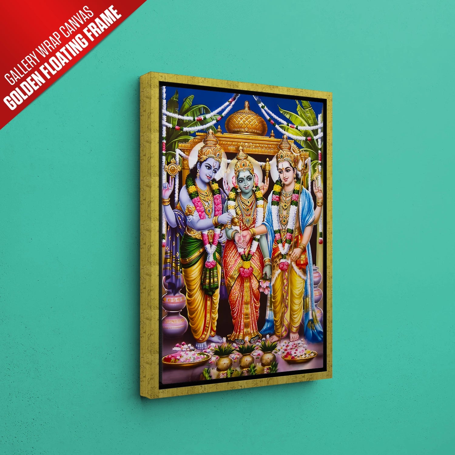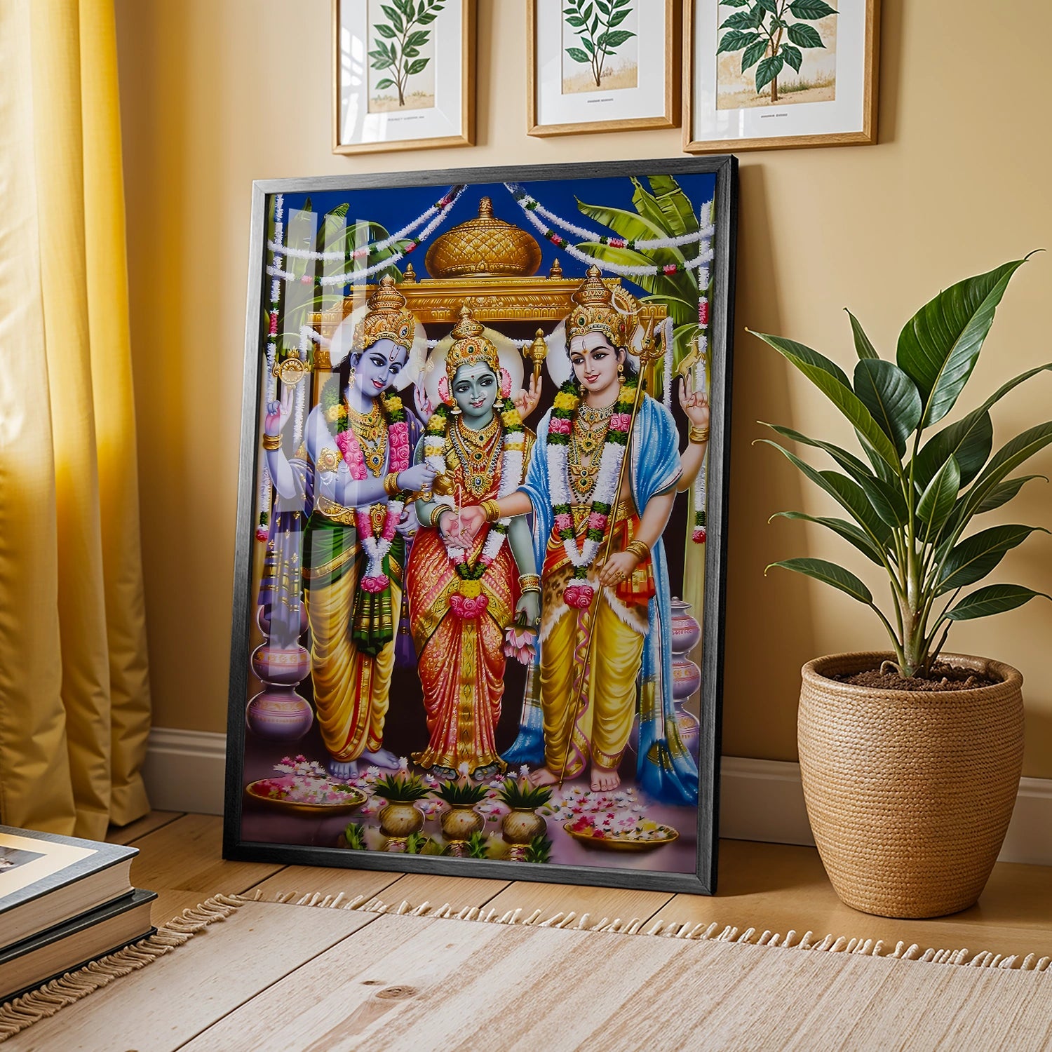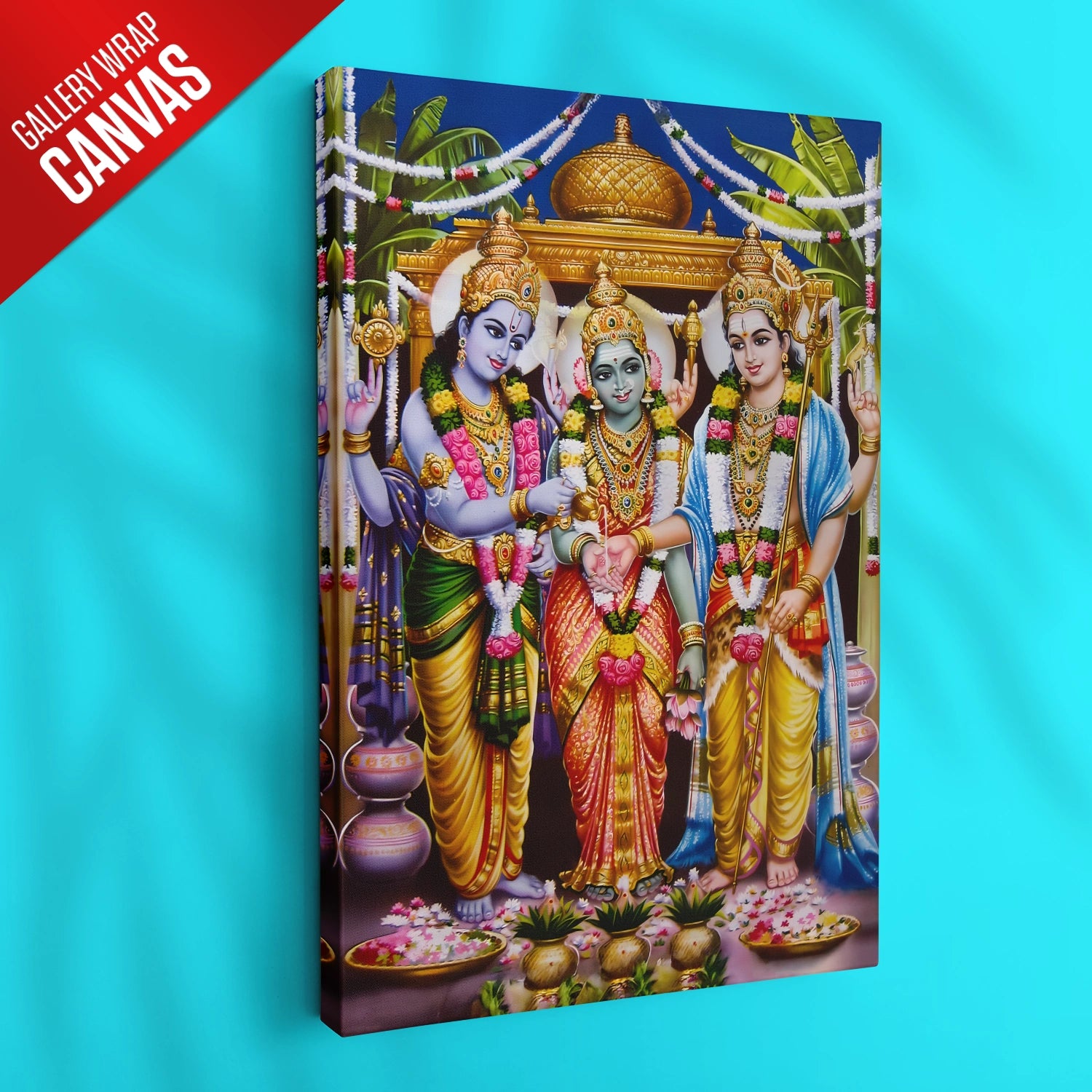 Celebrate the grandeur of divinity with this Meenakshi Kalyanam Wedding Artwork, a masterpiece that beautifully captures the sacred union of Goddess Meenakshi and Lord Sundareswarar. With its rich colors, detailed embellishments, and traditional motifs, this painting radiates auspiciousness and spiritual charm—perfect for creating a serene and blessed atmosphere at home or in your puja room.