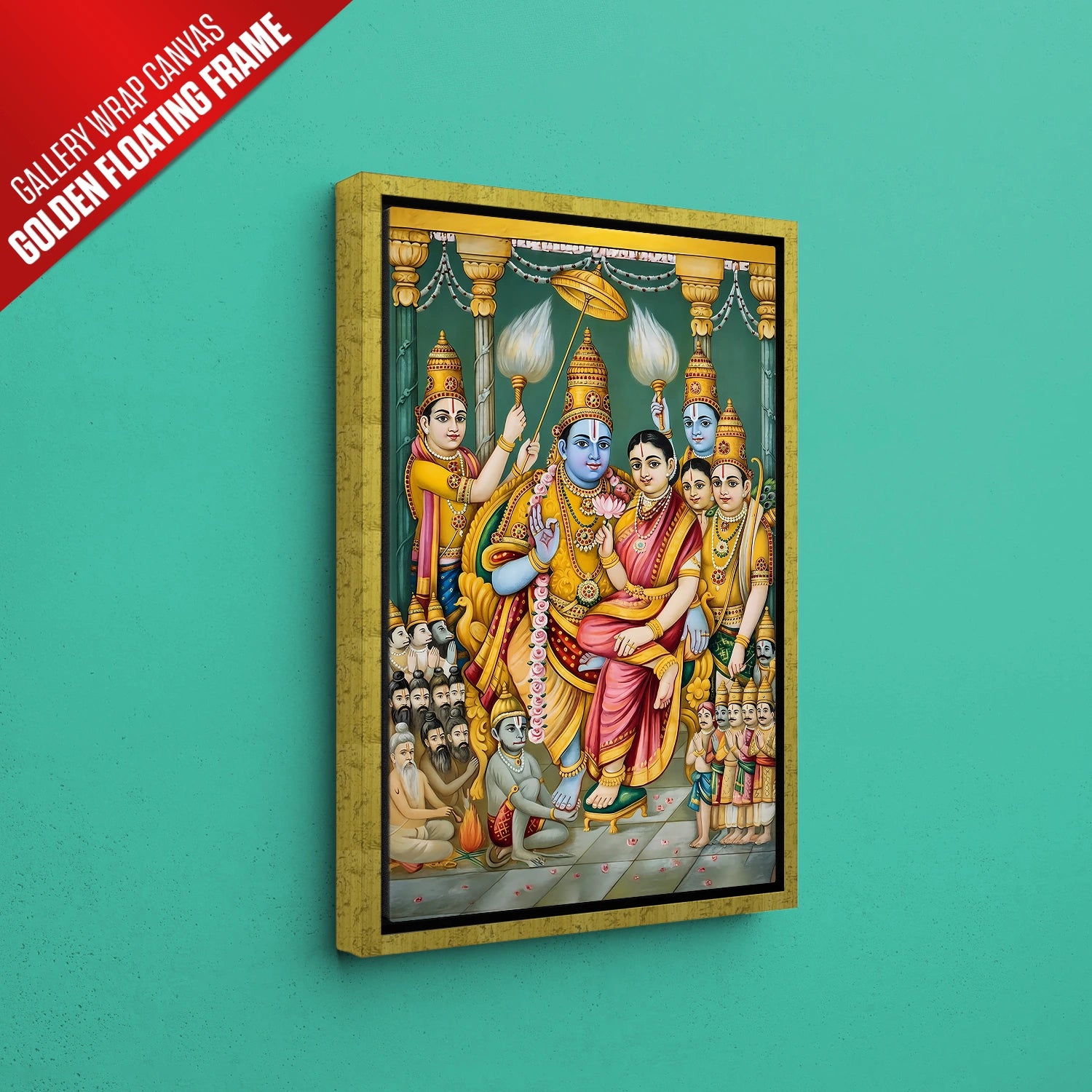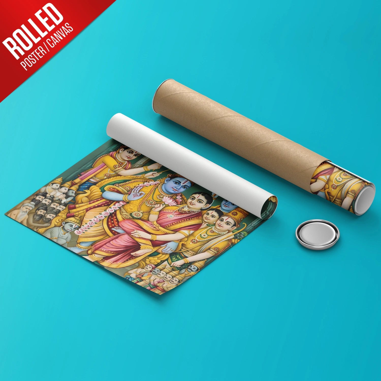 Bring home divine grace with Ram Sita Kalyanam Painting, a stunning South Indian–inspired artwork depicting Lord Ram and Maa Sita seated in royal splendor surrounded by their brothers and Hanuman Ji. This sacred piece radiates love, dharma, and devotion, filling your home with peace and prosperity. Perfect for gifting or spiritual décor, it’s available in poster print, framed, and gallery wrap canvas finishes.