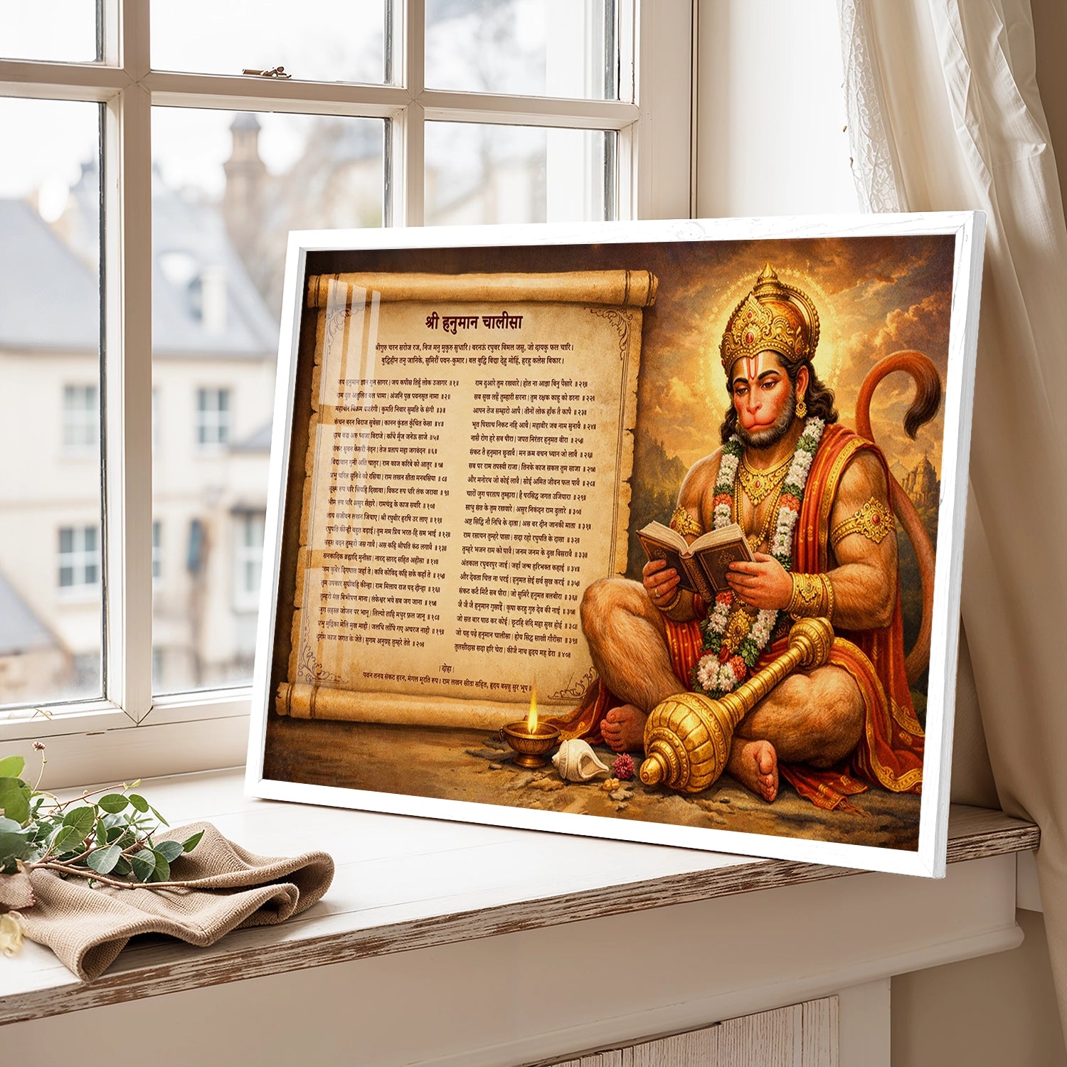 This artwork depicts Shri Hanuman Ji immersed in the recitation of the Hanuman Chalisa, symbolizing unwavering devotion, discipline, and inner strength. The detailed illustration, sacred text layout, and warm divine tones together create a visual representation of faith and focus. Inspired by traditional Indian religious art, this piece is designed to preserve spiritual authenticity while offering a refined, modern presentation suitable for contemporary homes.