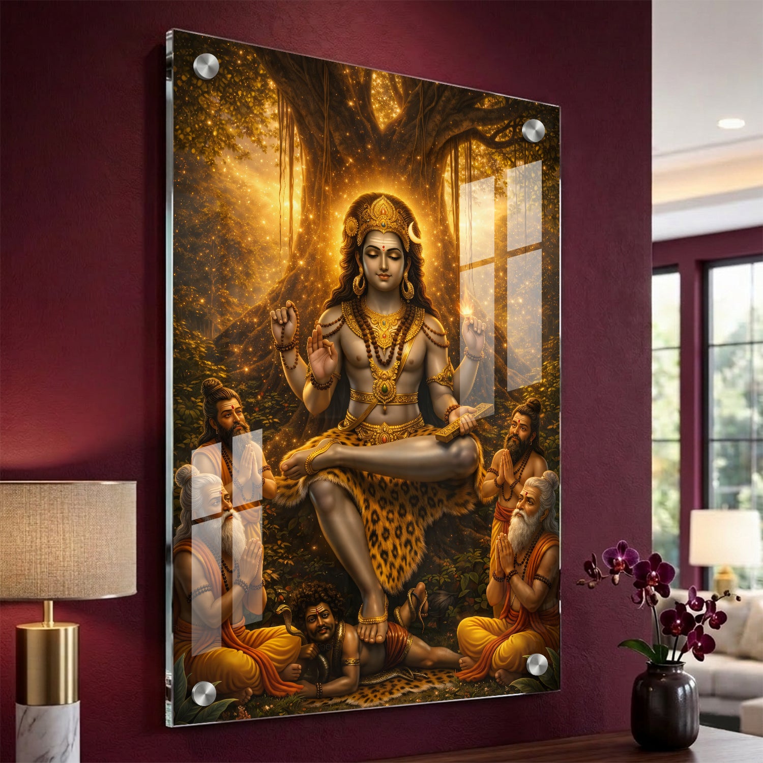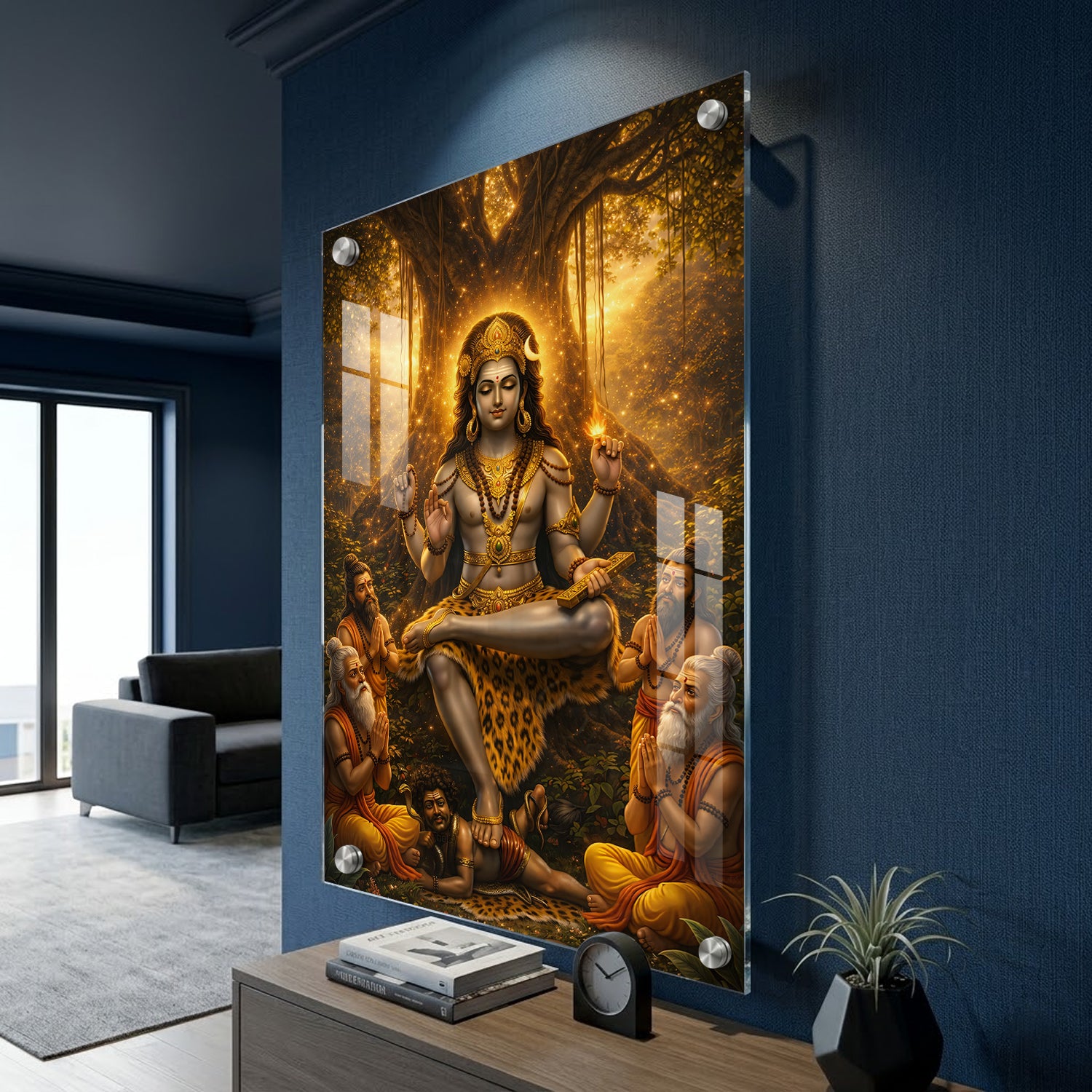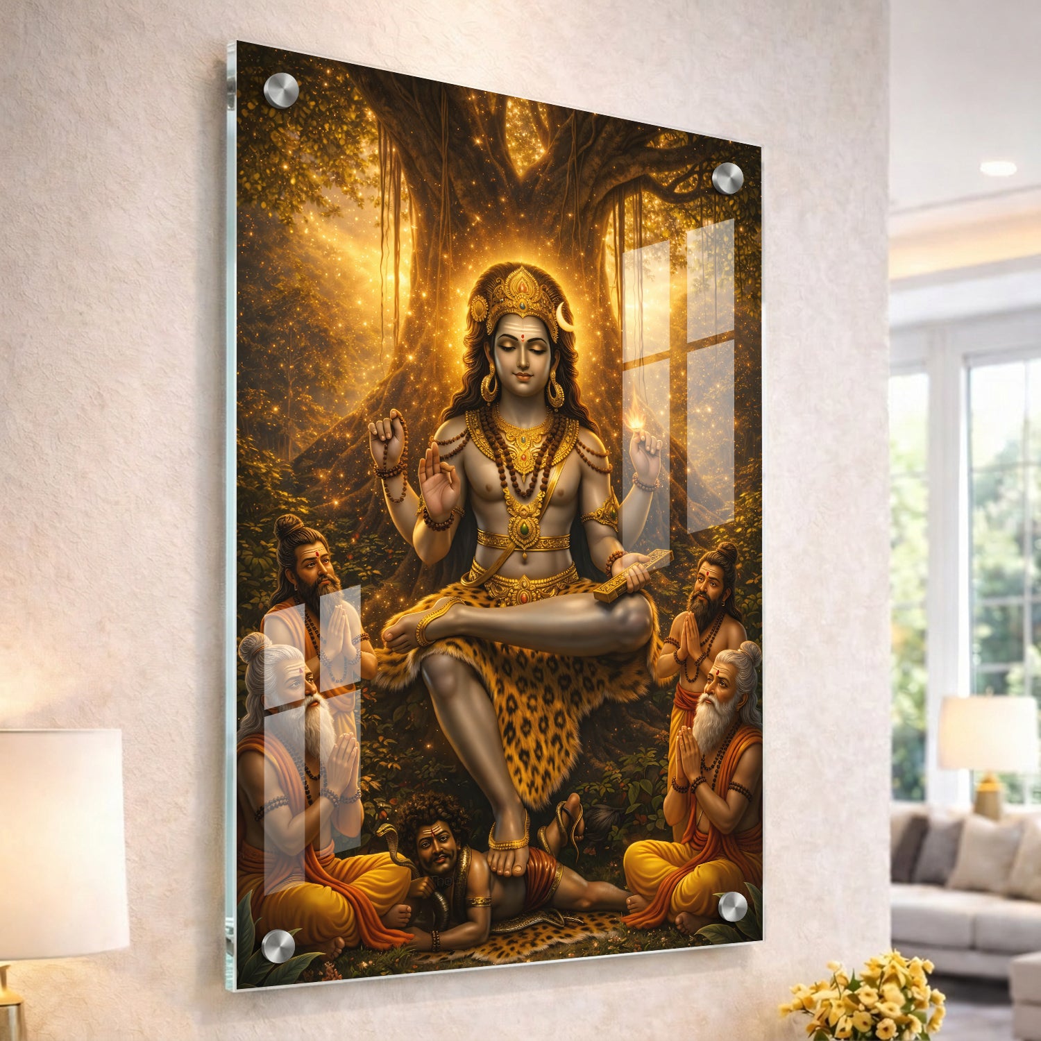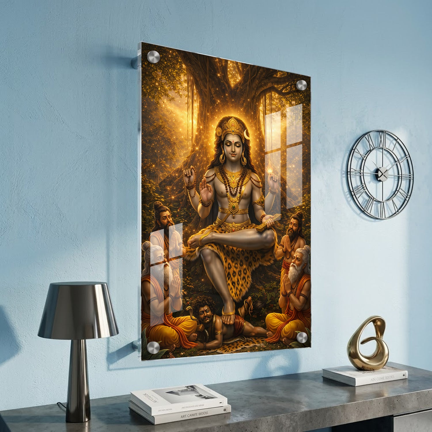 Golden Dakshinamurthy – Premium Acrylic Print is a visually striking artwork that presents Lord Shiva in his role as the supreme teacher. The design highlights a warm golden glow emerging from behind a banyan tree, giving the entire scene a luminous and focused look. Shiva is shown in a calm meditative posture, while sages sit near him, symbolizing the flow of knowledge and learning. The overall composition feels balanced and radiant, making it a strong choice for study areas, libraries, or pooja spaces where clarity and focus are important.