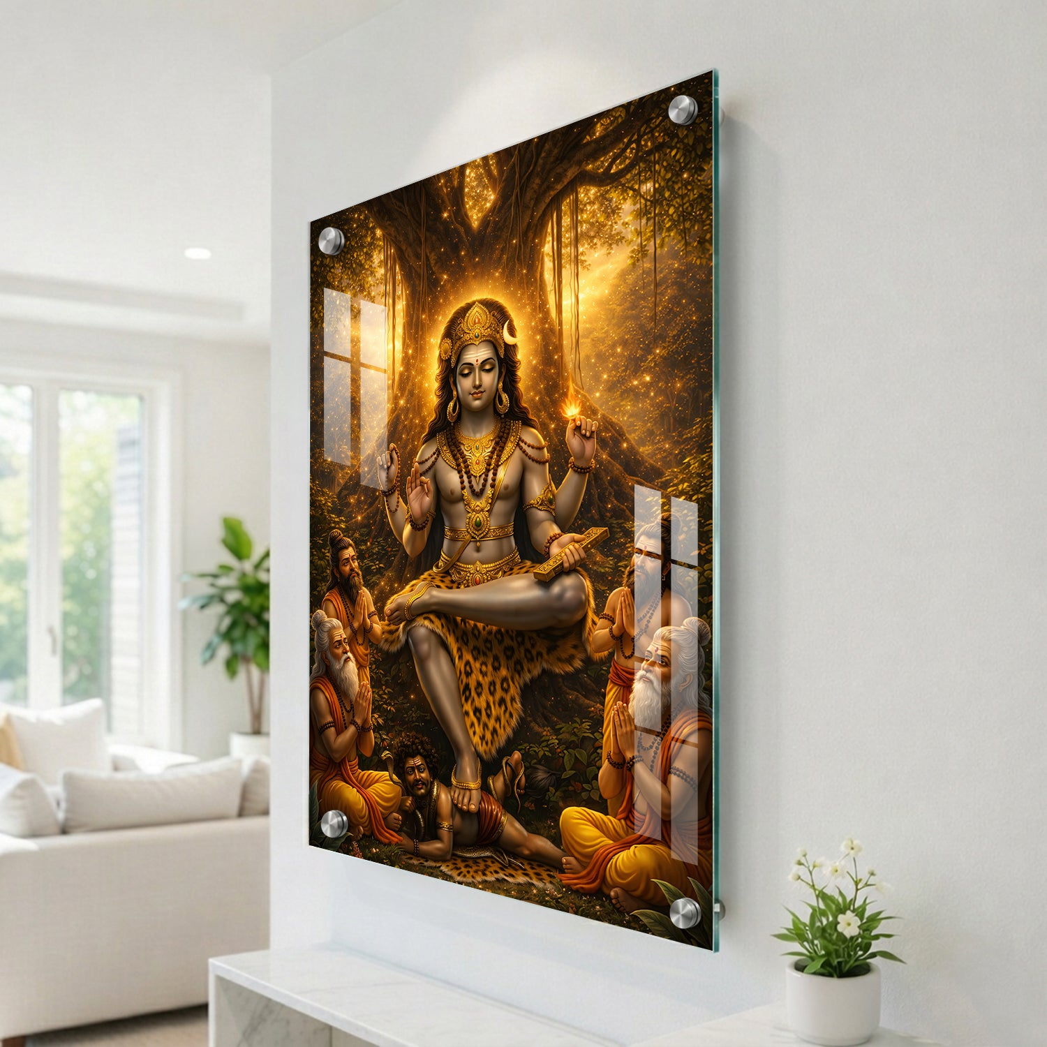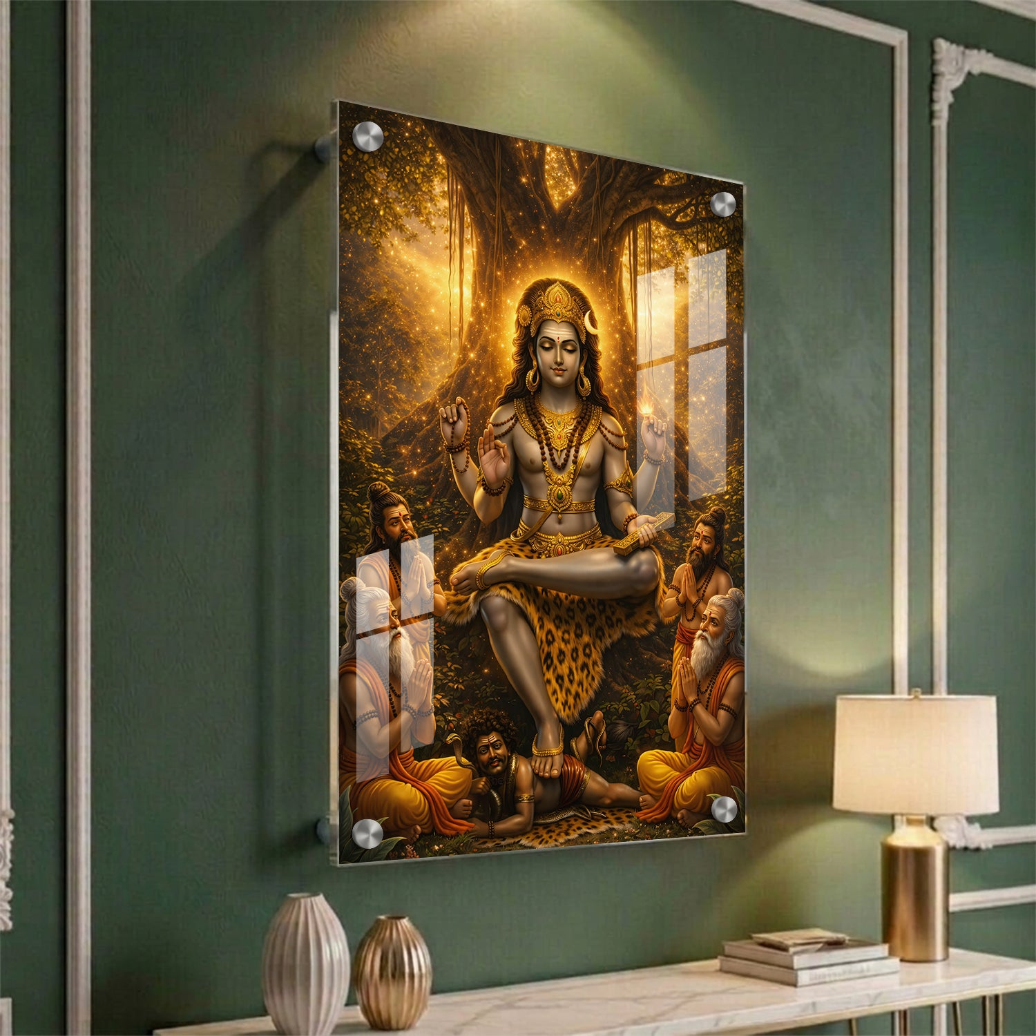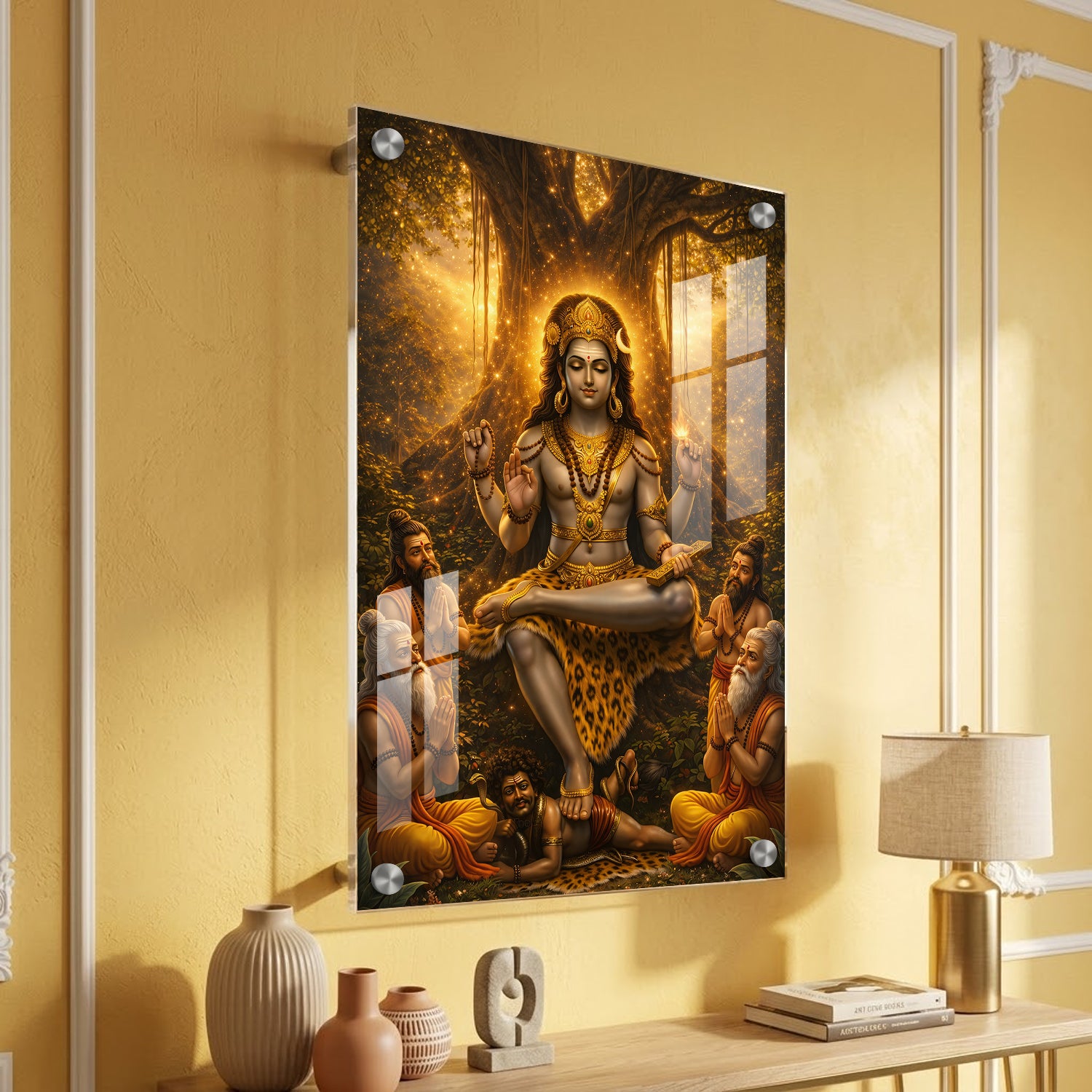 Golden Dakshinamurthy – Premium Acrylic Print is a visually striking artwork that presents Lord Shiva in his role as the supreme teacher. The design highlights a warm golden glow emerging from behind a banyan tree, giving the entire scene a luminous and focused look. Shiva is shown in a calm meditative posture, while sages sit near him, symbolizing the flow of knowledge and learning. The overall composition feels balanced and radiant, making it a strong choice for study areas, libraries, or pooja spaces where clarity and focus are important.