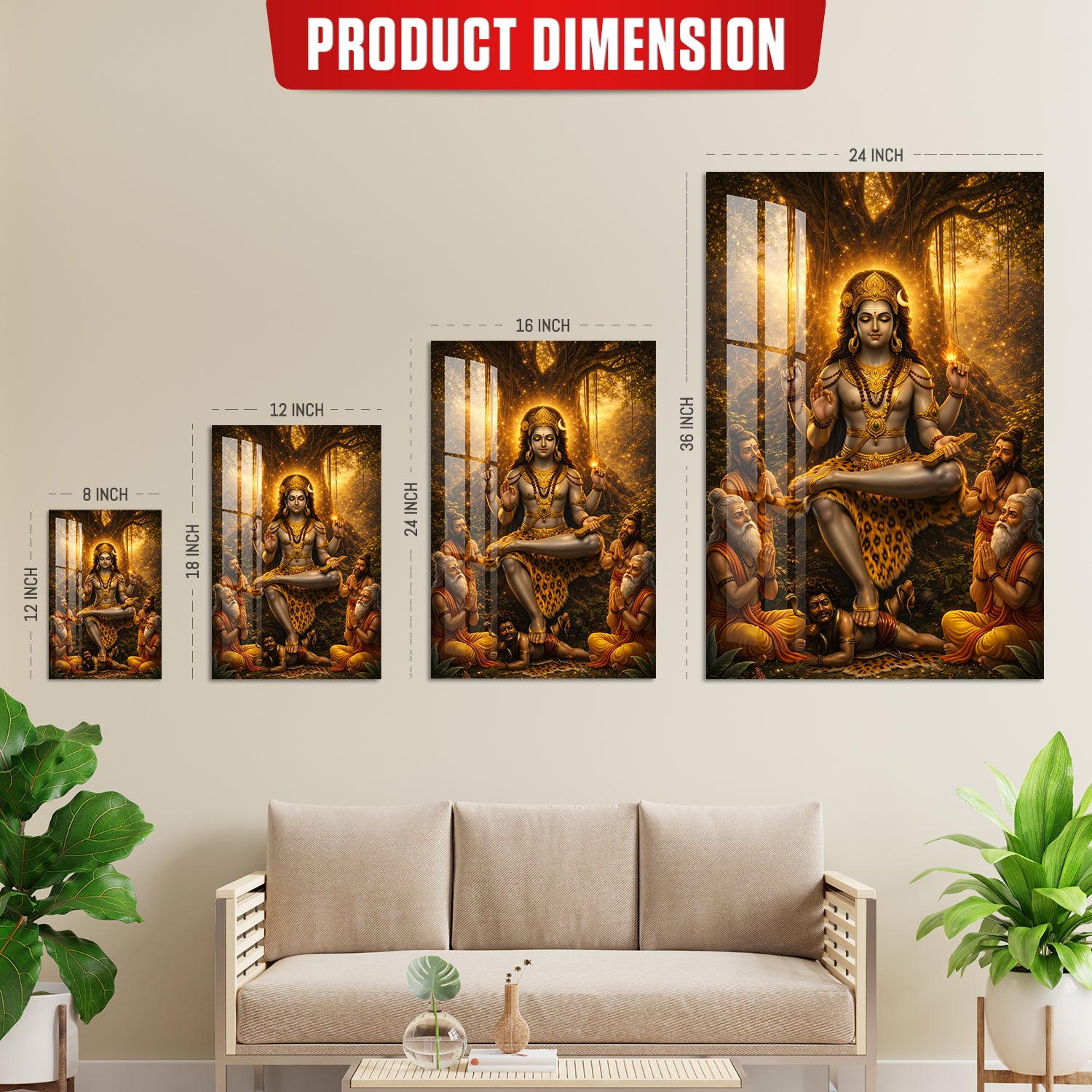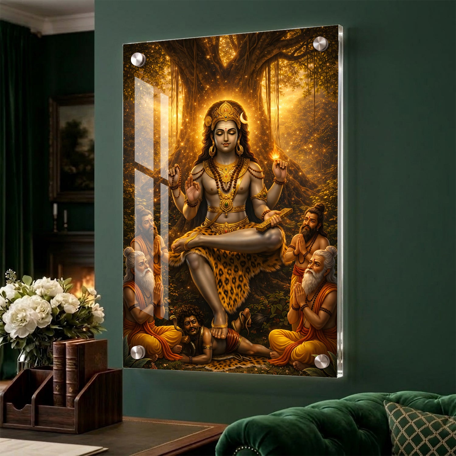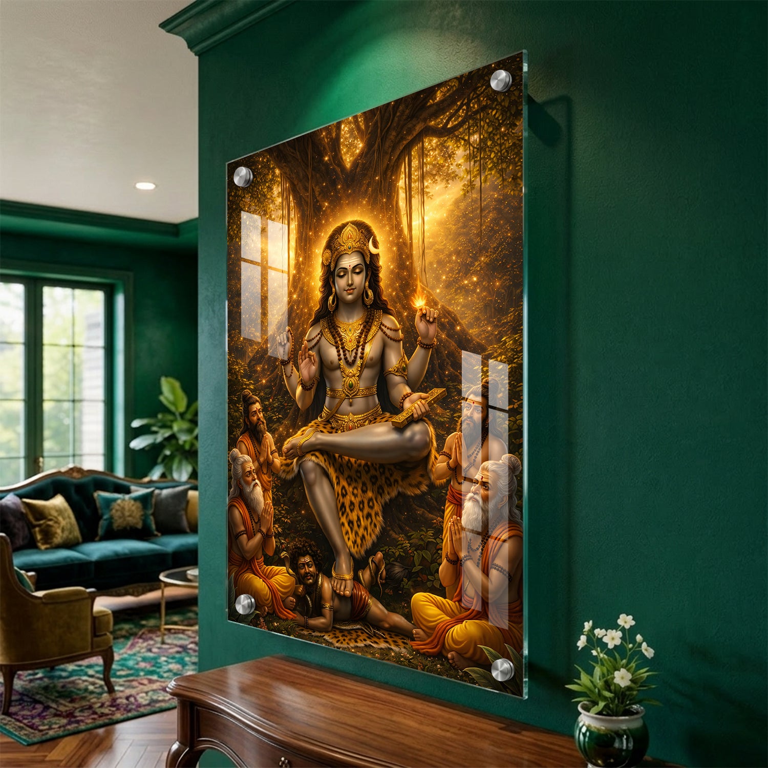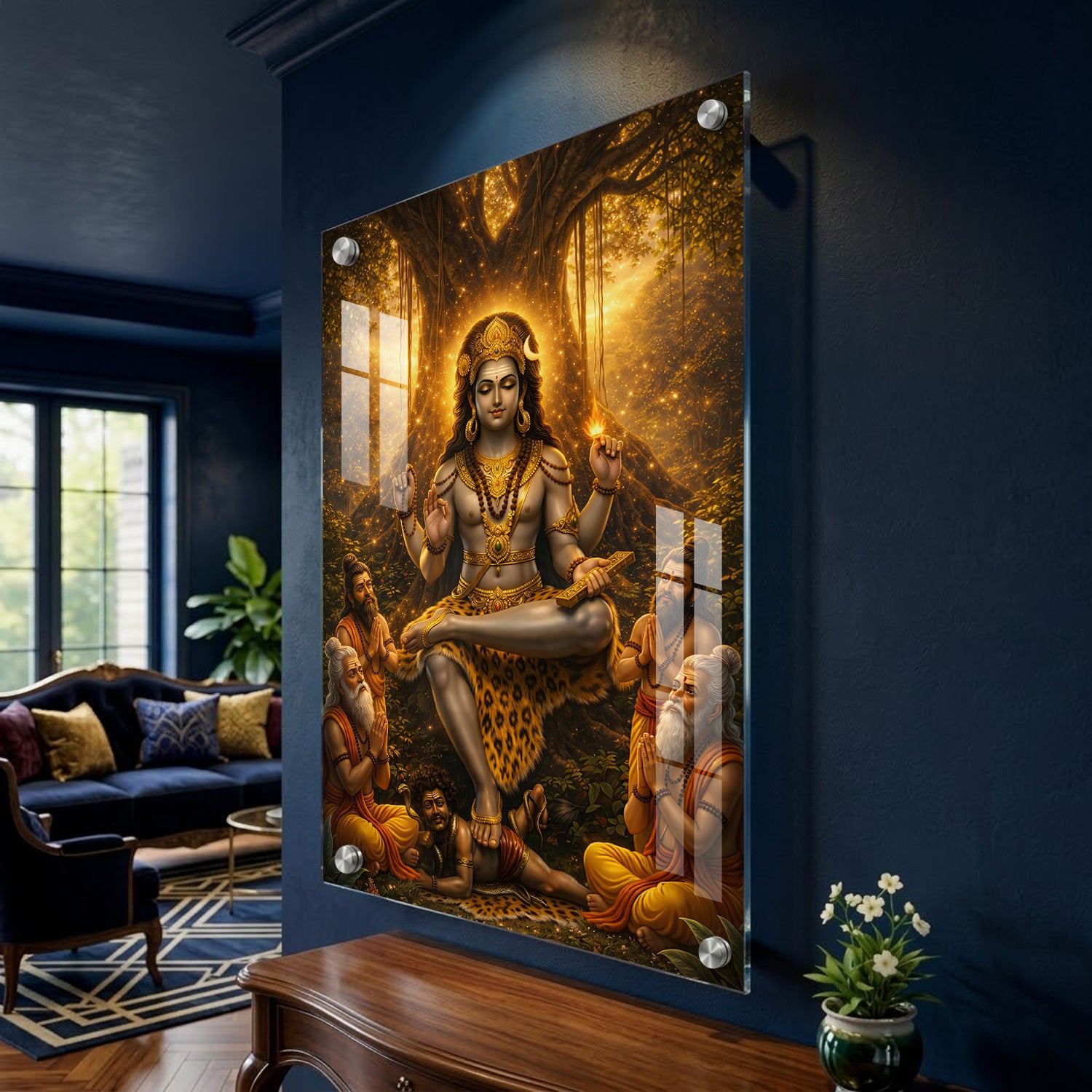 Golden Dakshinamurthy – Premium Acrylic Print is a visually striking artwork that presents Lord Shiva in his role as the supreme teacher. The design highlights a warm golden glow emerging from behind a banyan tree, giving the entire scene a luminous and focused look. Shiva is shown in a calm meditative posture, while sages sit near him, symbolizing the flow of knowledge and learning. The overall composition feels balanced and radiant, making it a strong choice for study areas, libraries, or pooja spaces where clarity and focus are important.