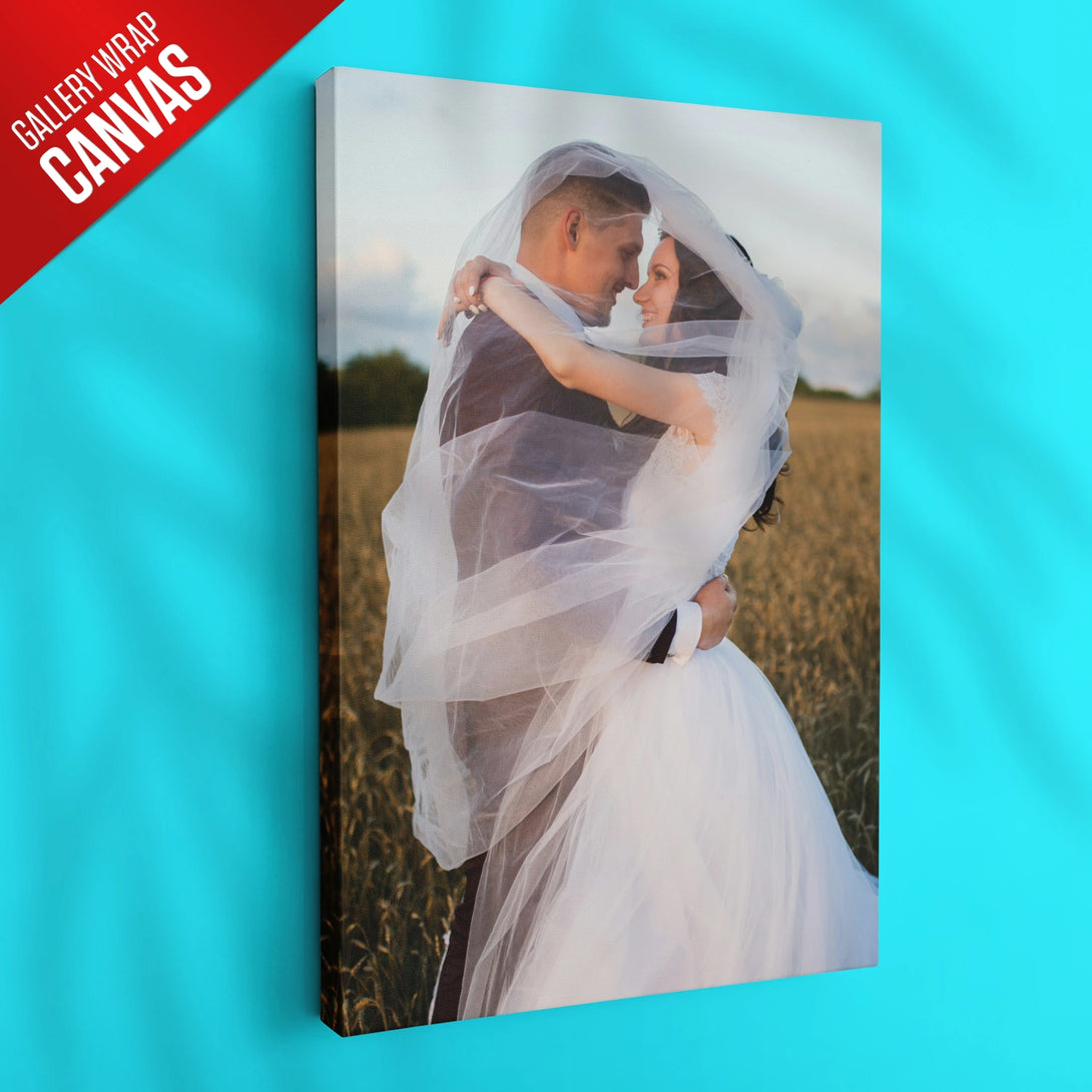 A frameless artwork style where your photo is printed on canvas and stretched over a wooden case.