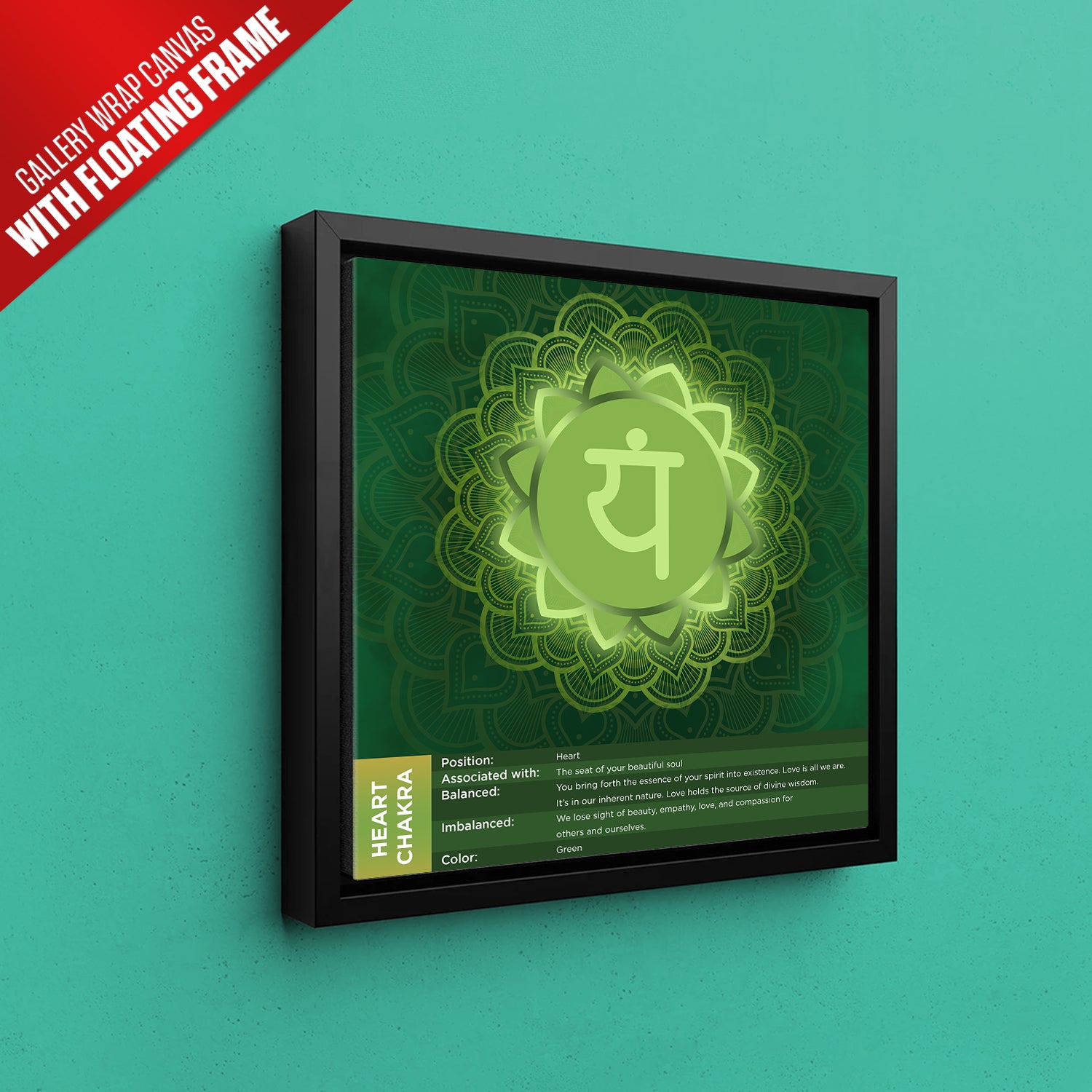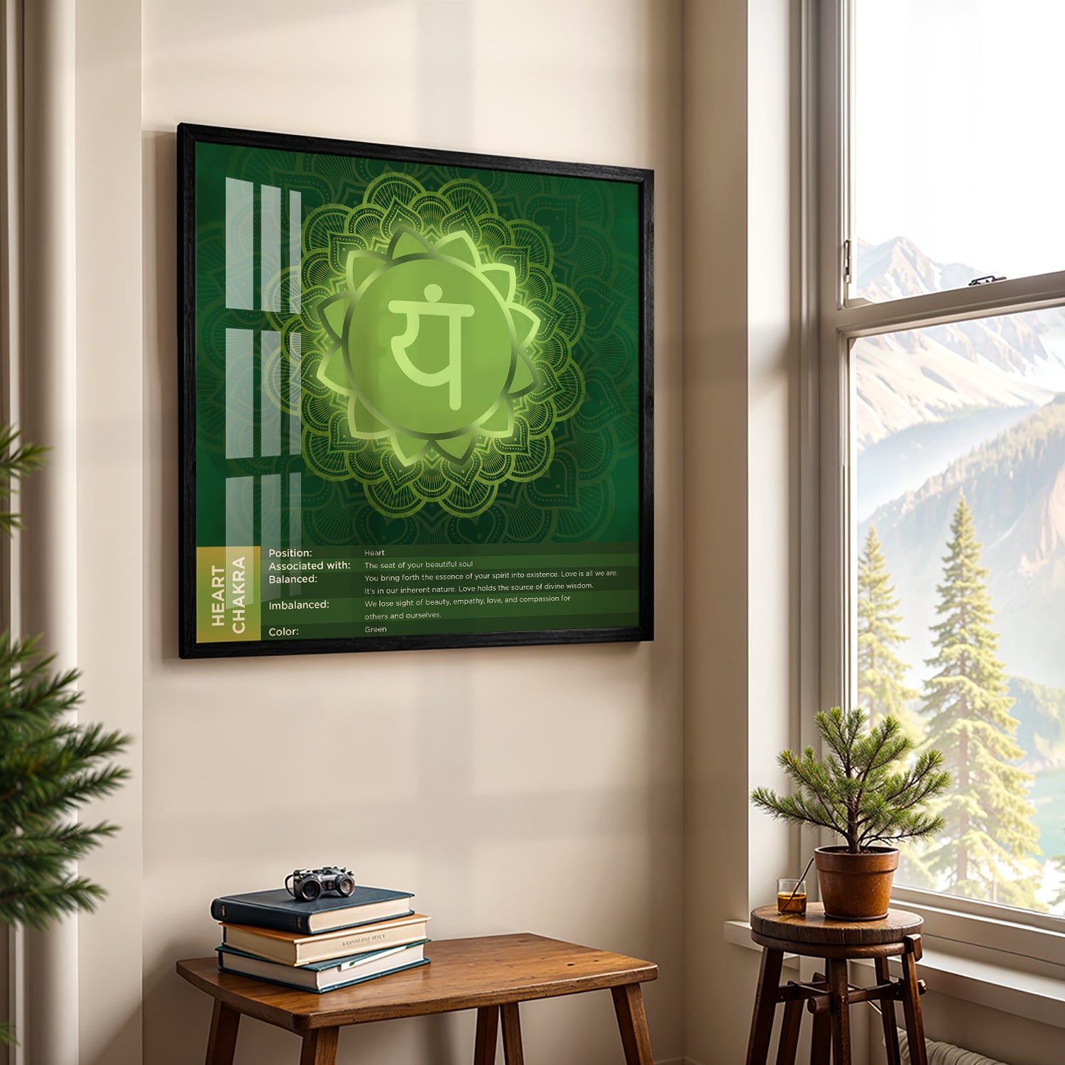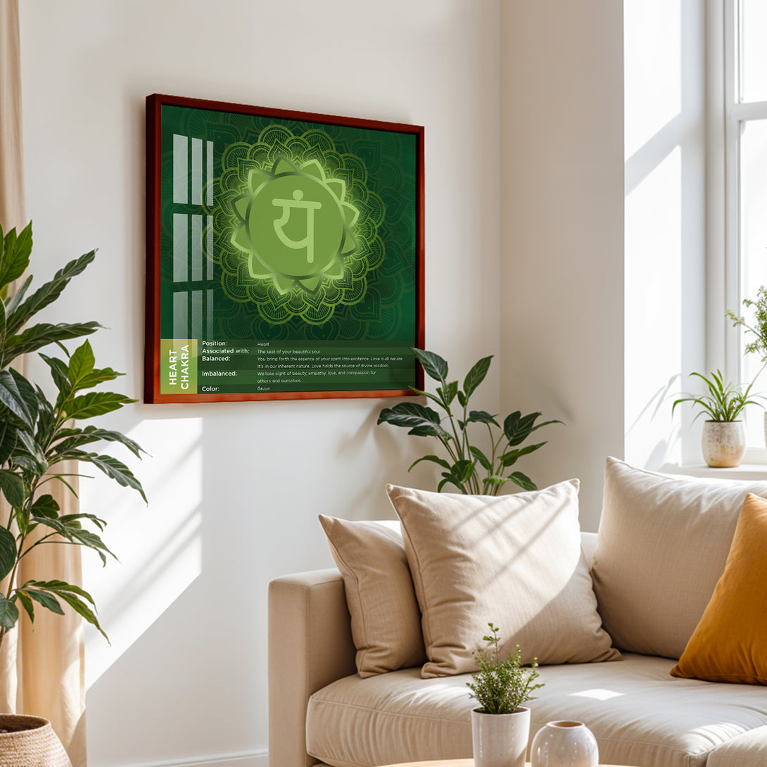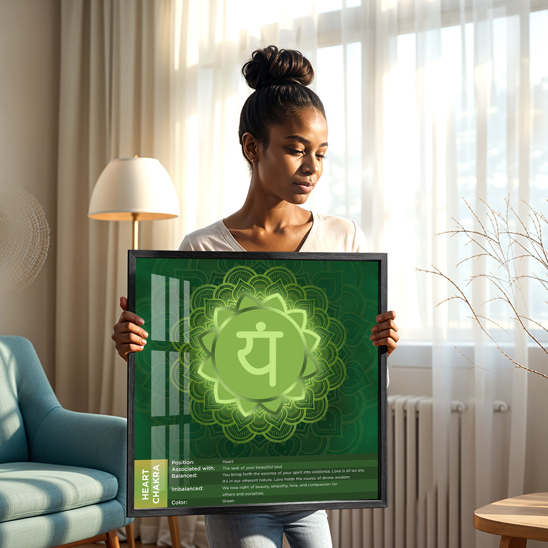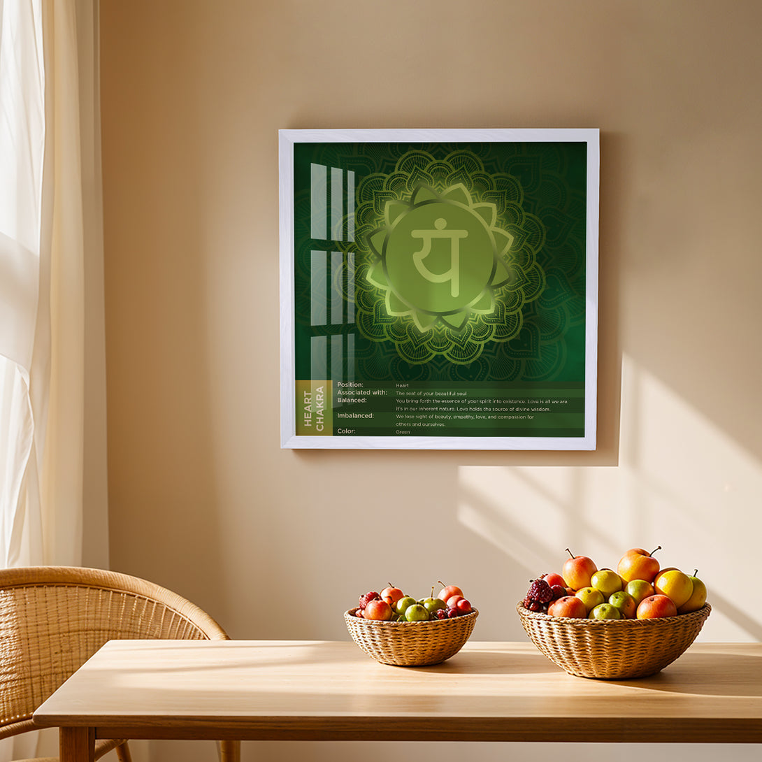 Featuring the Heart Chakra (Anahata) mandala with the YAM beej mantra, this artwork is designed in soothing green hues that radiate balance and harmony. Perfect for creating a calming atmosphere, it works beautifully in meditation spaces, living rooms, or as a meaningful gift. Available in framed, canvas, and poster formats, it combines elegance with meditative symbolism.