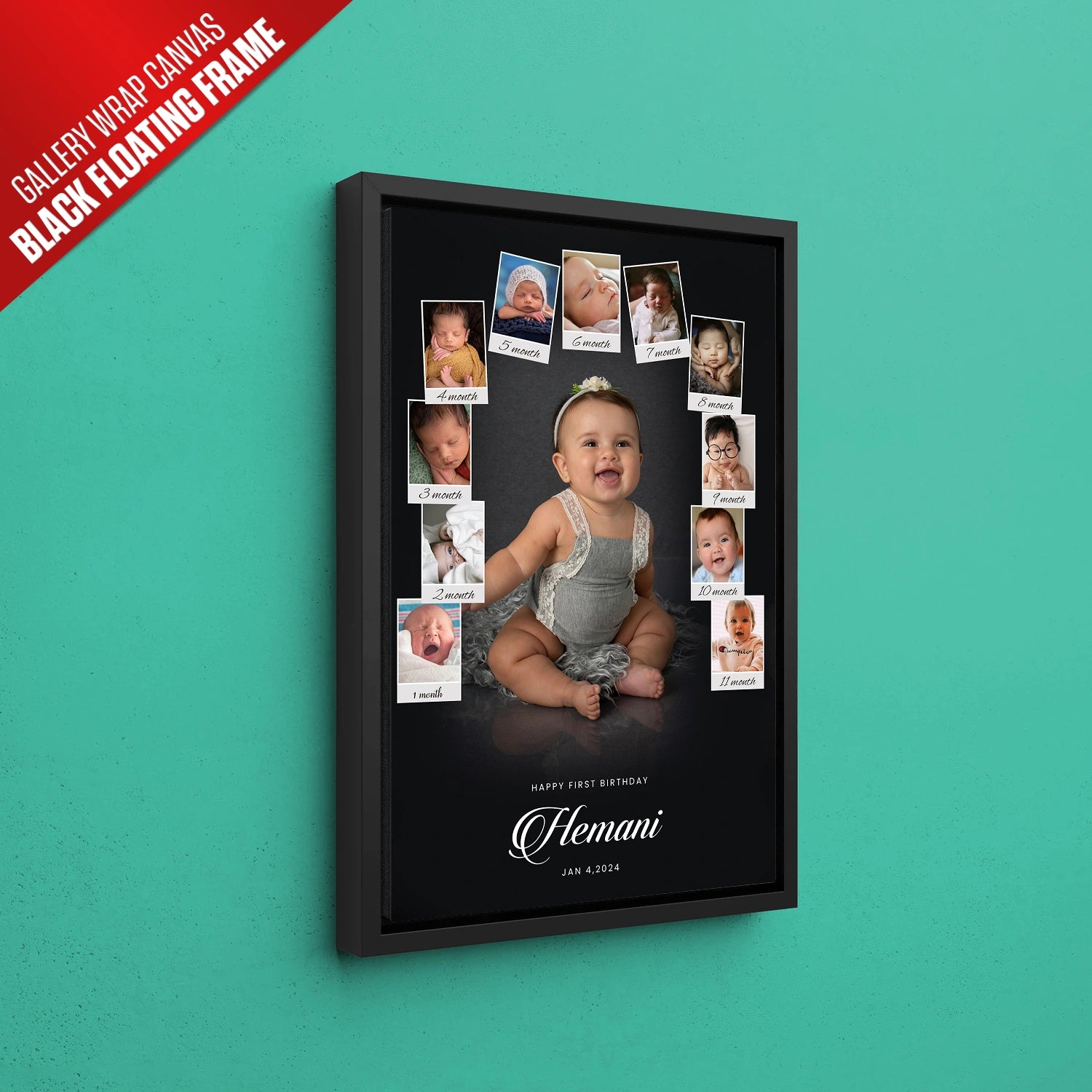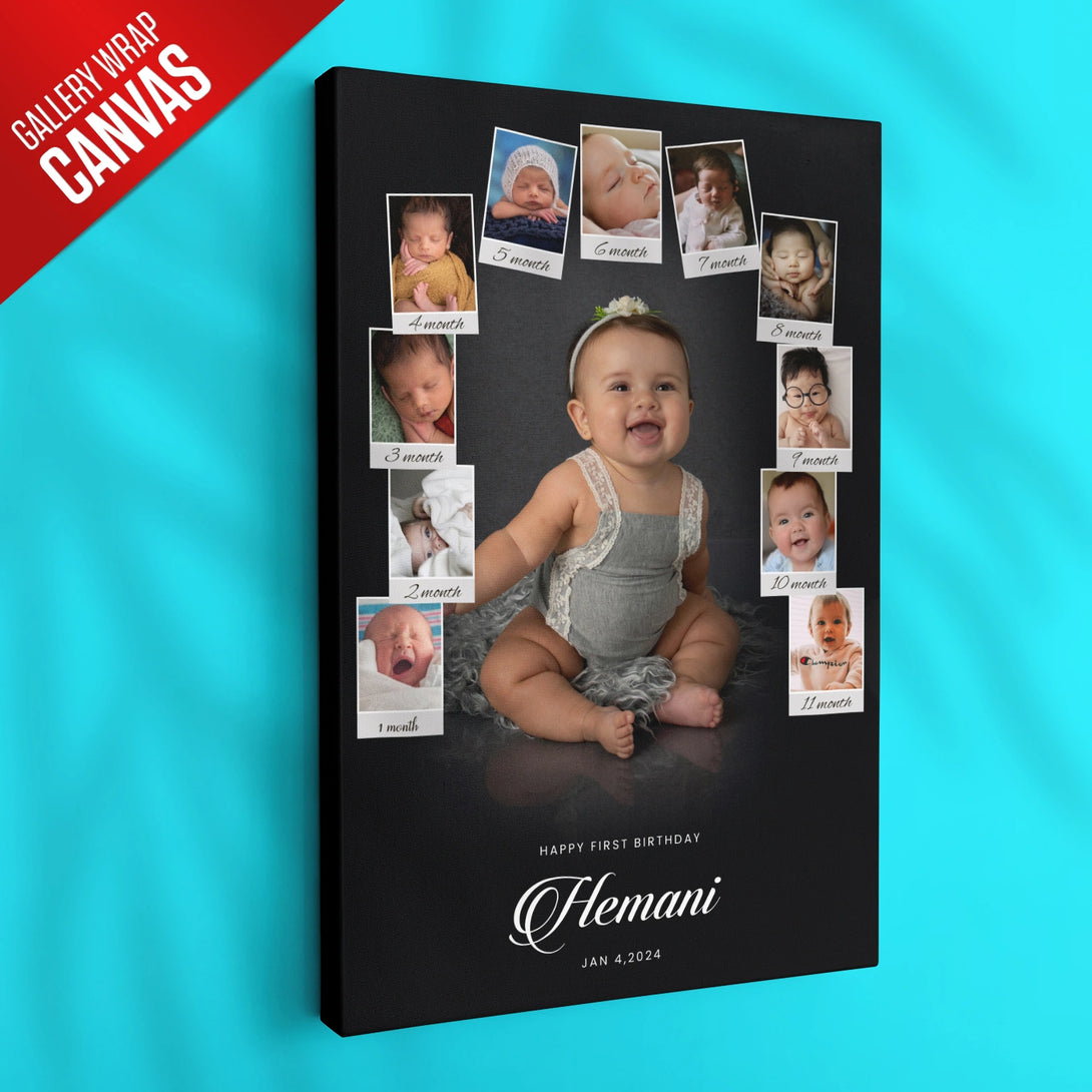 Celebrate every month of your baby’s incredible first year with our 12-Month Baby Milestone Collage! This beautiful artwork allows you to showcase a favorite photo from each month, documenting how your little one has grown and changed over their first 12 months. The collage design features a large central image of your baby at their latest milestone, surrounded by 11 smaller monthly photos, creating a heartwarming journey from newborn to 1 year old.