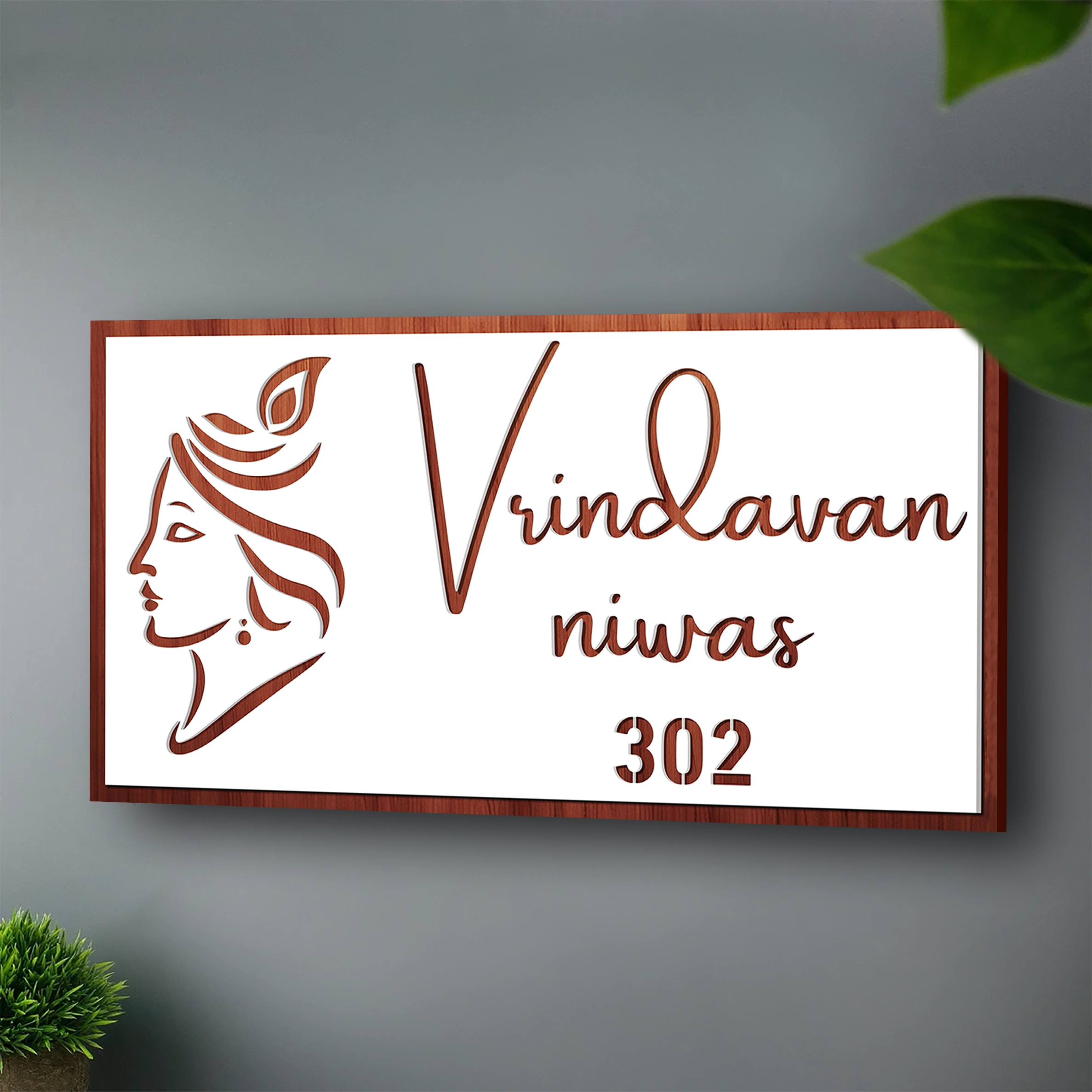 This engraved wooden name plate features a beautifully crafted artwork inspired by the serene profile of Lord Krishna. The smooth outline, flowing hair detail, and peacock-feather element create a peaceful and divine aesthetic. Set on a crisp white base with wooden engraving, the design blends spirituality with modern elegance, making it a standout décor piece for your home entrance.