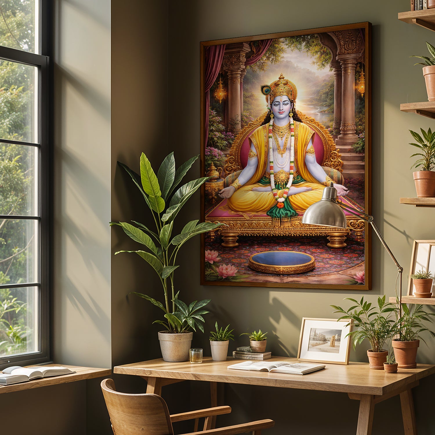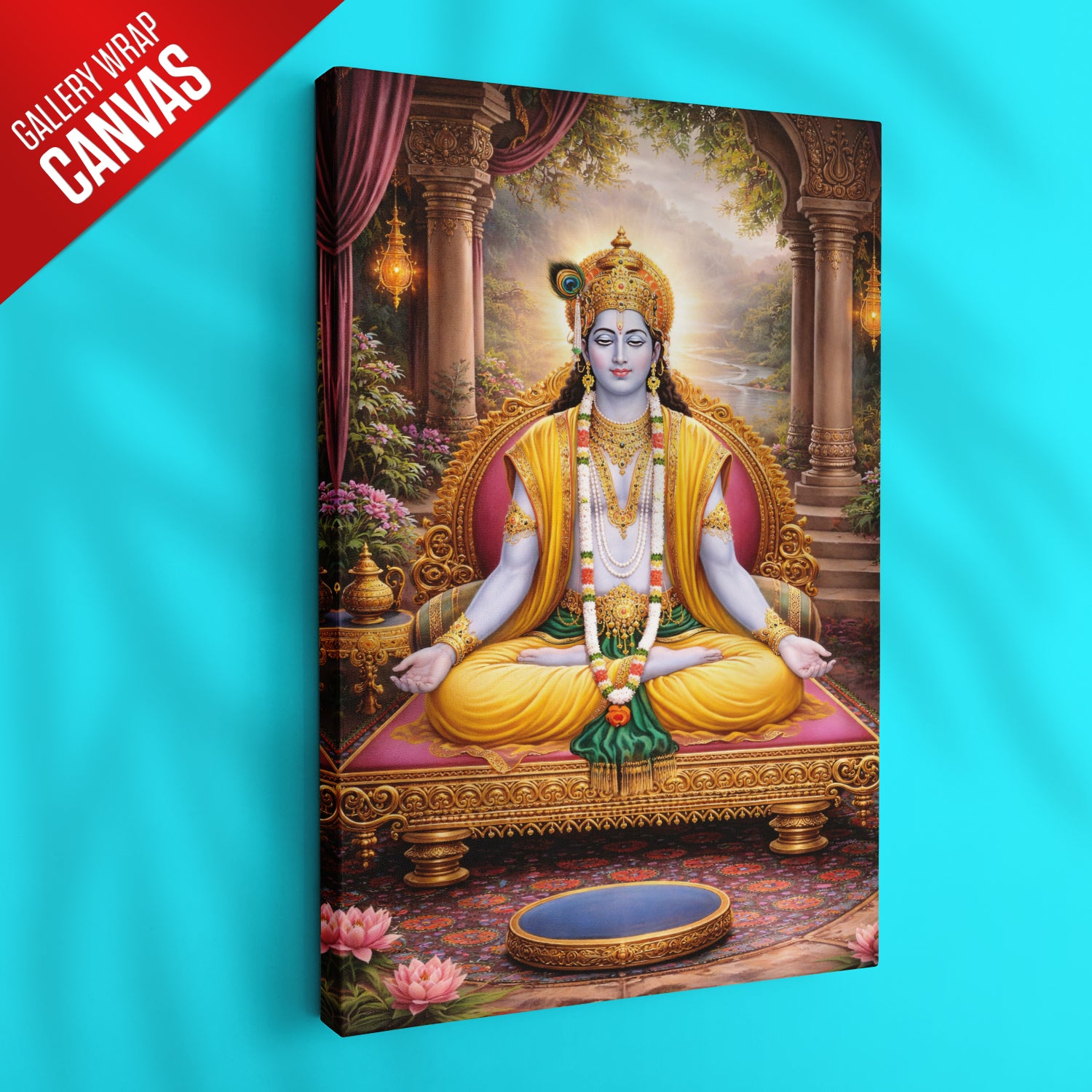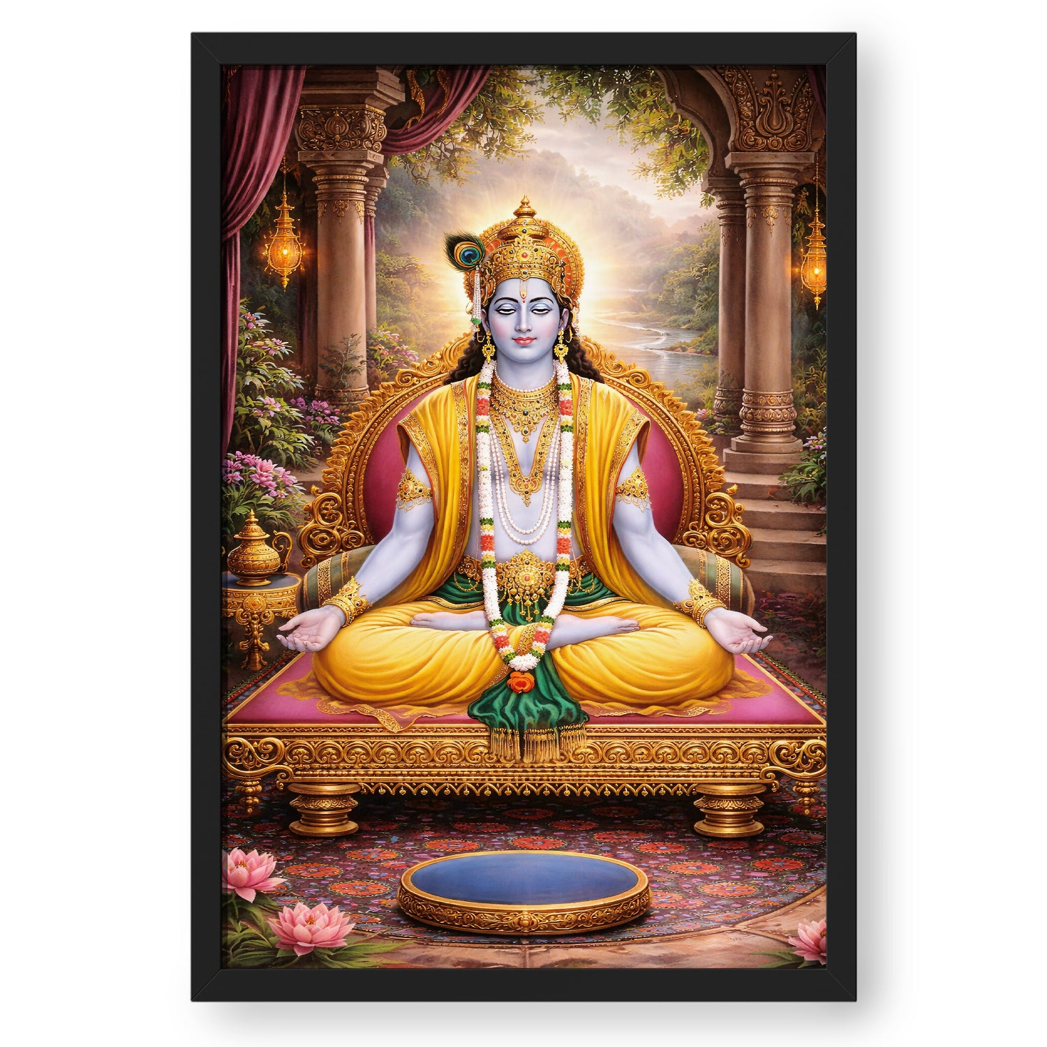 Bring home a feeling of peace and positivity with this beautiful Lord Krishna Meditation Wall Art. This artwork shows Krishna in a calm, meditative posture, symbolizing balance, wisdom, and inner peace. Sitting gracefully on a royal throne with a serene natural background, the entire design gives a soothing and divine vibe.