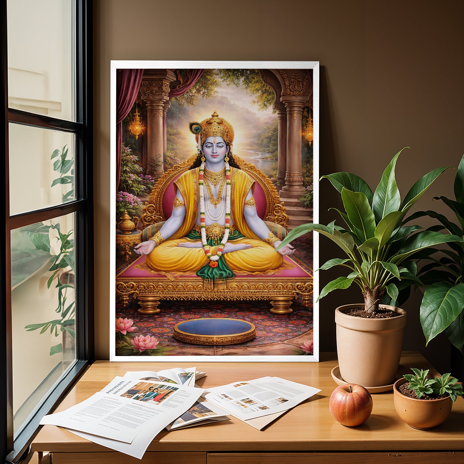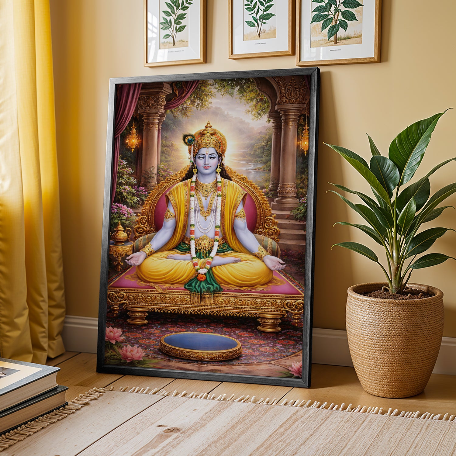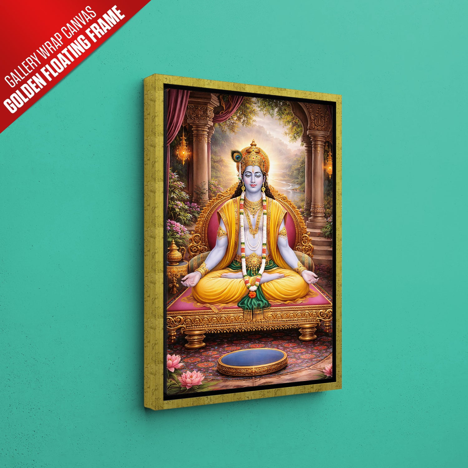 Bring home a feeling of peace and positivity with this beautiful Lord Krishna Meditation Wall Art. This artwork shows Krishna in a calm, meditative posture, symbolizing balance, wisdom, and inner peace. Sitting gracefully on a royal throne with a serene natural background, the entire design gives a soothing and divine vibe.