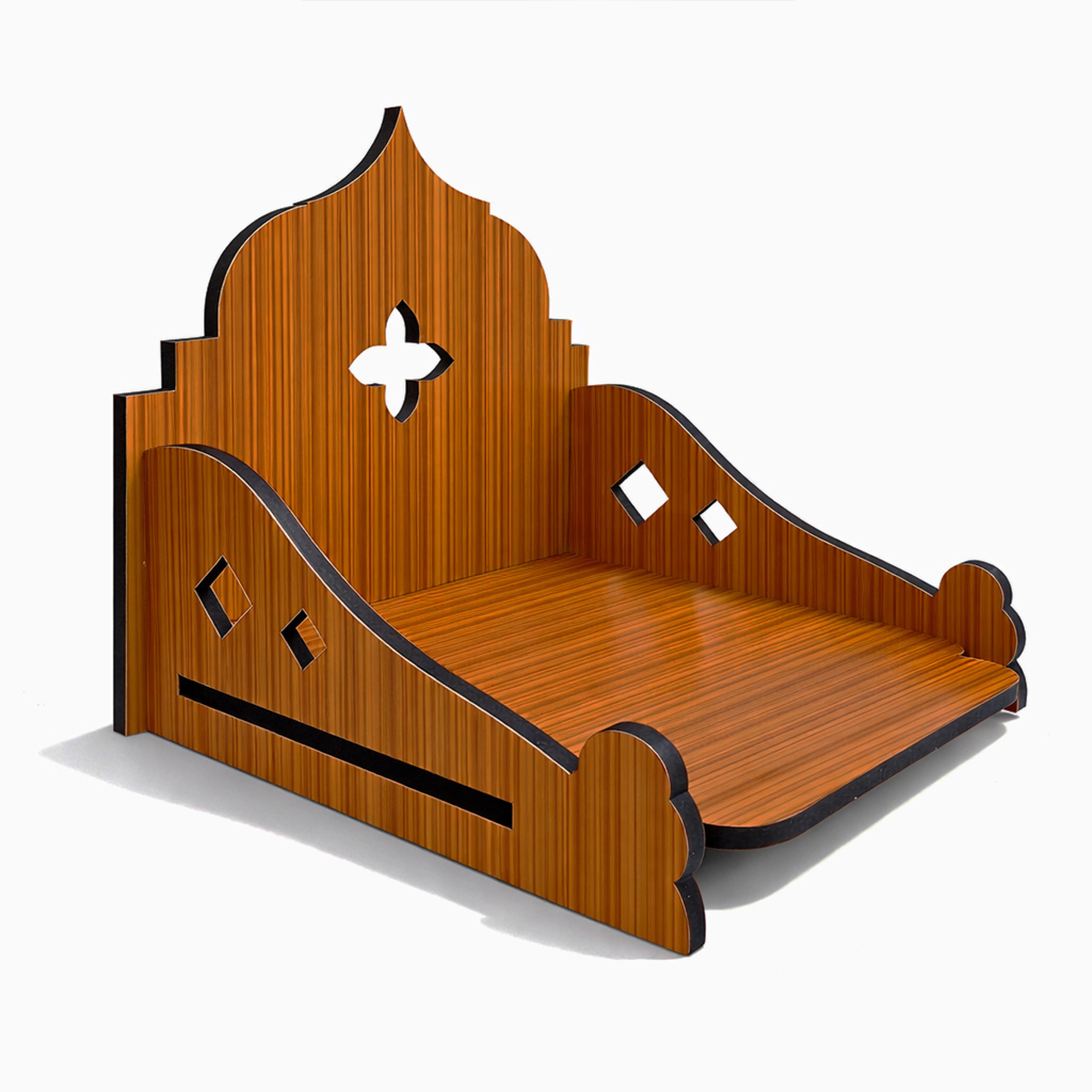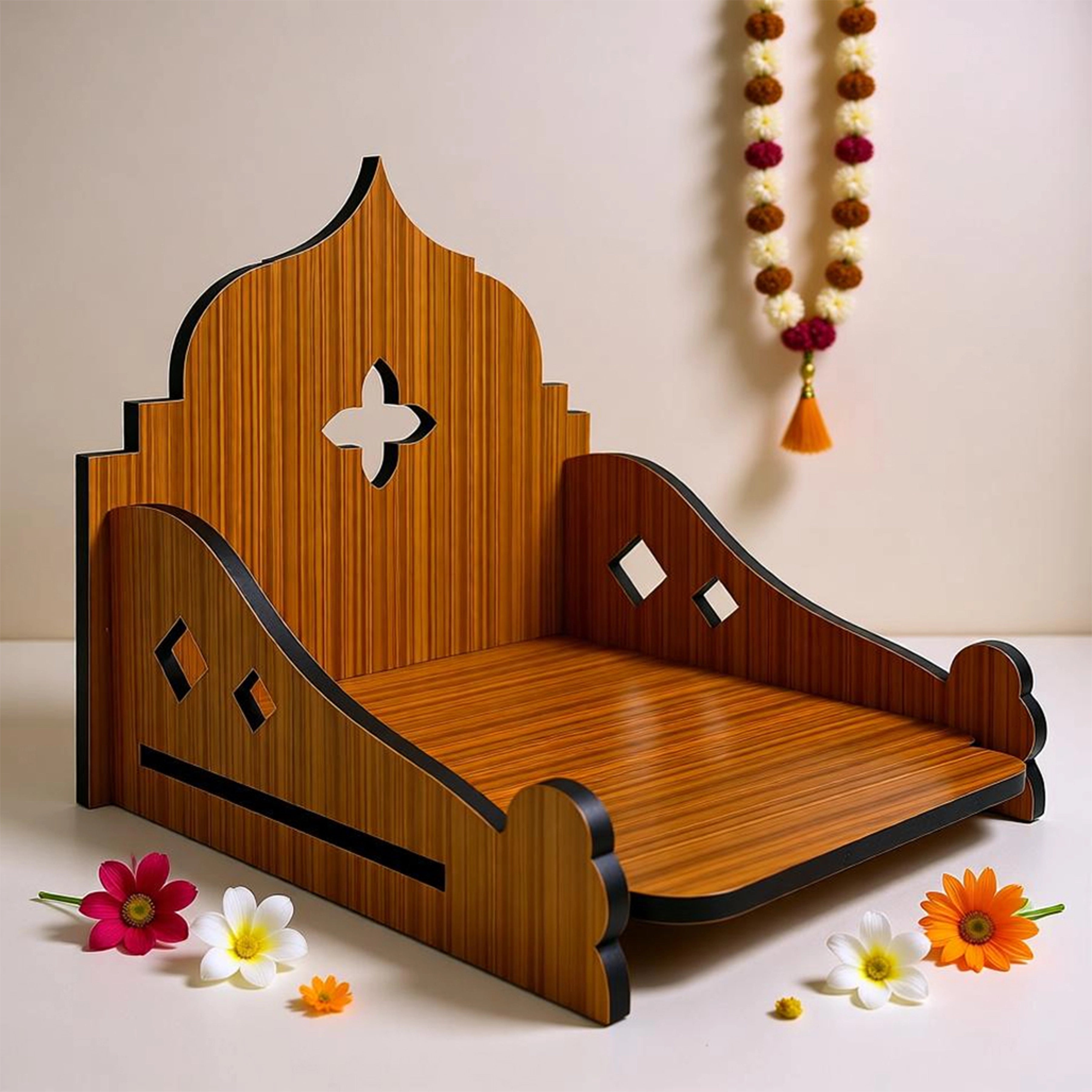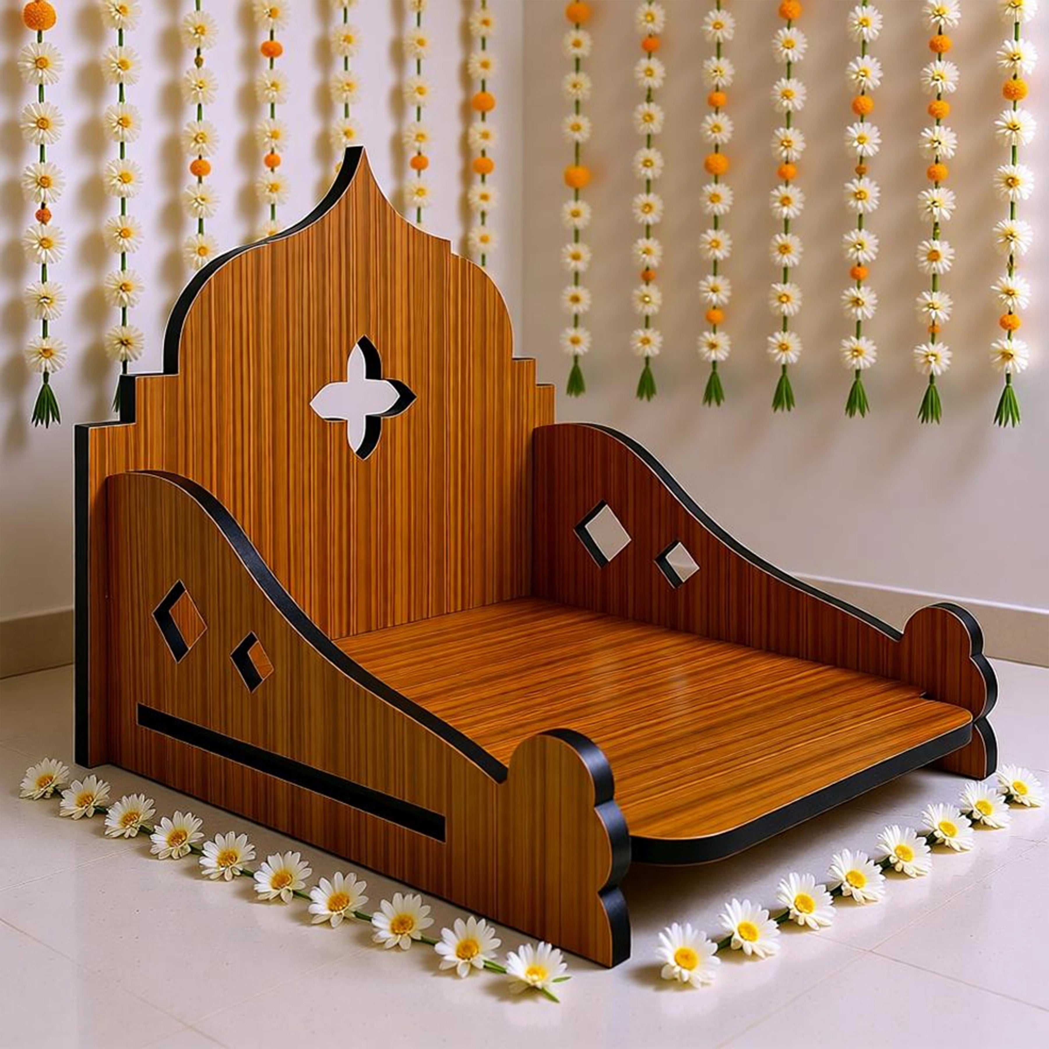 This wooden singhasan is a modern décor piece inspired by traditional temple architecture, reimagined through precise laser-cut craftsmanship. The structured back panel reflects classic temple silhouettes, while the central geometric cross cut adds visual balance and symmetry. Designed with clean lines and smooth curves, this piece blends spiritual inspiration with contemporary design, making it suitable for both traditional and modern interiors.