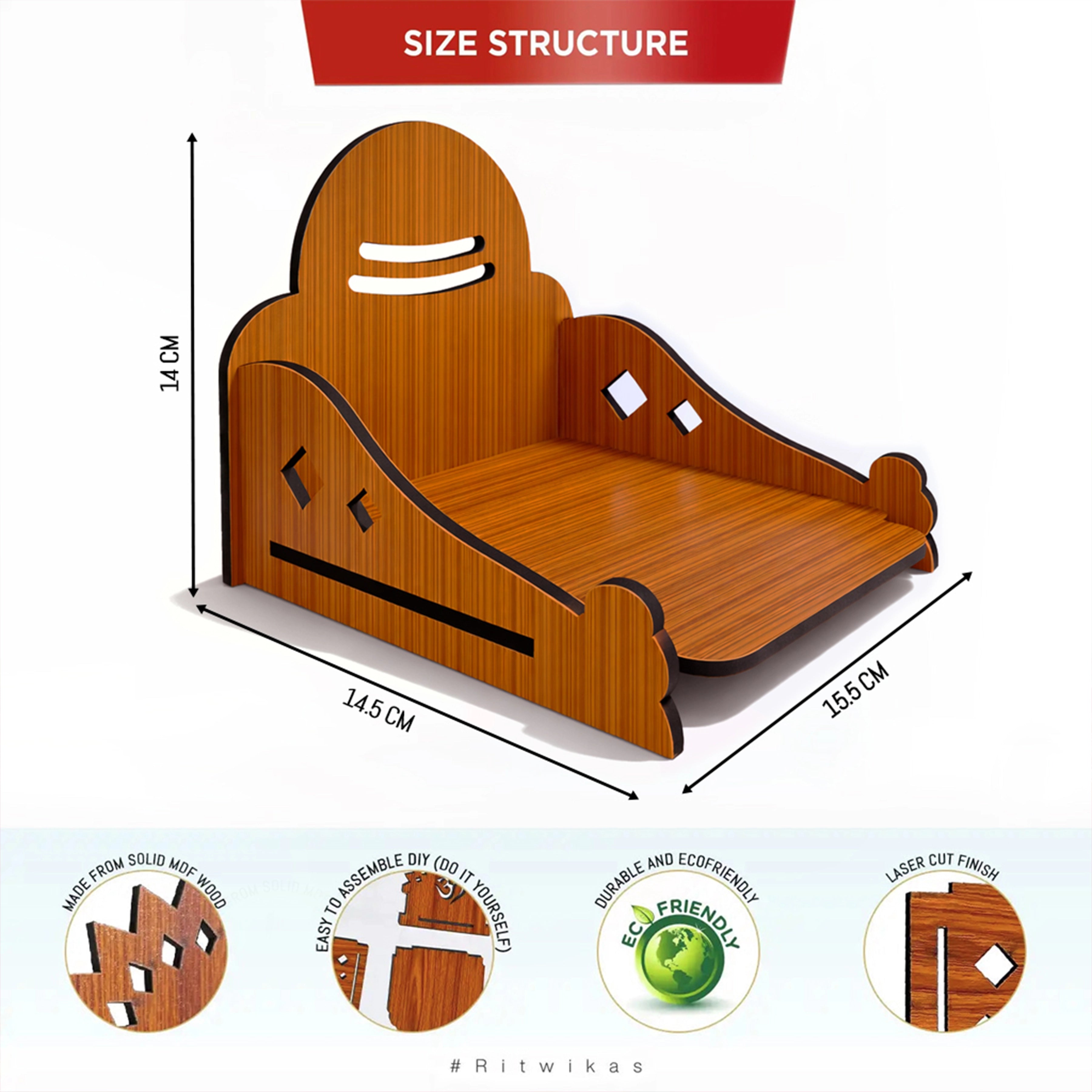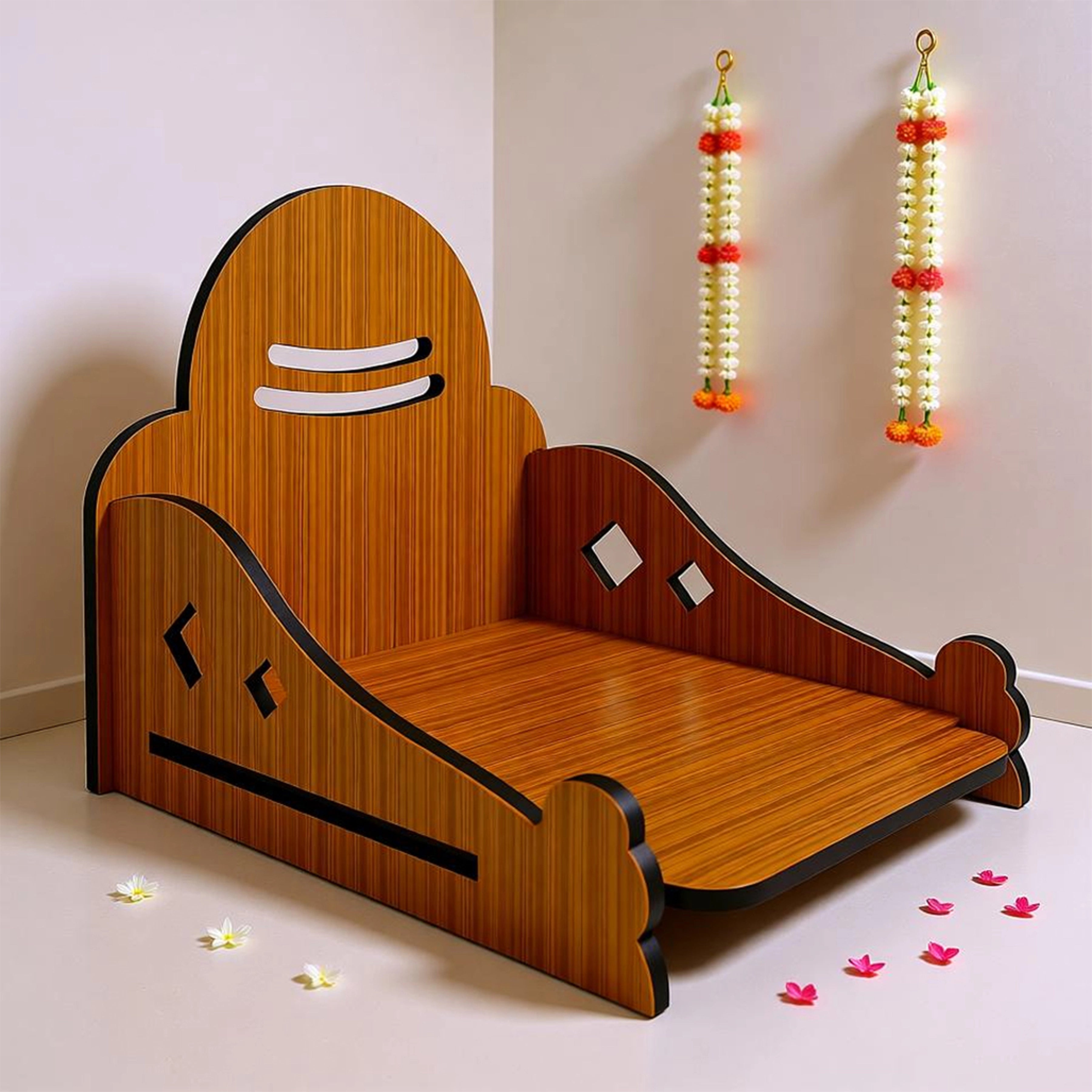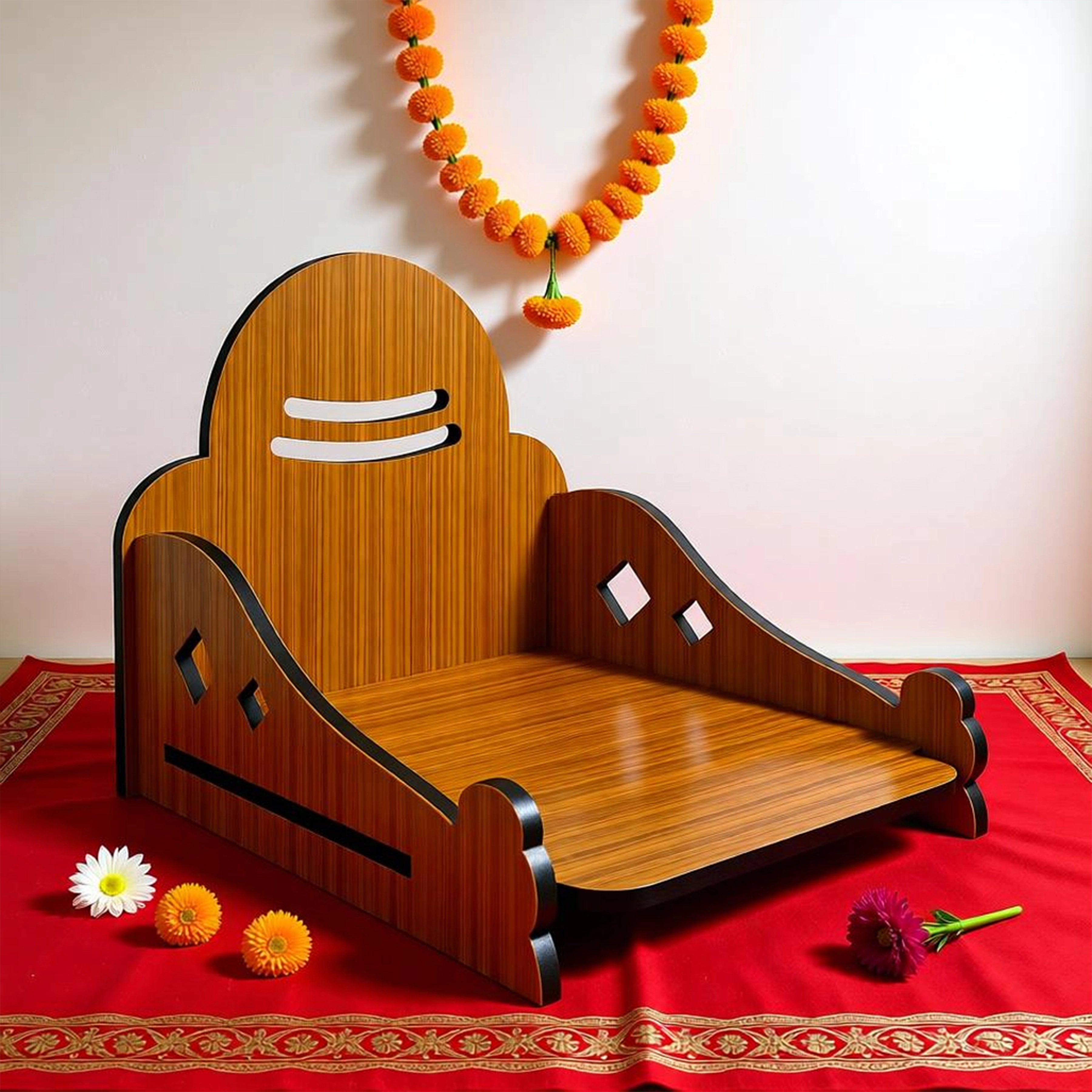 Bring home divine elegance with this DIY Wooden Singhasan with Tripund Design, thoughtfully crafted for your pooja space. Made from premium laminated wood with a rich natural finish, this singhasan features smooth curved edges, precise cut-outs, and a sacred Tripund-inspired backrest that adds spiritual significance and visual charm. Designed as an easy-to-assemble DIY piece, it offers sturdy support for idols while keeping the setup lightweight and practical. Ideal for home temples, festive rituals, or daily worship, this singhasan beautifully blends tradition with modern craftsmanship, making it a graceful centerpiece for your sacred corner.