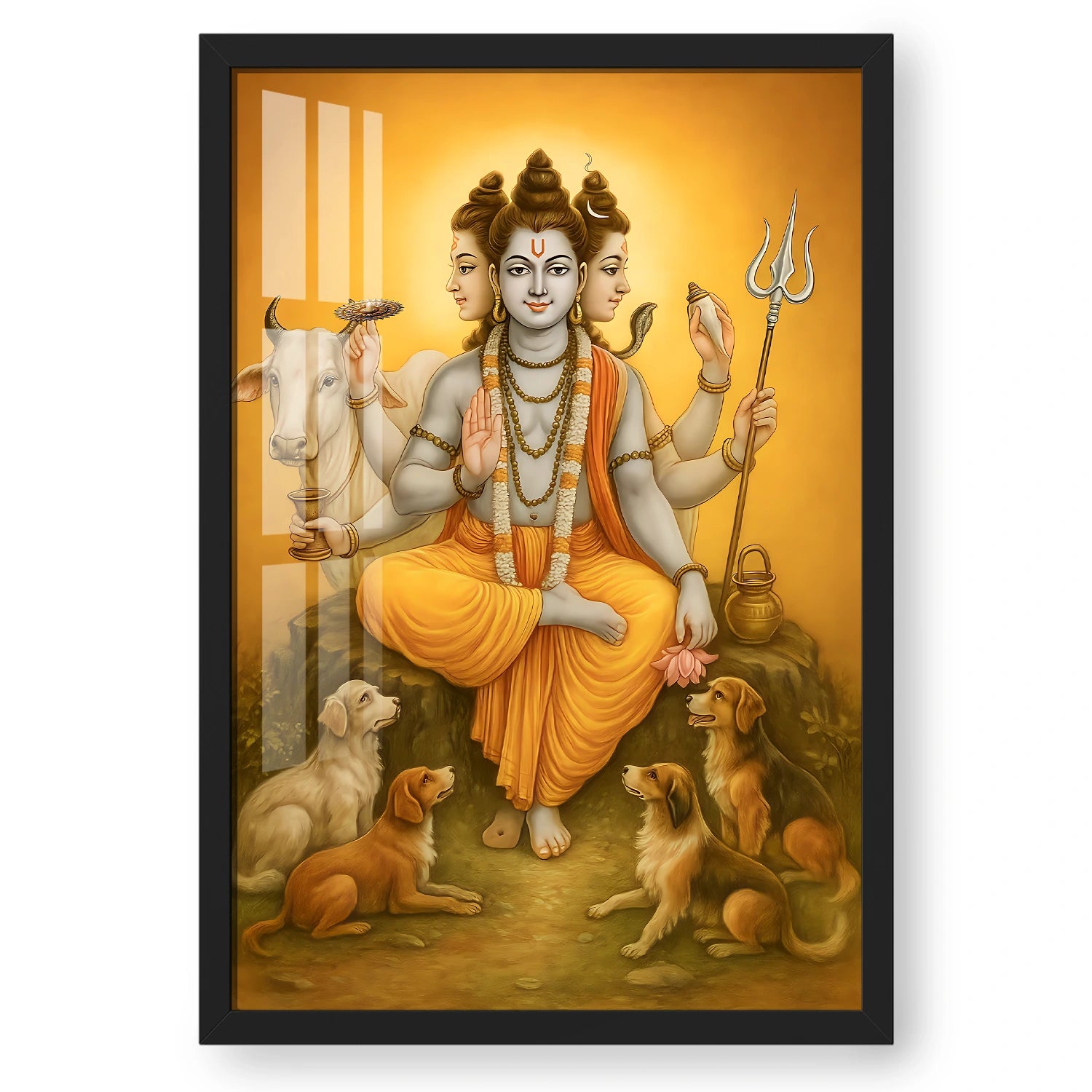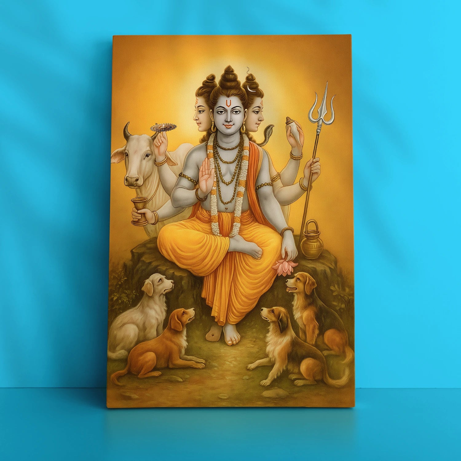 Bring the divine presence of Guru Dattatreya into your home with this stunning, inspired artwork that radiates spiritual tranquility and divine power. Crafted with luxurious detail, this artwork captures Guru Dattatreya’s serene smile, three-headed form, and symbolic elements—making it a must-have for every devotee and art lover. Whether you hang it in your living room, meditation space, or gifting it to someone special, this piece transforms any area into a sanctuary of peace and positivity. Available in high-quality poster prints, gallery wrap canvases, and elegant frames (black, white, or dark brown), this artwork is designed to elevate your décor and spiritual connection