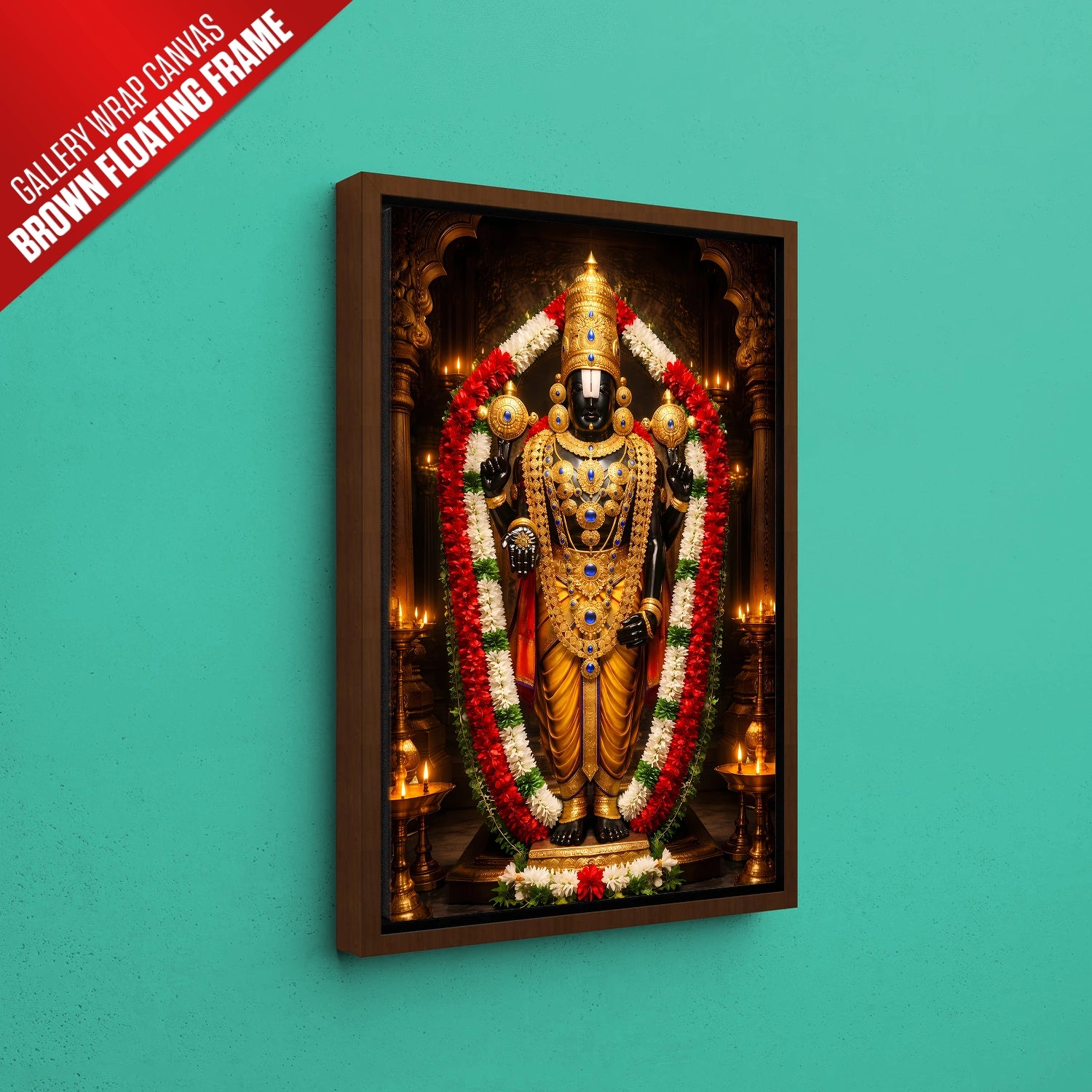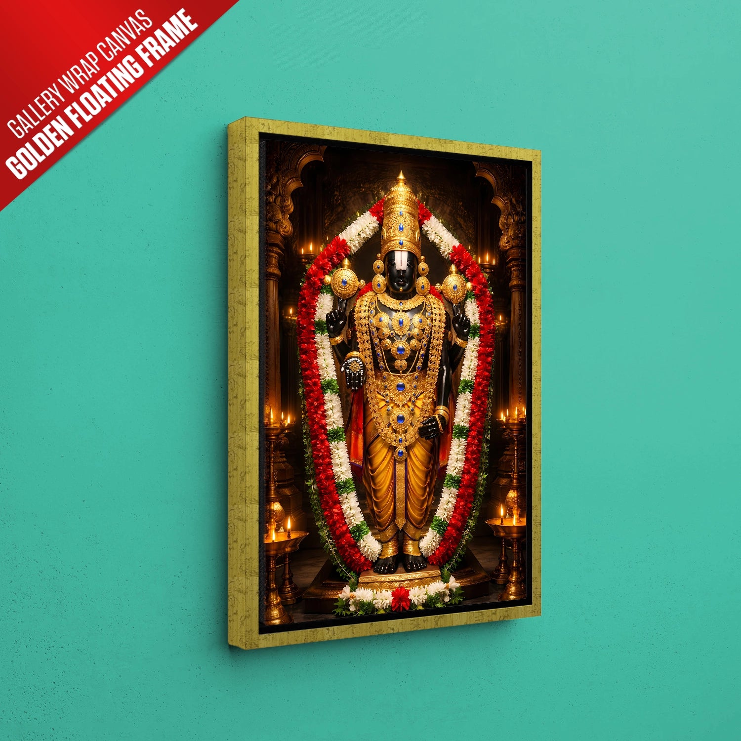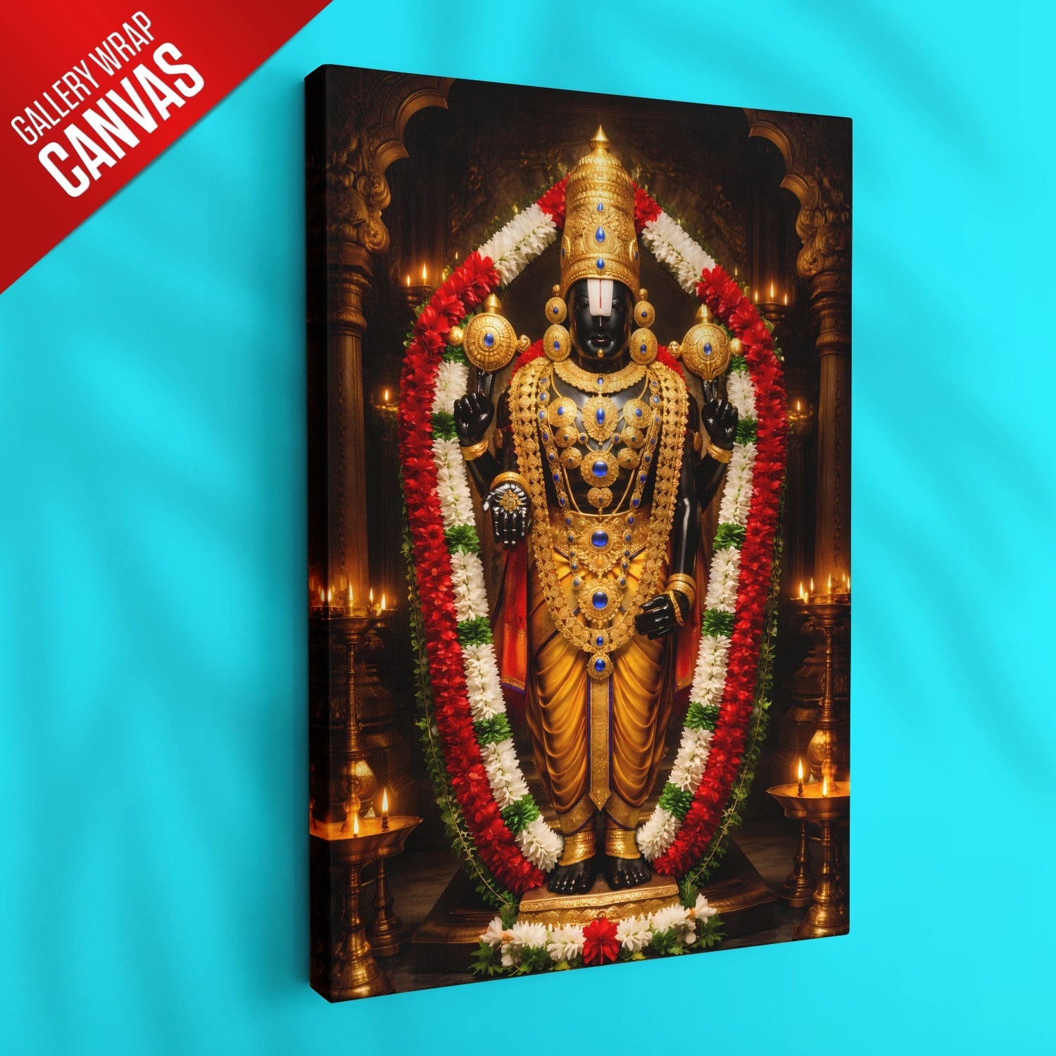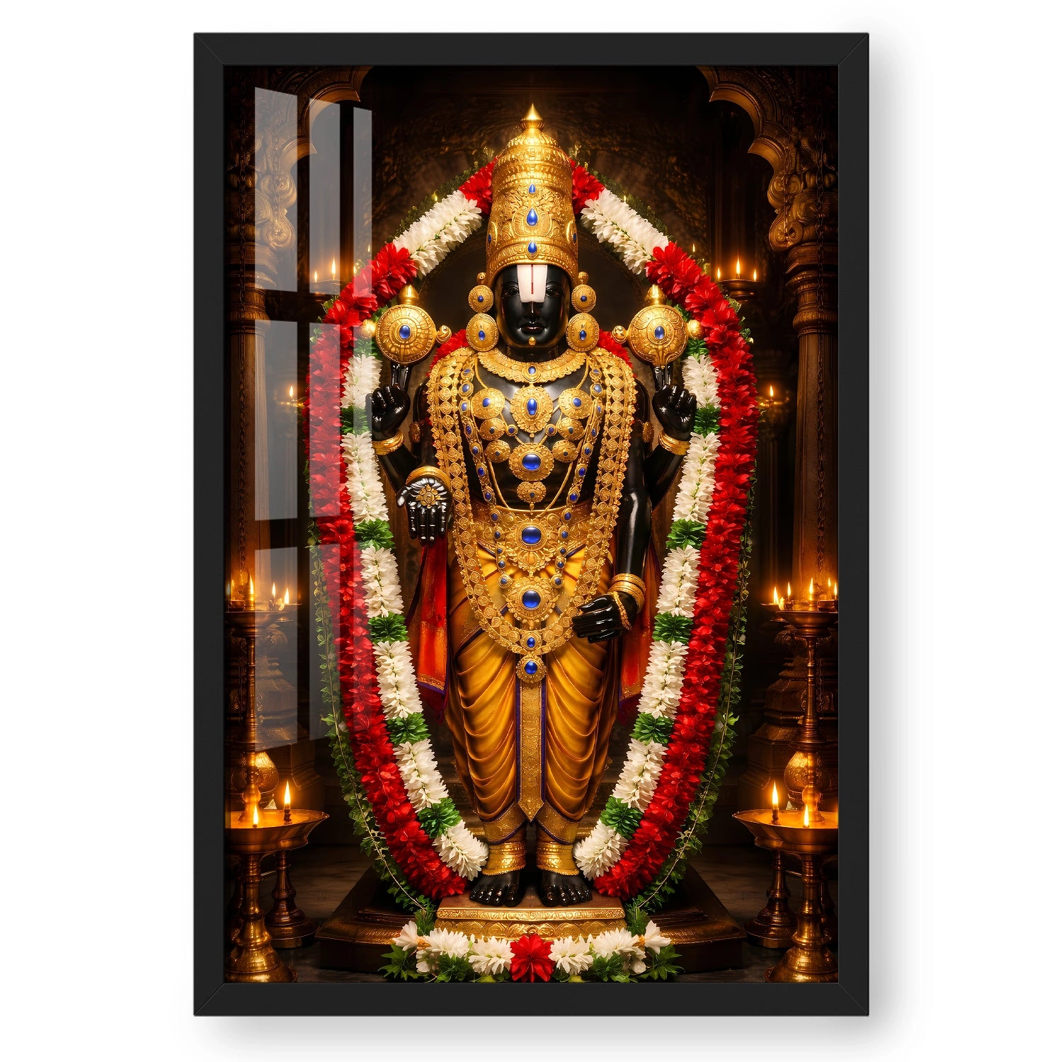 Experience the sacred presence of Lord Venkateshwar (Balaji) in your home with this luxurious temple-style artwork designed to radiate peace, protection, and prosperity. Inspired by the divine Tirupati darshan, this masterpiece captures the powerful aura of Balaji adorned in magnificent golden ornaments and traditional garlands, symbolizing faith, abundance, and fulfillment of wishes. Placing this artwork in your living room, office, or pooja space creates a spiritually uplifting environment that attracts positivity and success into your life. Crafted to be lightweight, durable, and premium-quality, this devotional art is available in rolled poster, elegant black frame, classic white frame, rich dark brown frame, and gallery wrap canvas, making it a perfect choice for personal devotion or a meaningful gift for housewarming, weddings, and festivals.