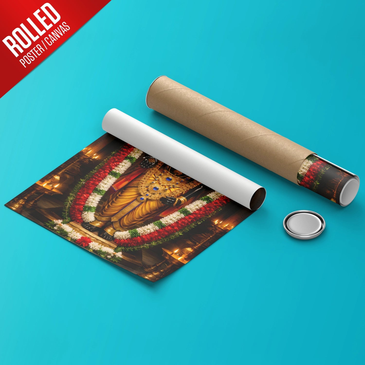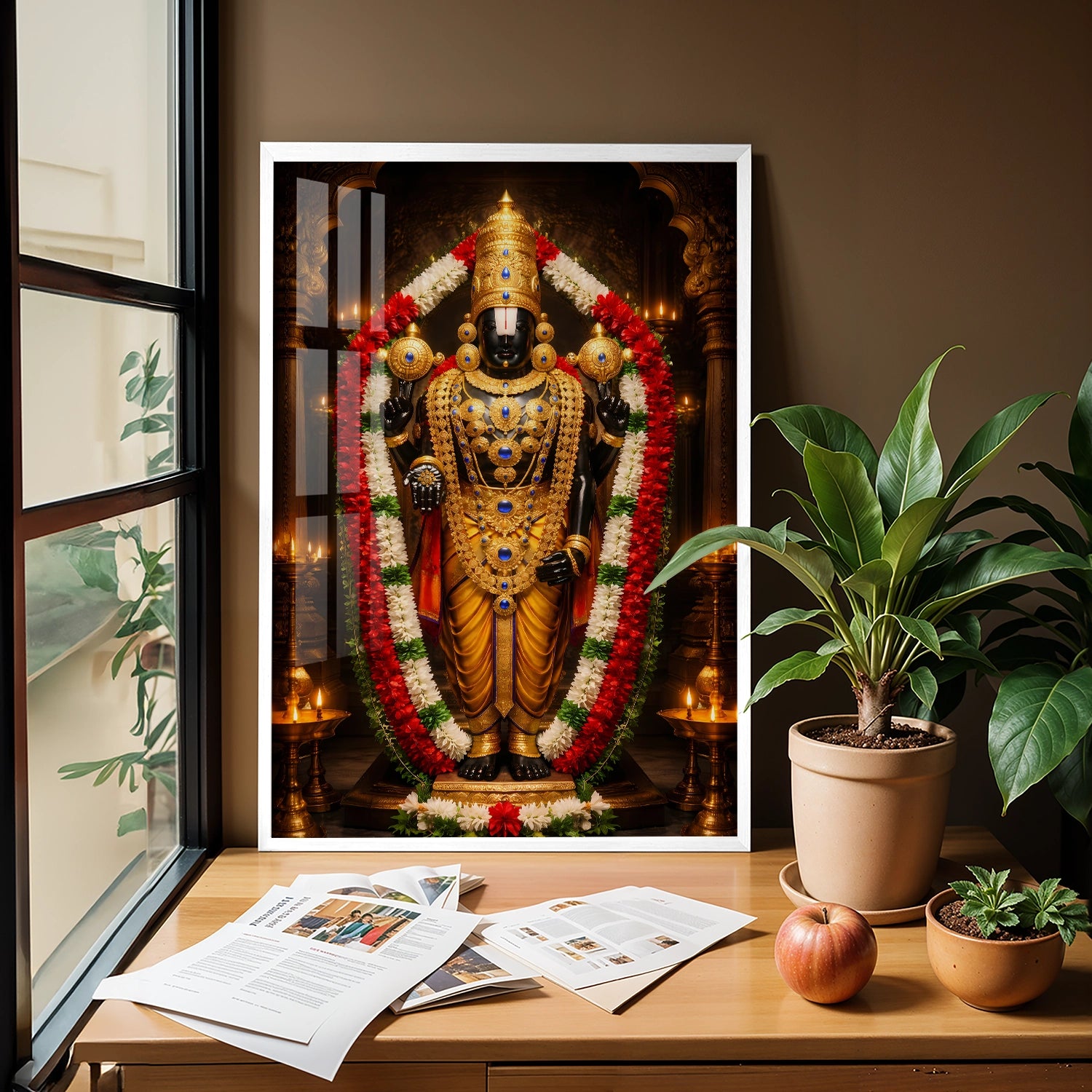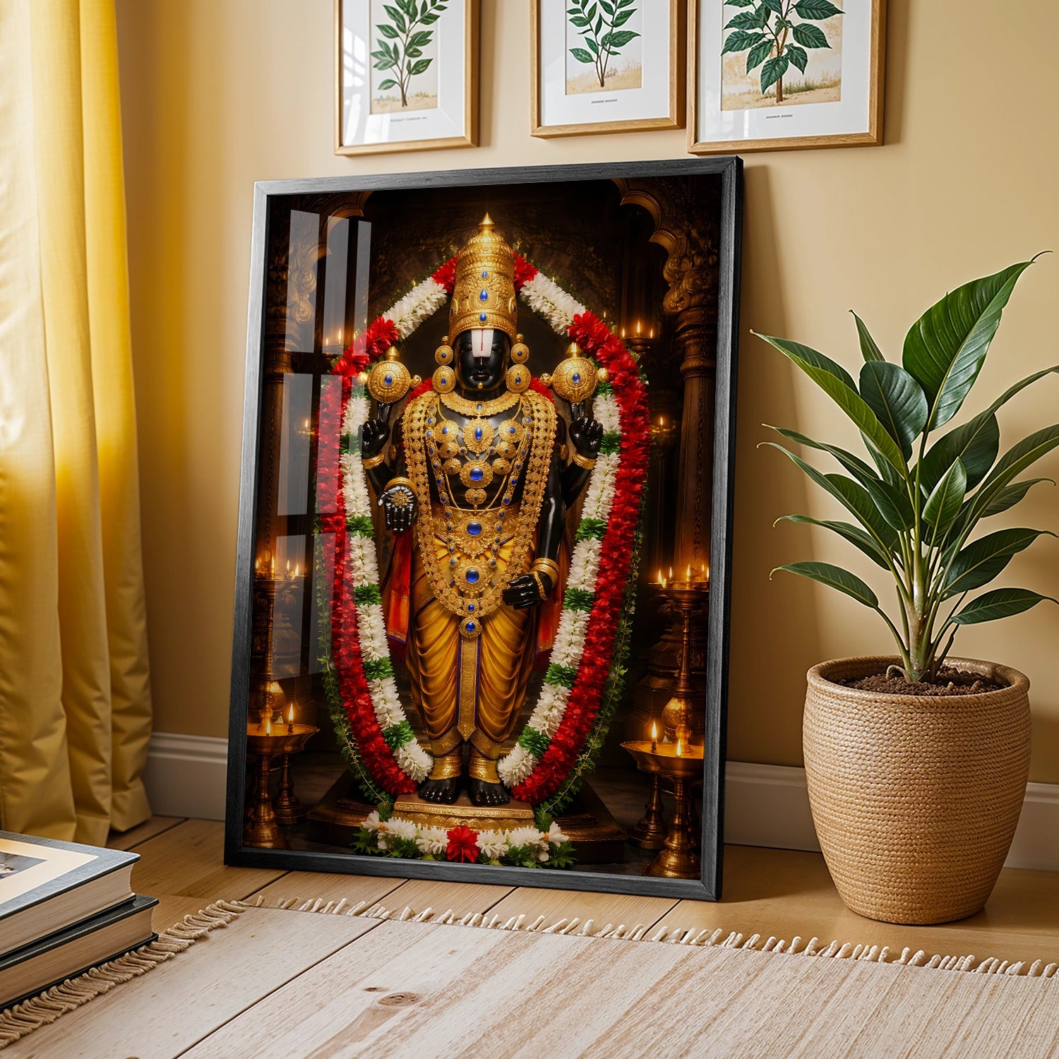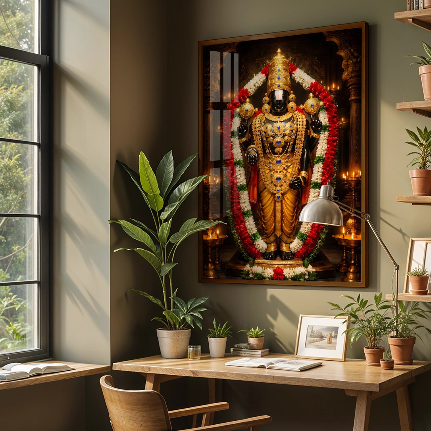 Experience the sacred presence of Lord Venkateshwar (Balaji) in your home with this luxurious temple-style artwork designed to radiate peace, protection, and prosperity. Inspired by the divine Tirupati darshan, this masterpiece captures the powerful aura of Balaji adorned in magnificent golden ornaments and traditional garlands, symbolizing faith, abundance, and fulfillment of wishes. Placing this artwork in your living room, office, or pooja space creates a spiritually uplifting environment that attracts positivity and success into your life. Crafted to be lightweight, durable, and premium-quality, this devotional art is available in rolled poster, elegant black frame, classic white frame, rich dark brown frame, and gallery wrap canvas, making it a perfect choice for personal devotion or a meaningful gift for housewarming, weddings, and festivals.