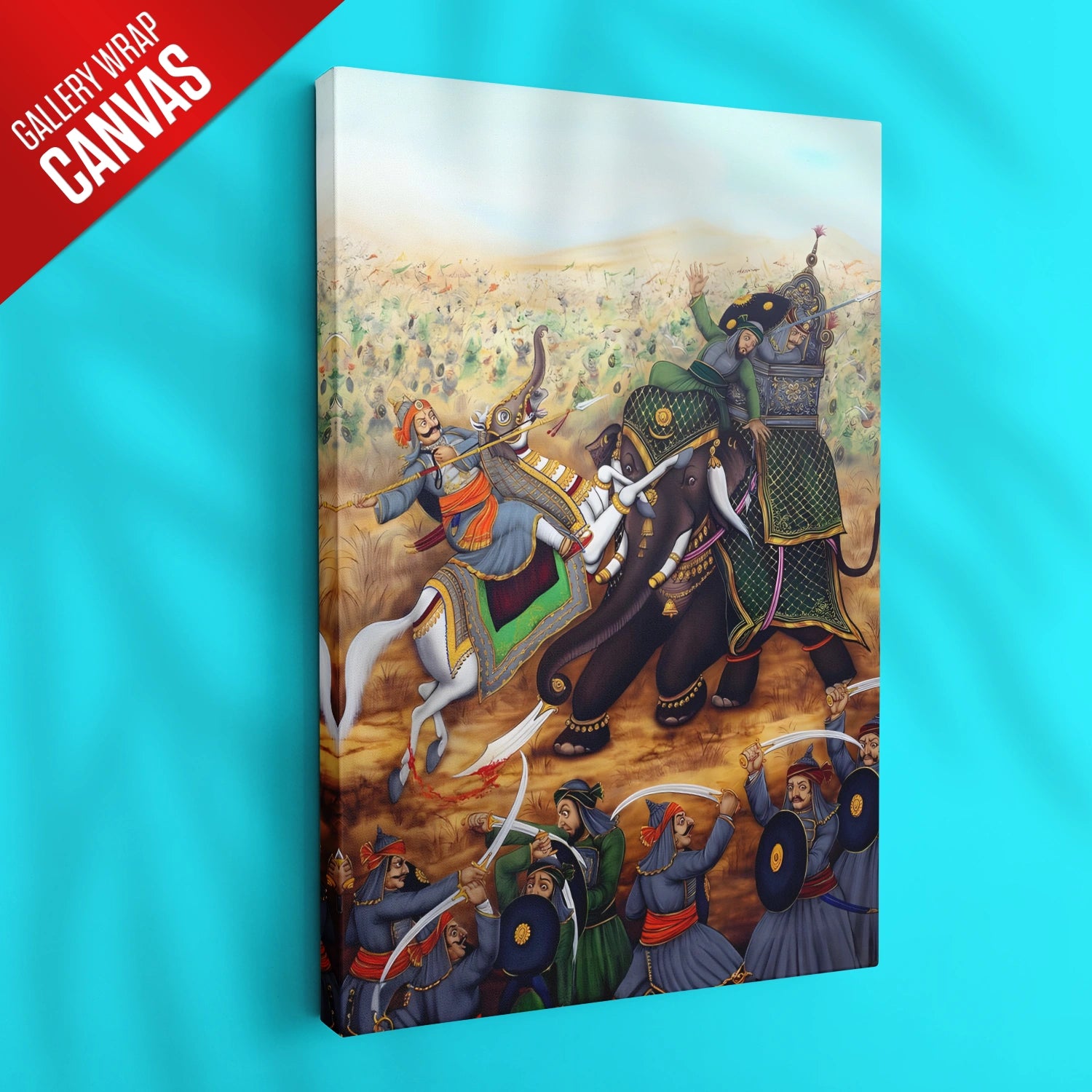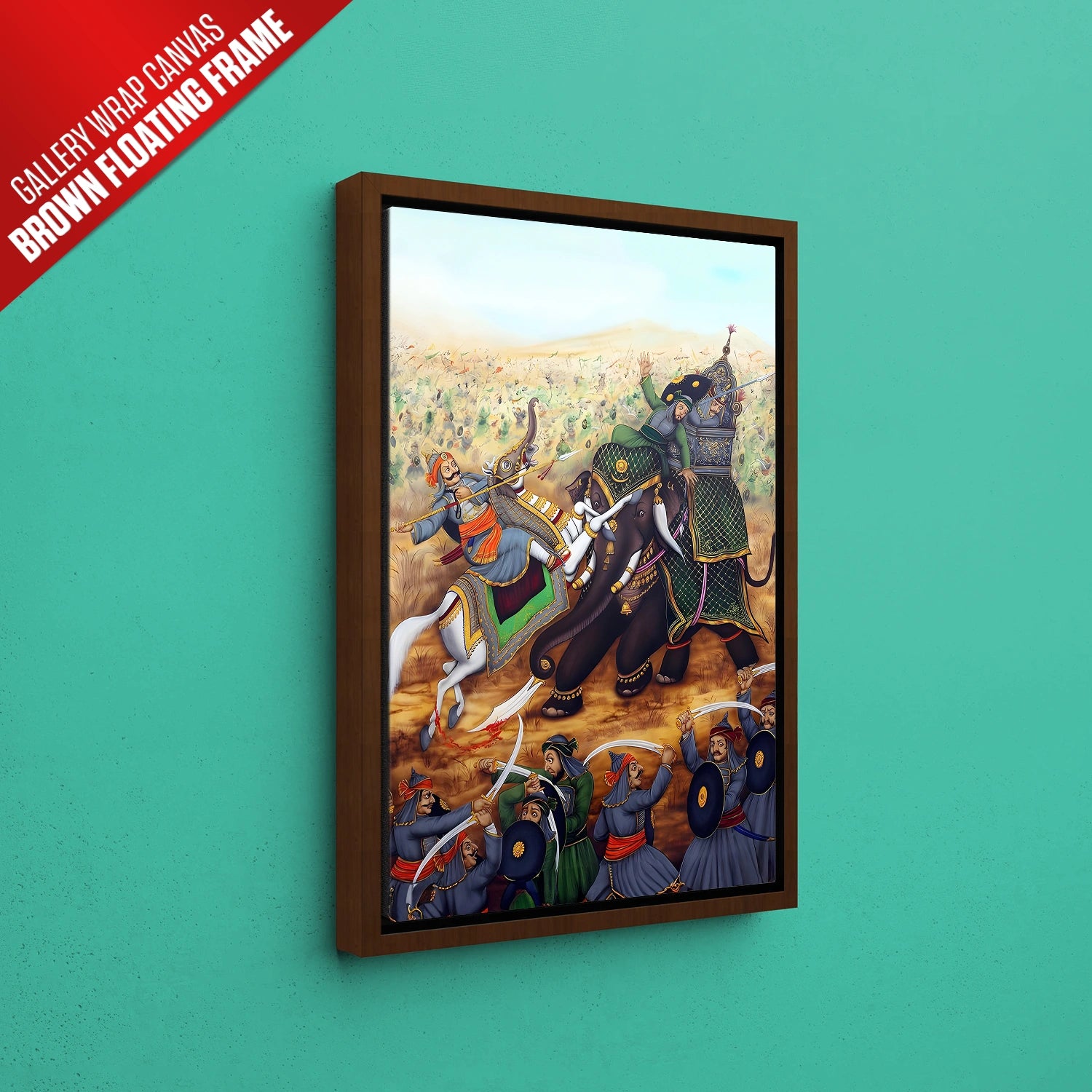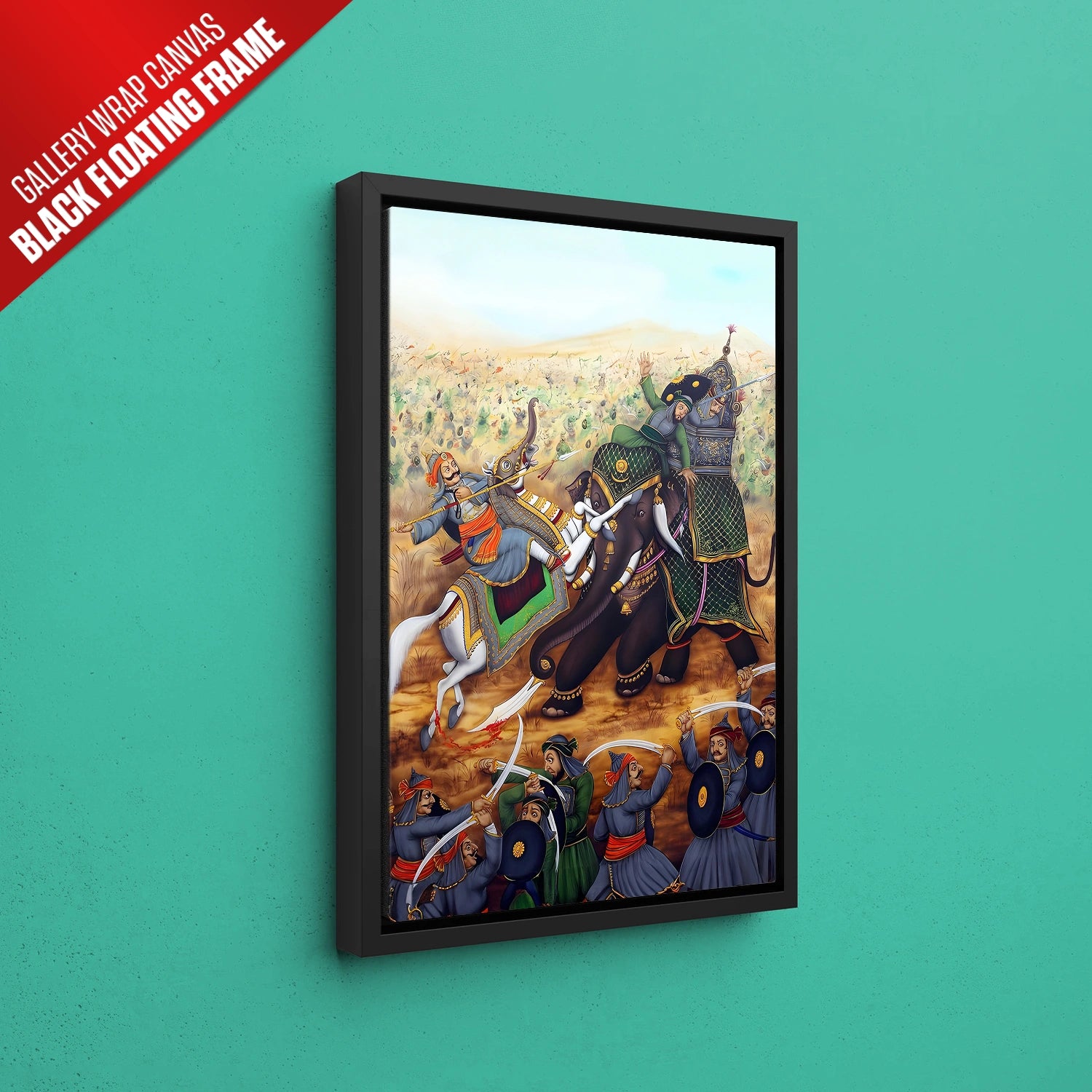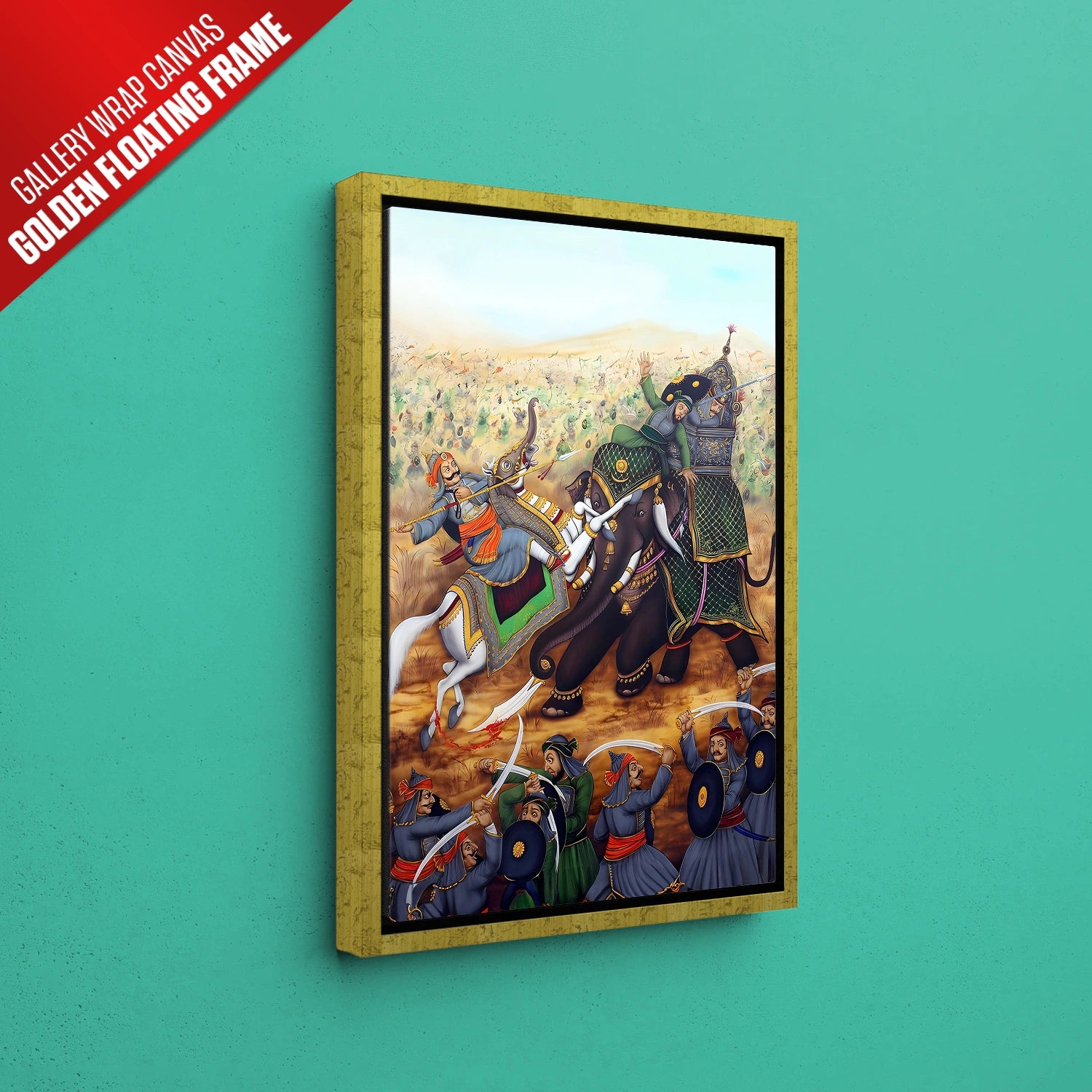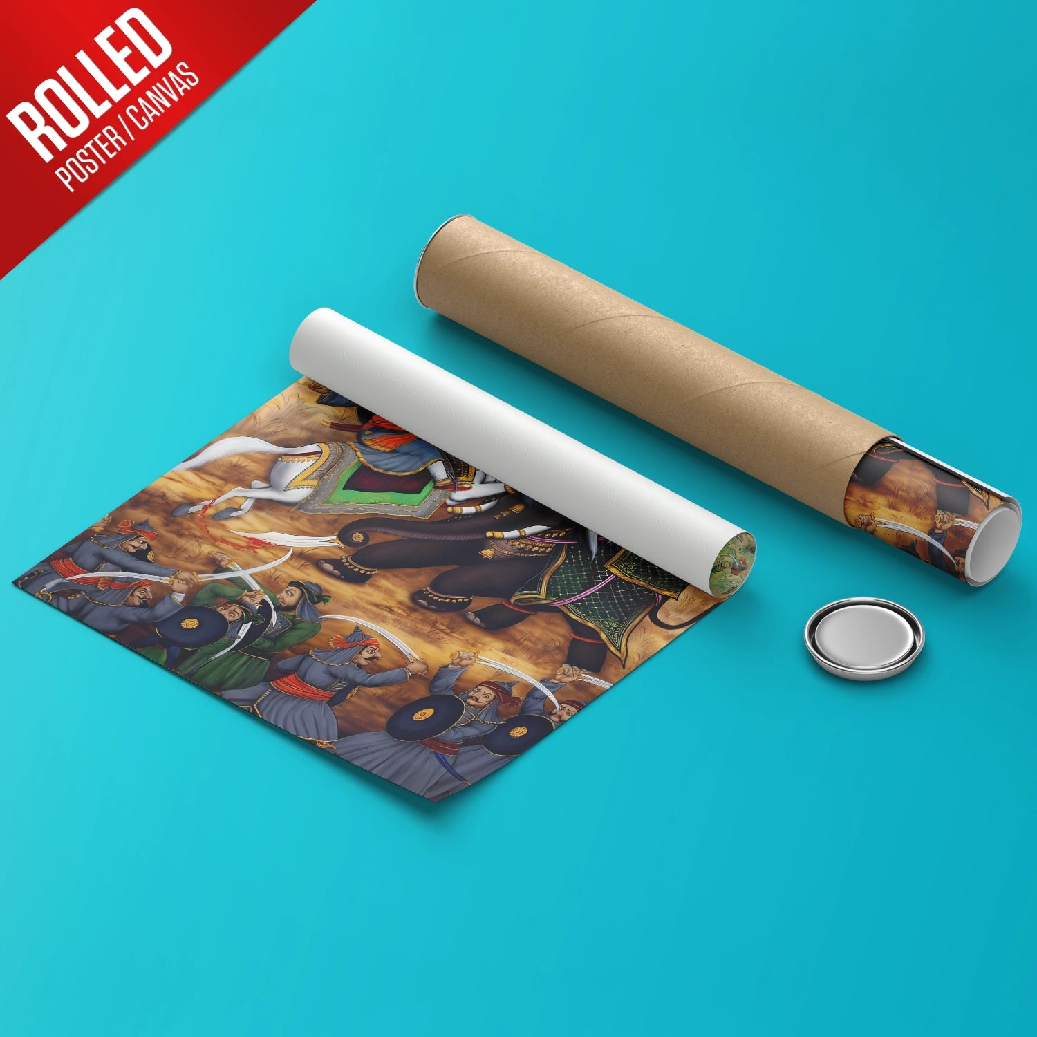 Celebrate the legacy of Maharana Pratap with this captivating artwork, available now at Ritwika's! This piece portrays the legendary Rajput warrior king in all his glory, his regal attire and unwavering gaze a testament to his enduring spirit. The artwork is further enriched by a powerful quote by Maharana Pratap himself, reminding us of the values he championed (Continually remembering your goals, working hard and self-powering will make the way to success easier).