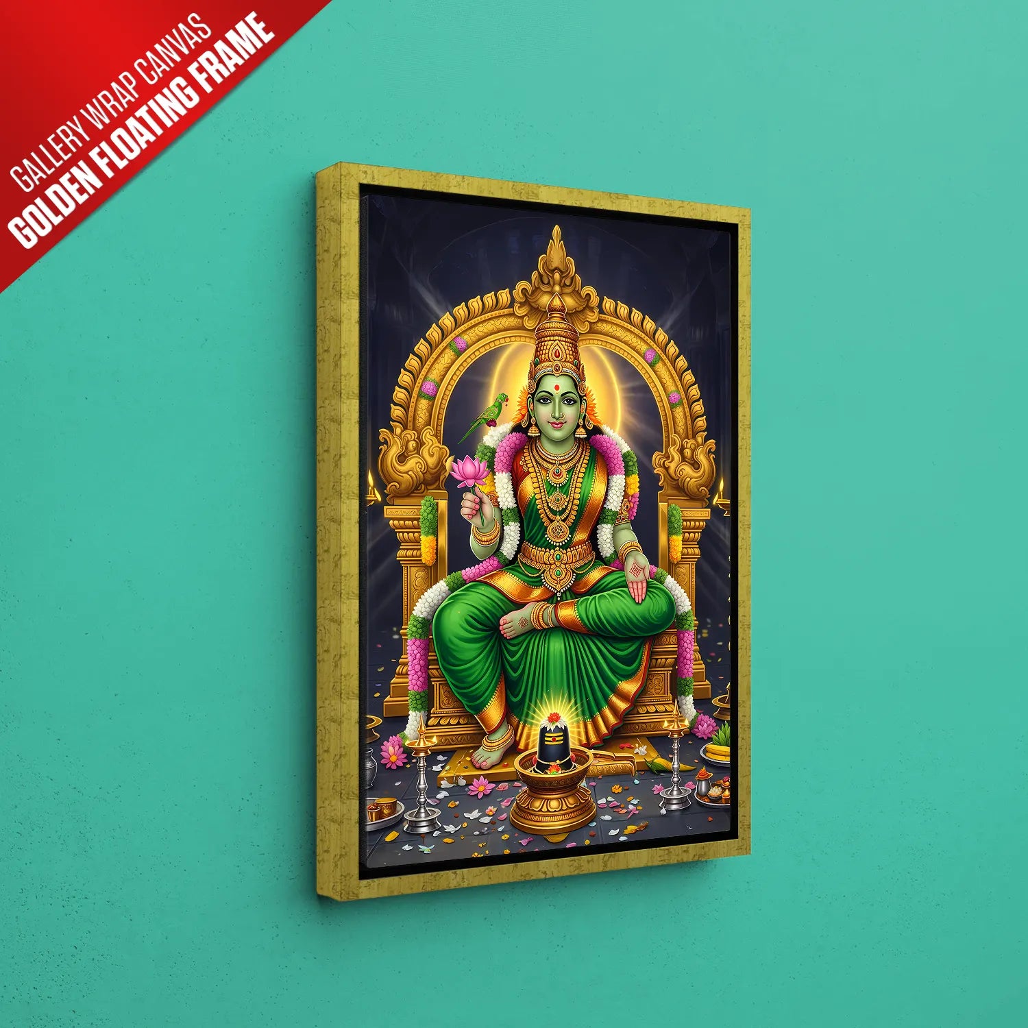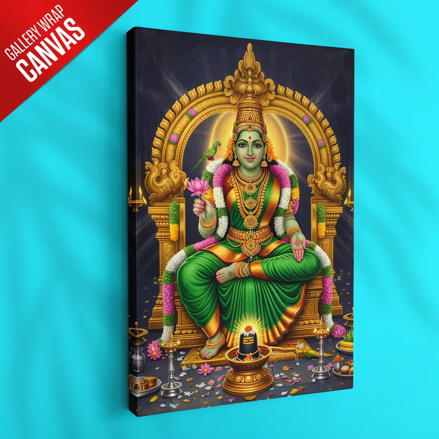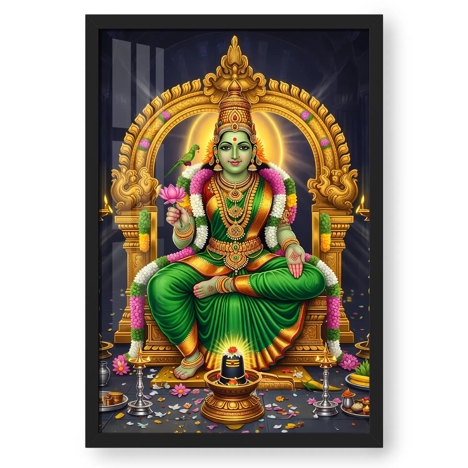 Invite prosperity, peace, and divine energy into your home with this luxurious Meenakshi Amma devotional artwork. Inspired by the sacred South Indian temple traditions, this artwork celebrates strength, compassion, and spiritual balance. The radiant green hues symbolize growth and abundance, while the intricate gold detailing adds a regal, timeless charm to your space.