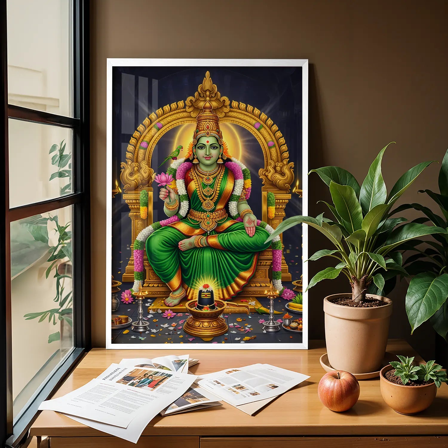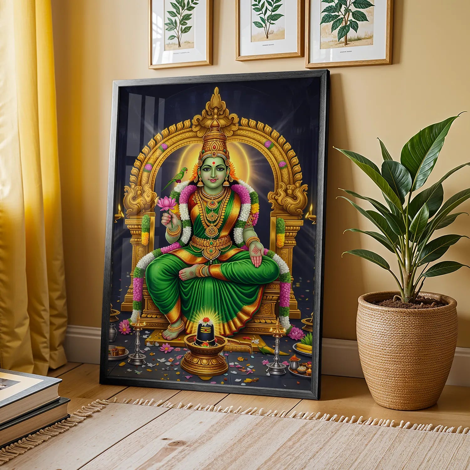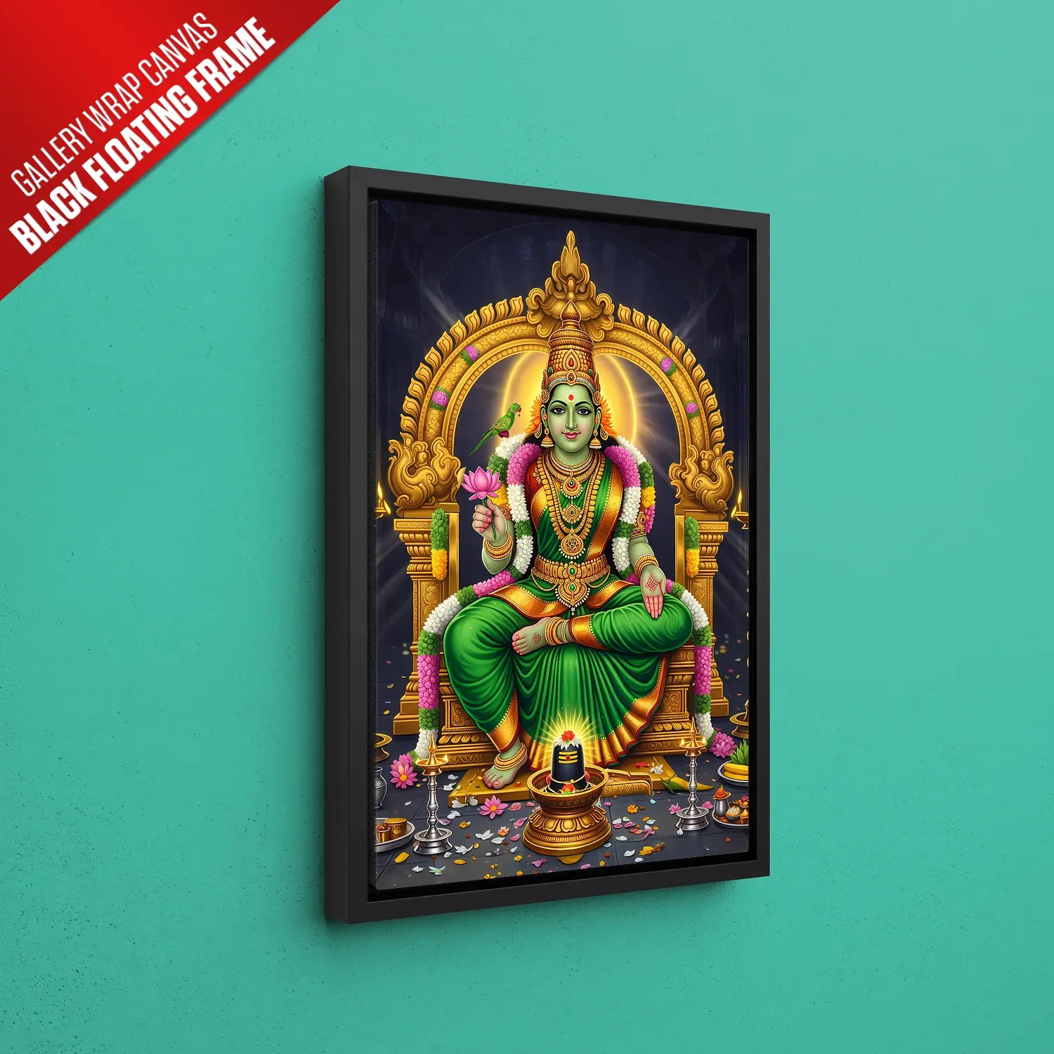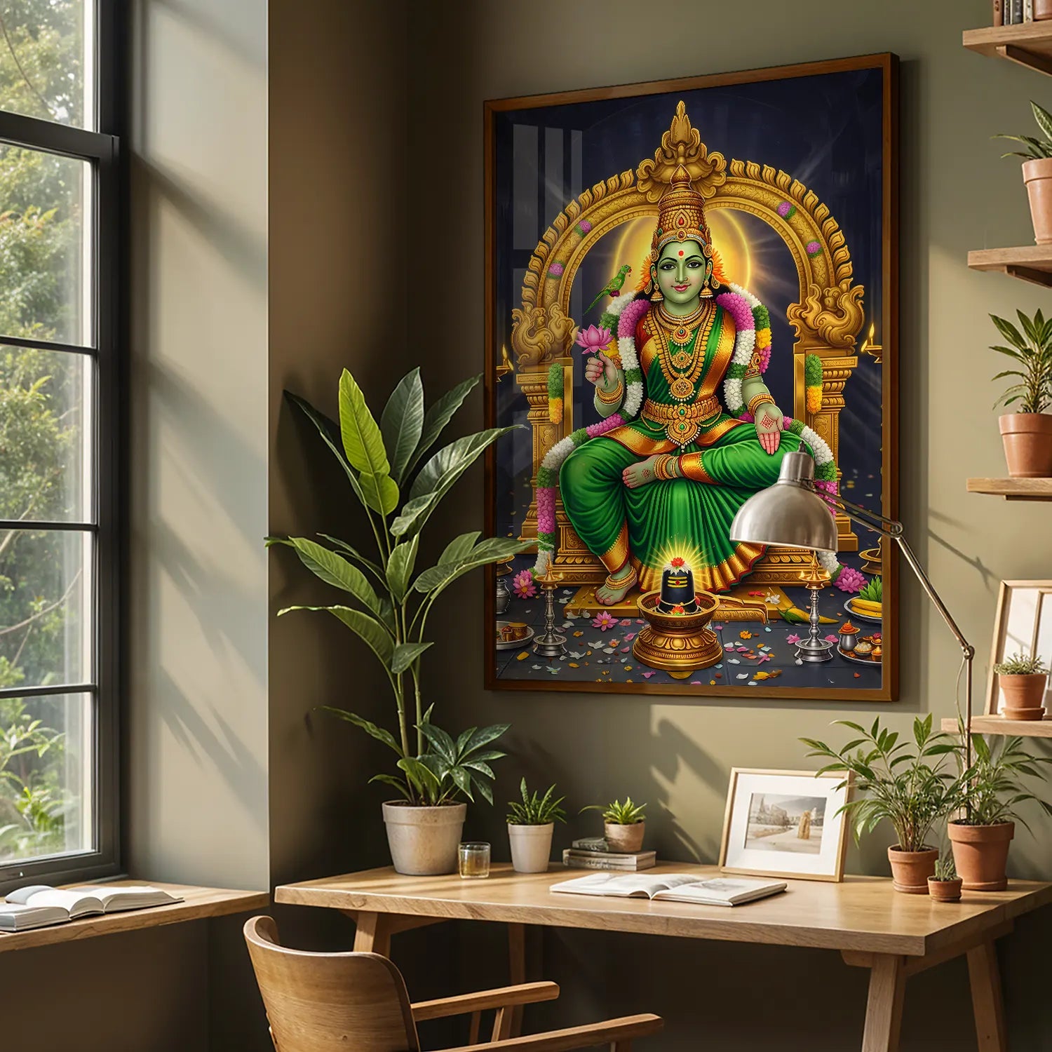 Invite prosperity, peace, and divine energy into your home with this luxurious Meenakshi Amma devotional artwork. Inspired by the sacred South Indian temple traditions, this artwork celebrates strength, compassion, and spiritual balance. The radiant green hues symbolize growth and abundance, while the intricate gold detailing adds a regal, timeless charm to your space.