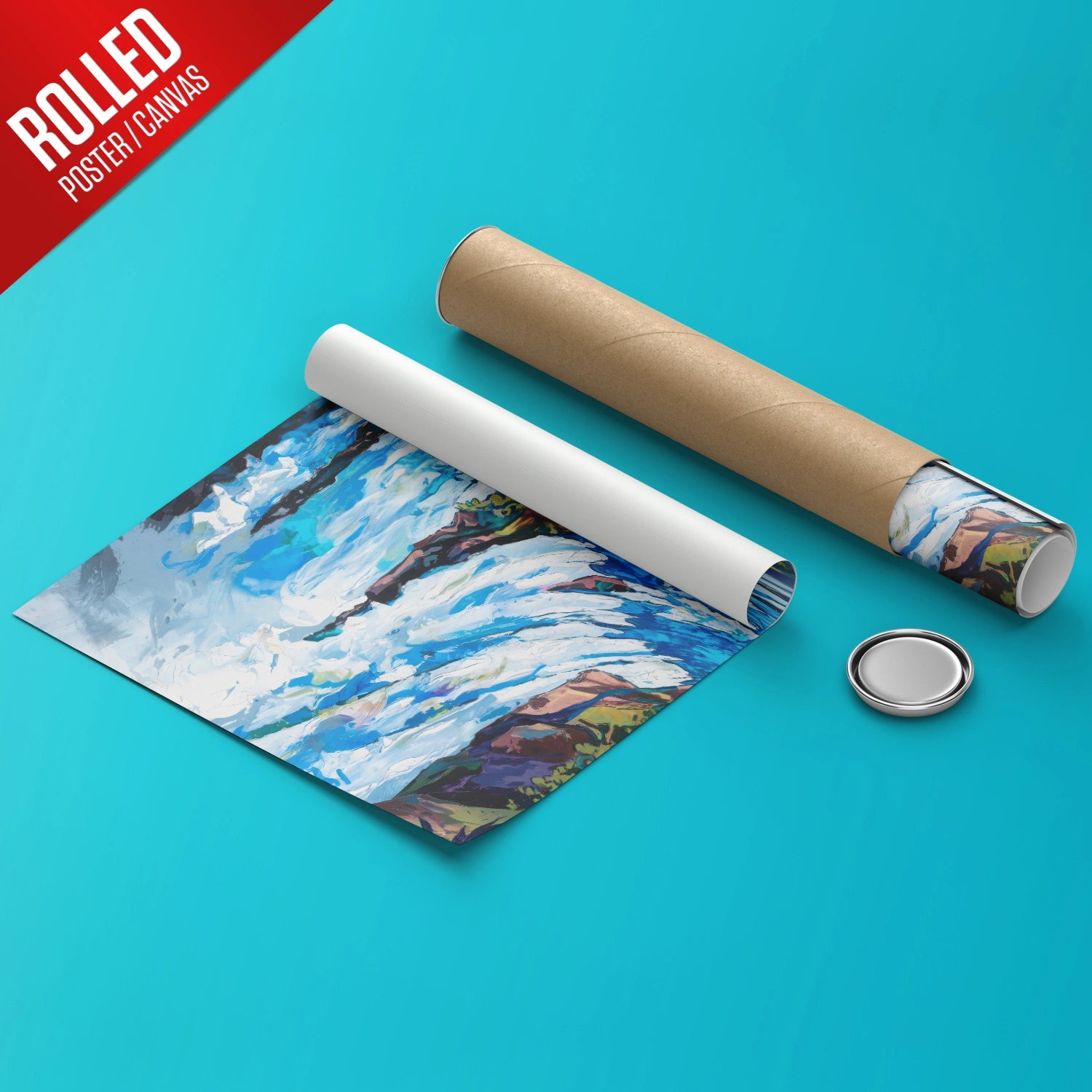 Rolled posters or canvas are artworks sent without a frame, safely packed in a tube, ready for you to frame locally as you like.