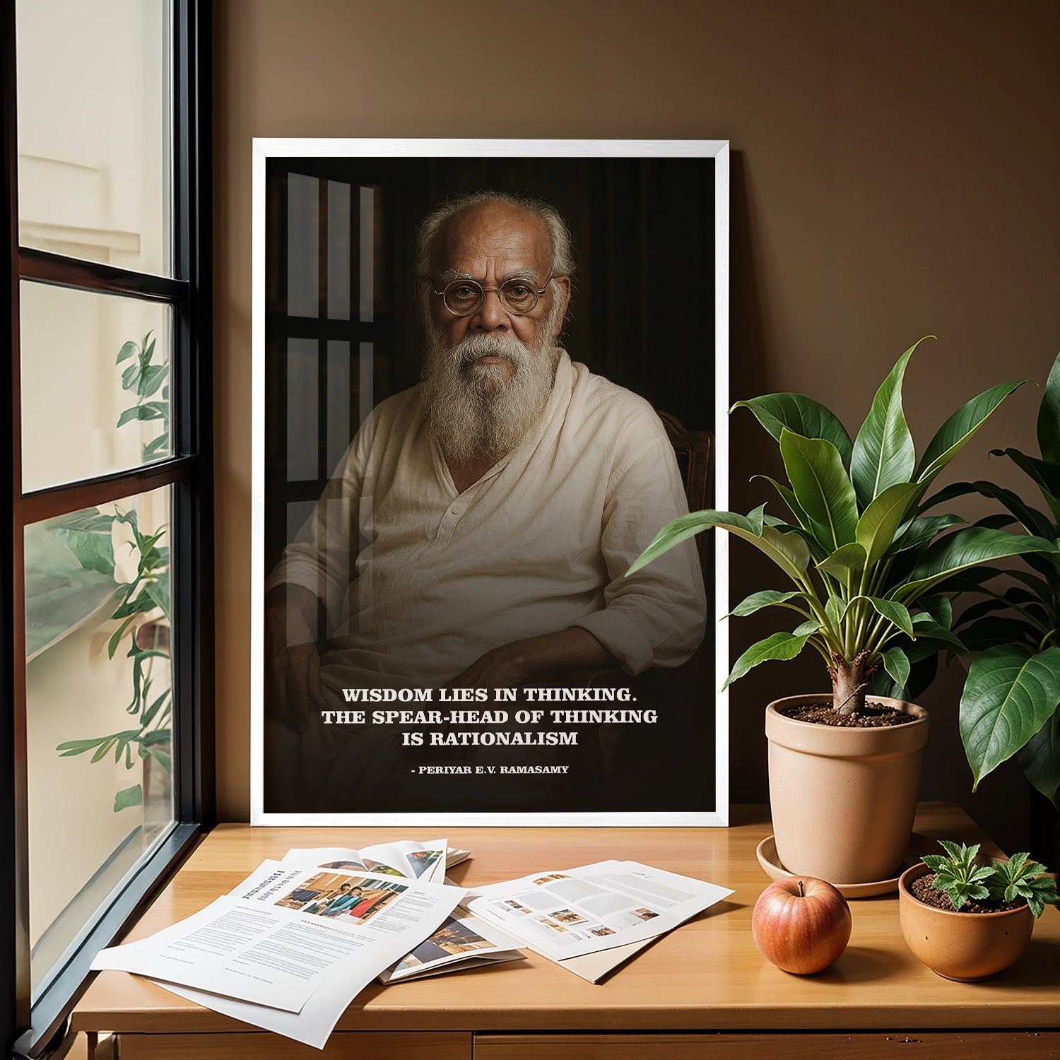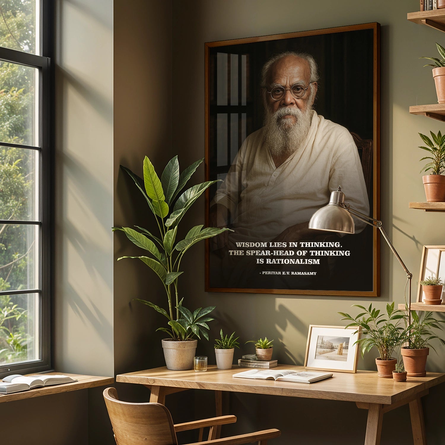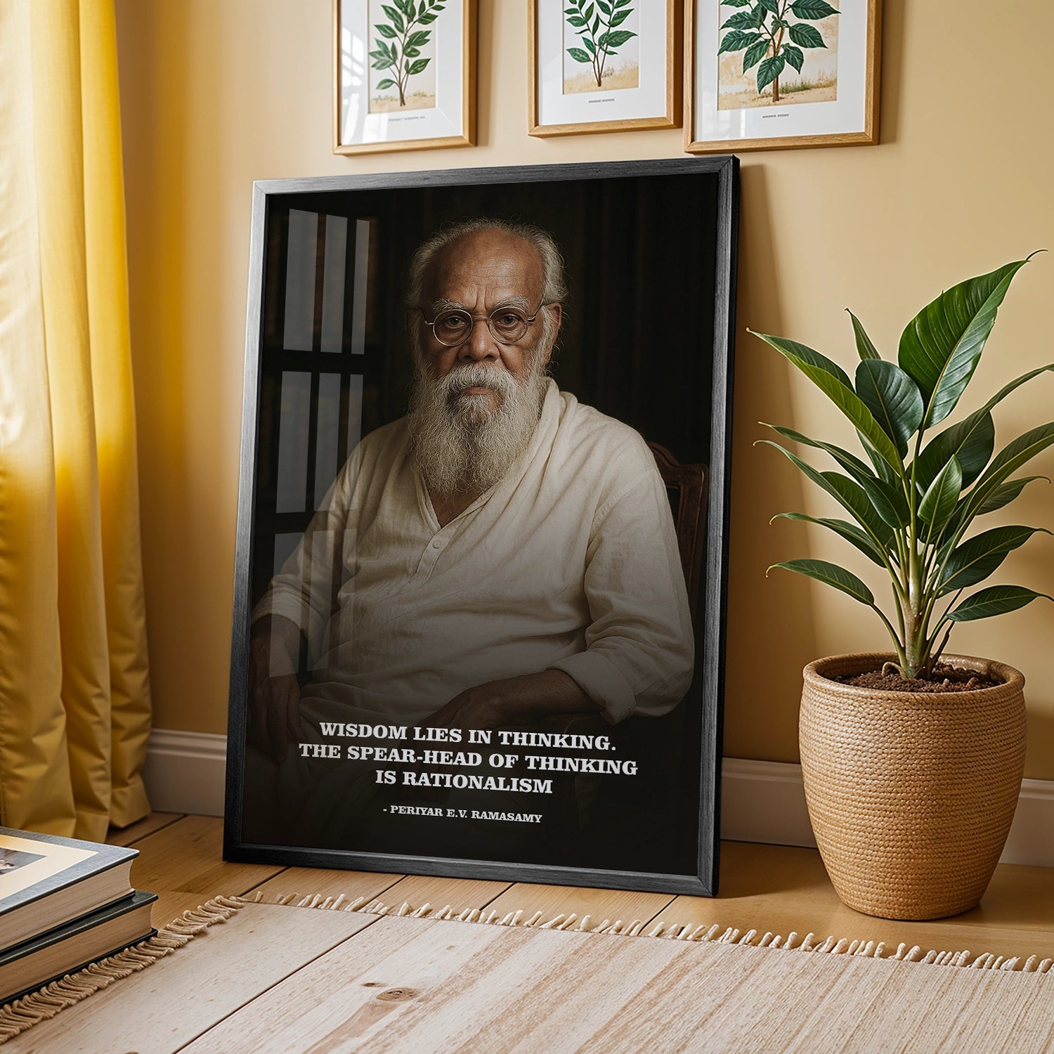 Bring the powerful legacy of Periyar EV Ramasamy into your home or office with this captivating artwork. Crafted with love and inspired by his unwavering dedication to social justice and equality, this piece is more than just a decoration — it's a symbol of revolutionary thought and unbreakable spirit. Whether you choose a luxurious gallery wrap canvas, a classic poster on rolled paper, or a sophisticated frame in black, white, or dark brown, this artwork will elevate your space and spark meaningful conversations. Every fan of social reform and human rights must own this inspiring piece to remind themselves of the importance of rational thinking and relentless pursuit of justice. Gift it to someone special or keep it as a daily source of motivation—either way, it’s a valuable addition to any meaningful collection.