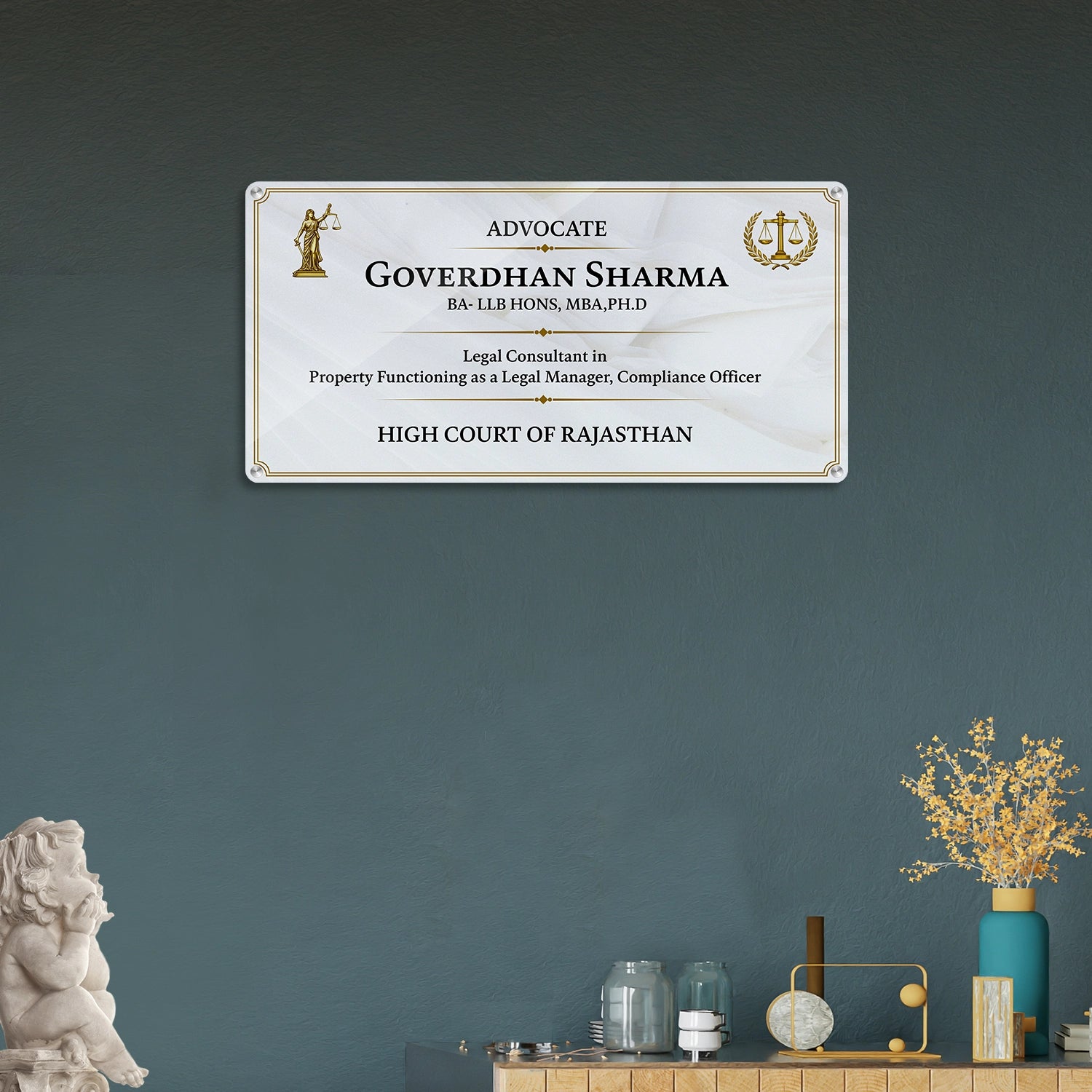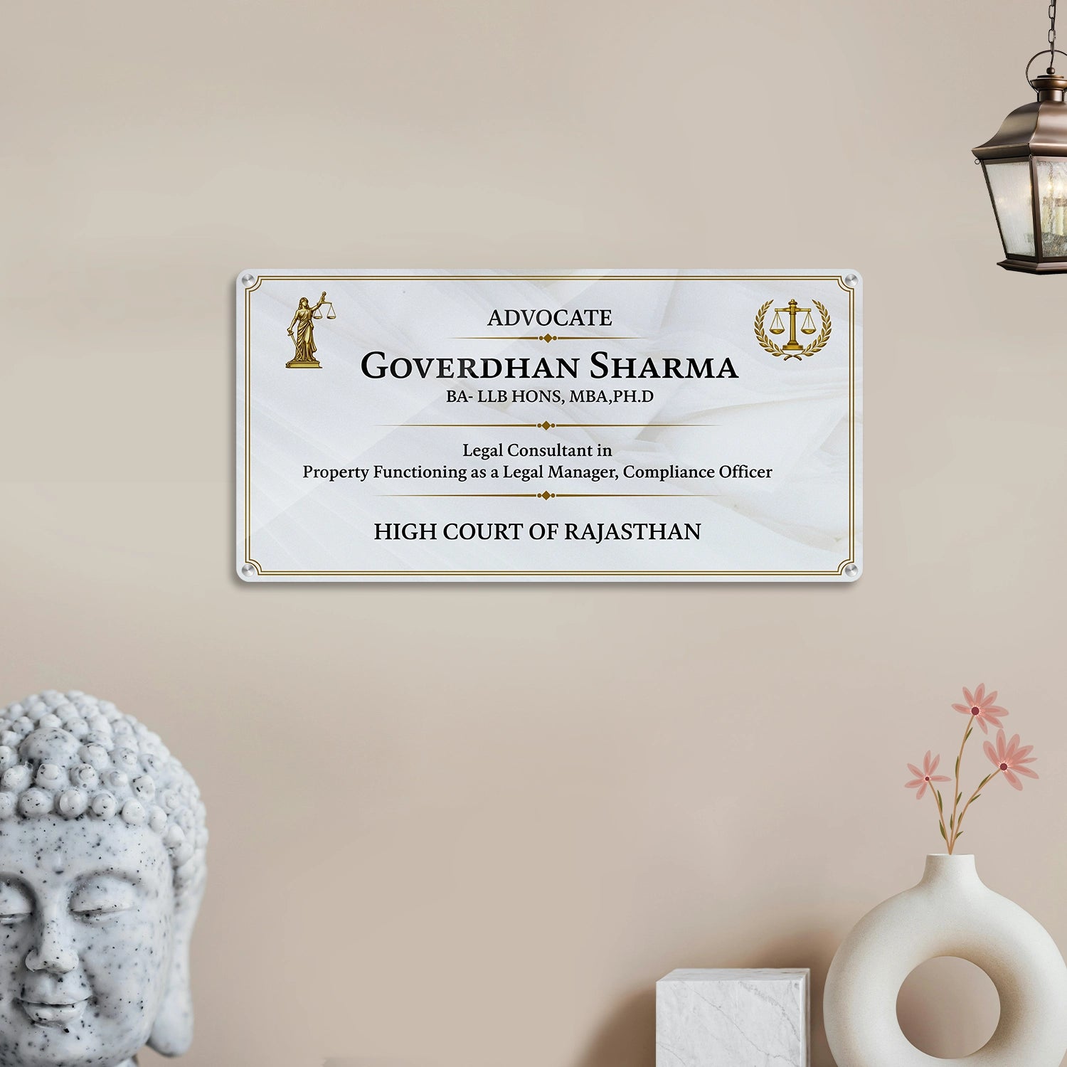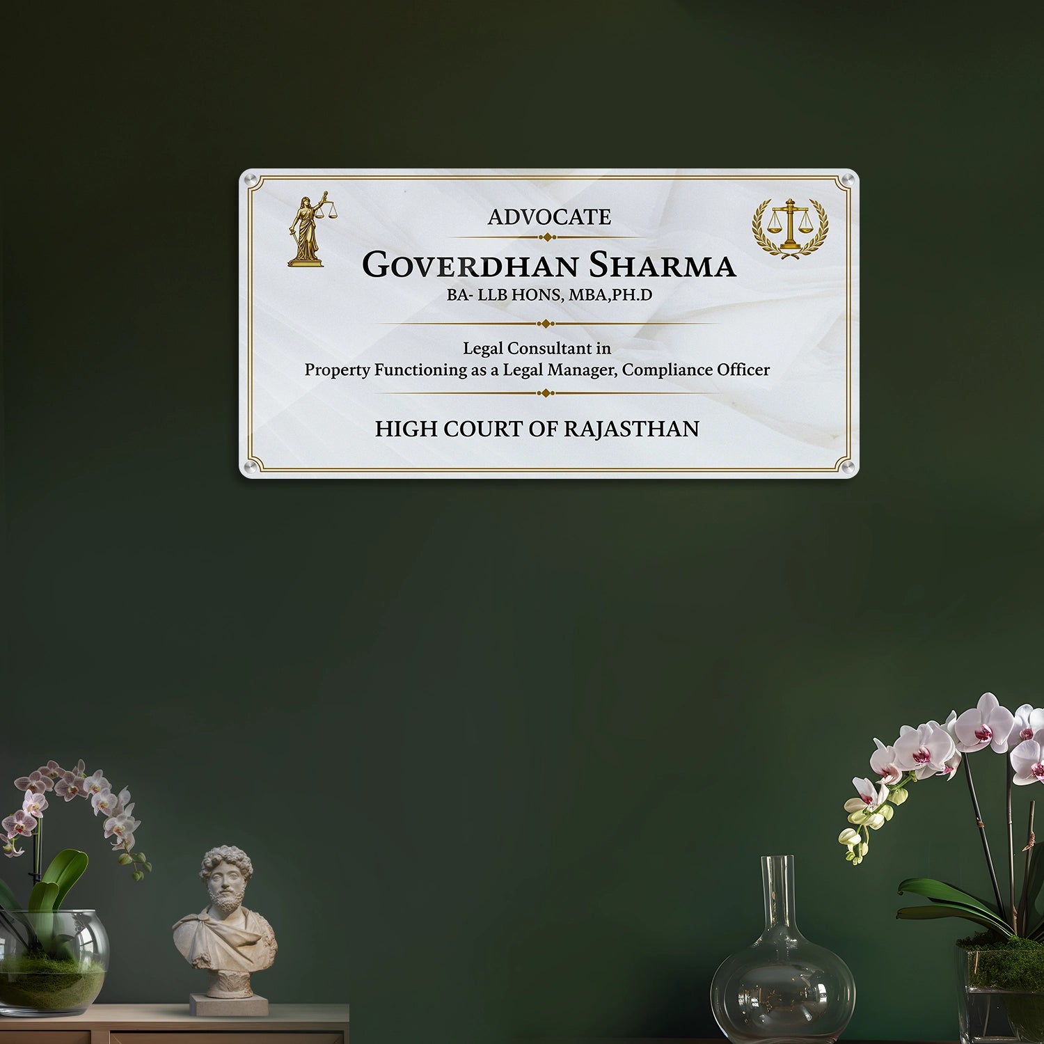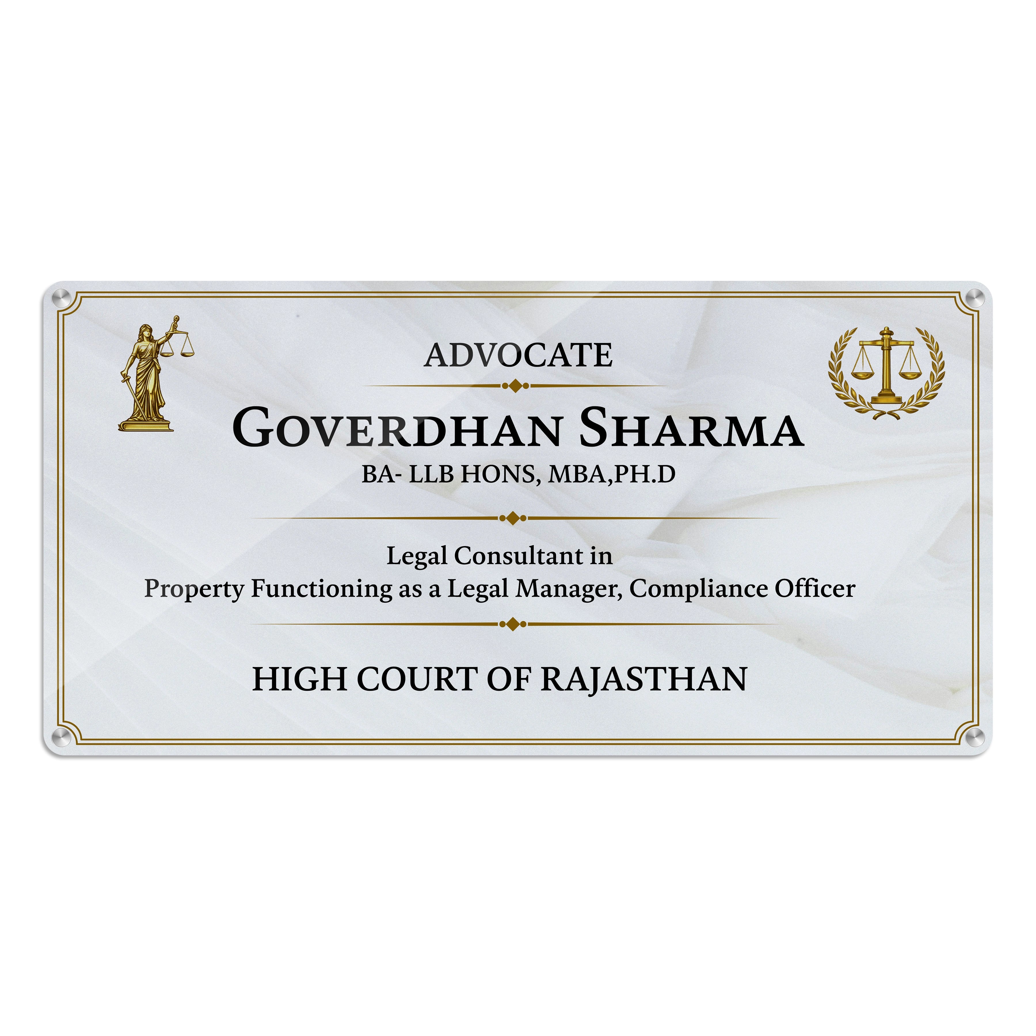 Personalized Advocate Name Plate with Degree Details and Golden Justice Symbol