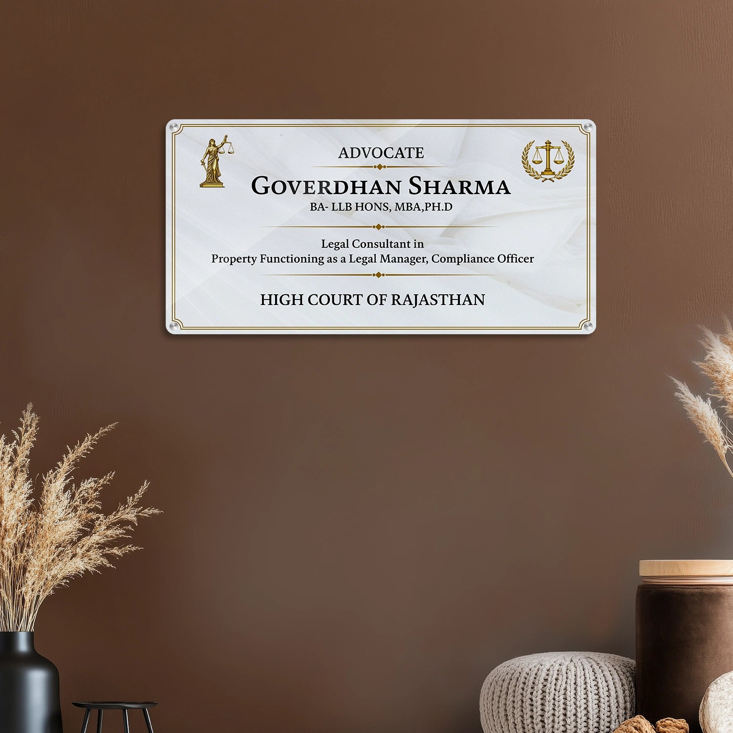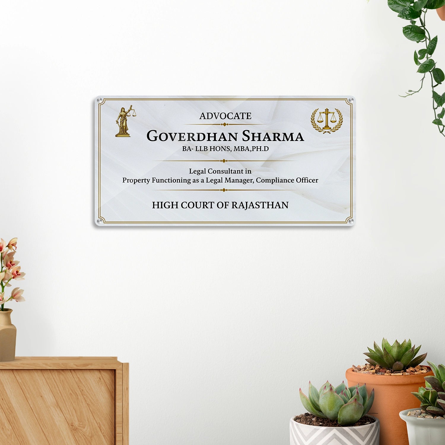 Welcome clients and visitors with a professional touch. Our Personalized Advocate Name Plate with Degree Details and Golden Justice Symbol are designed to display all essential business information while adding a polished and sophisticated look to your workspace.