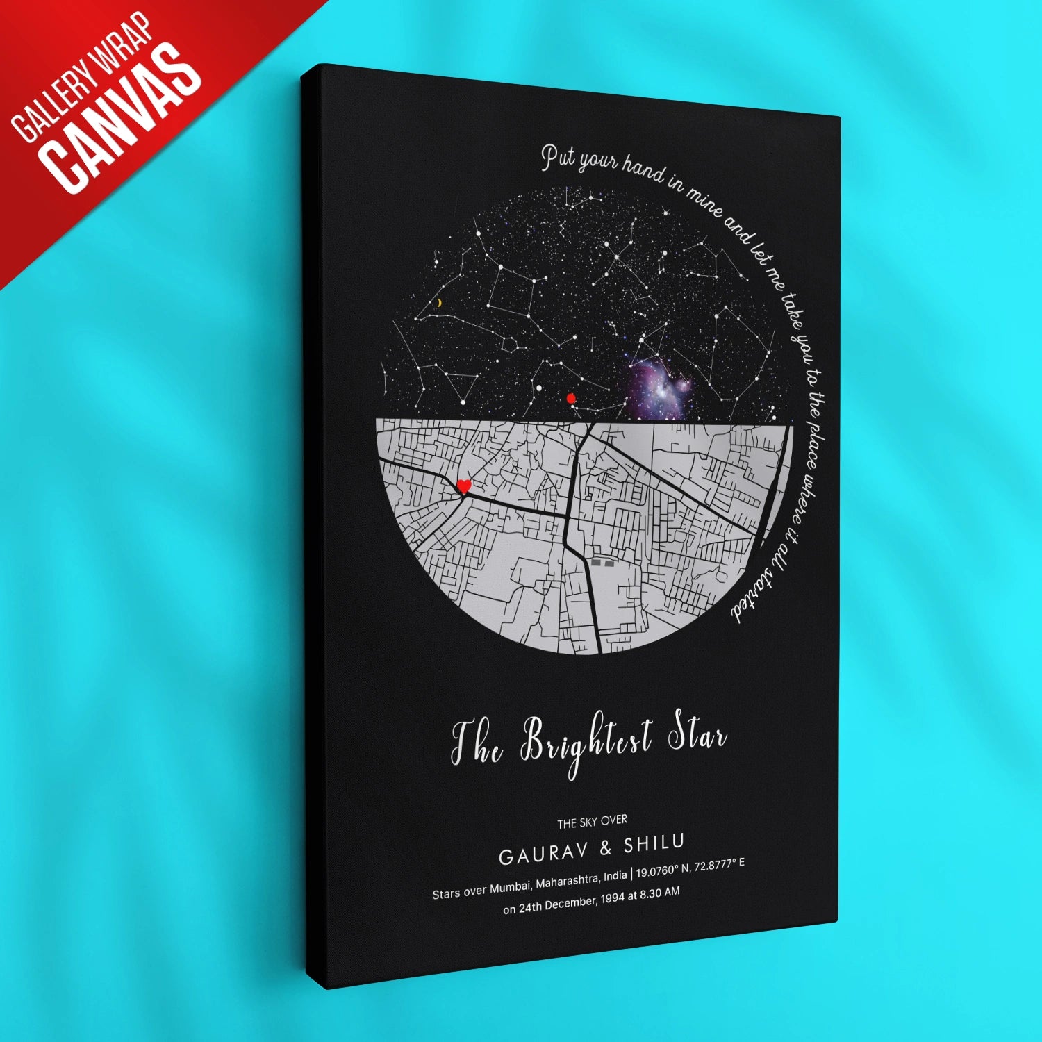 This artwork blends celestial beauty with geographic precision to celebrate life’s most important moments. The star map captures the cosmic wonder of your special day, while the location map pinpoints where it all unfolded, combining to create a powerful visual narrative. Available as a framed print or gallery-wrapped canvas in various sizes, this artwork not only enhances your living space but also serves as a daily reminder of the moments and places that have shaped your journey. It’s more than art—it’s a connection to your most meaningful memories.