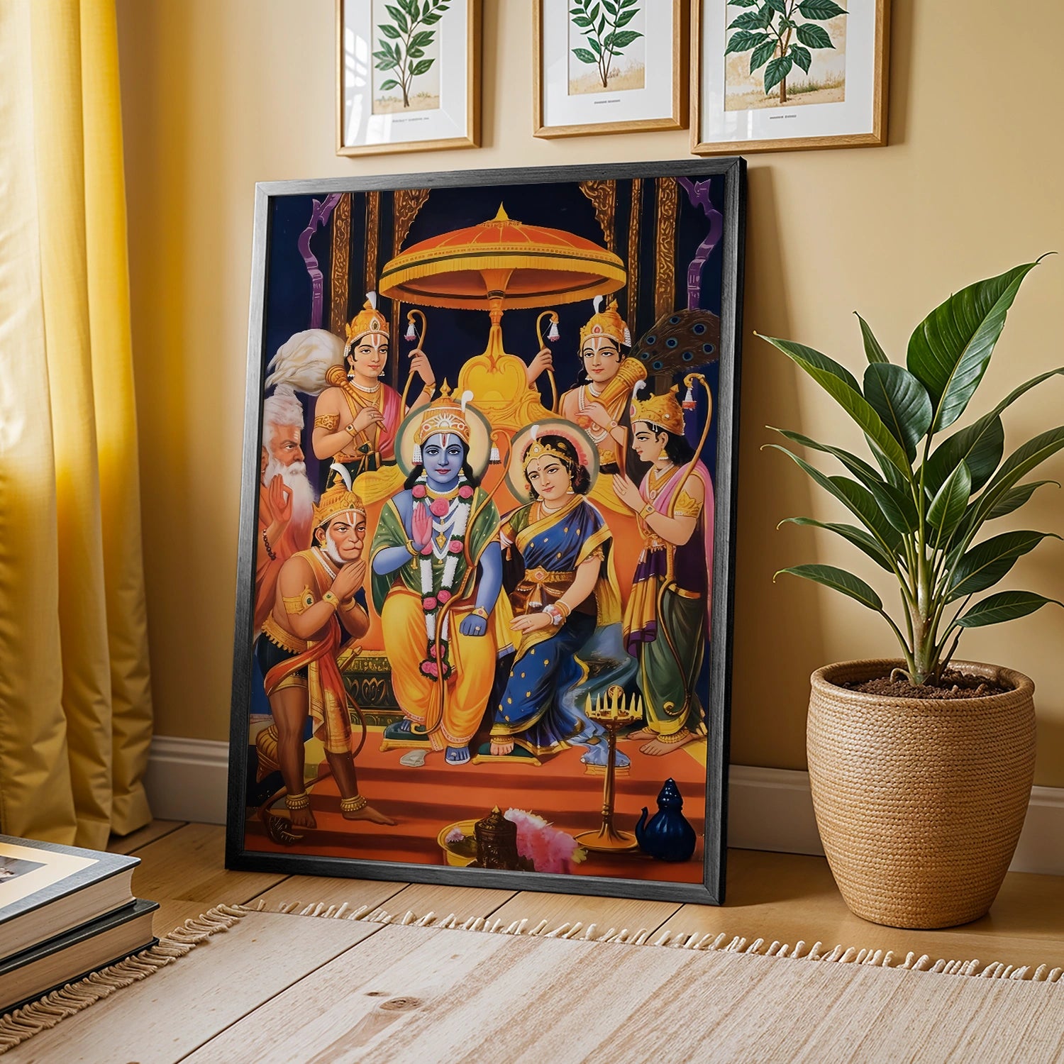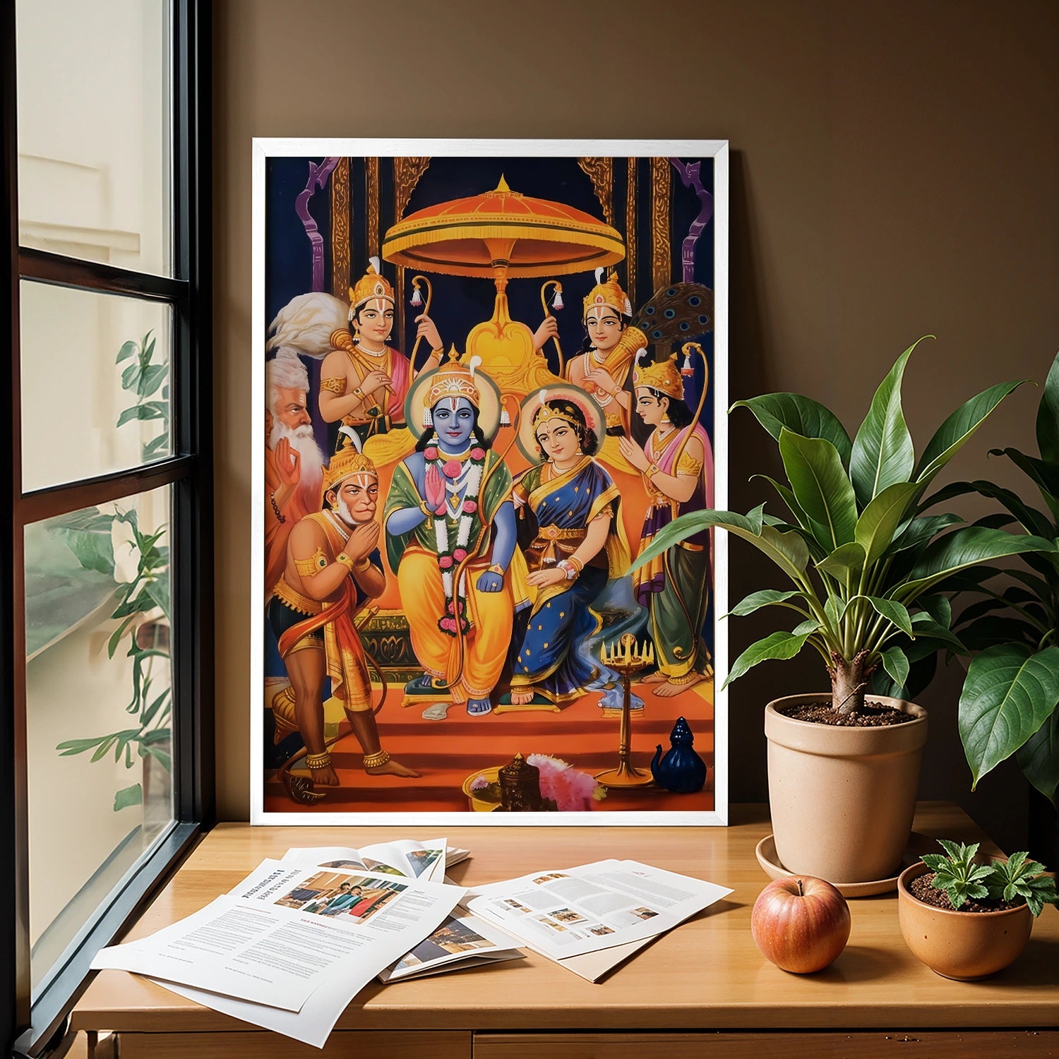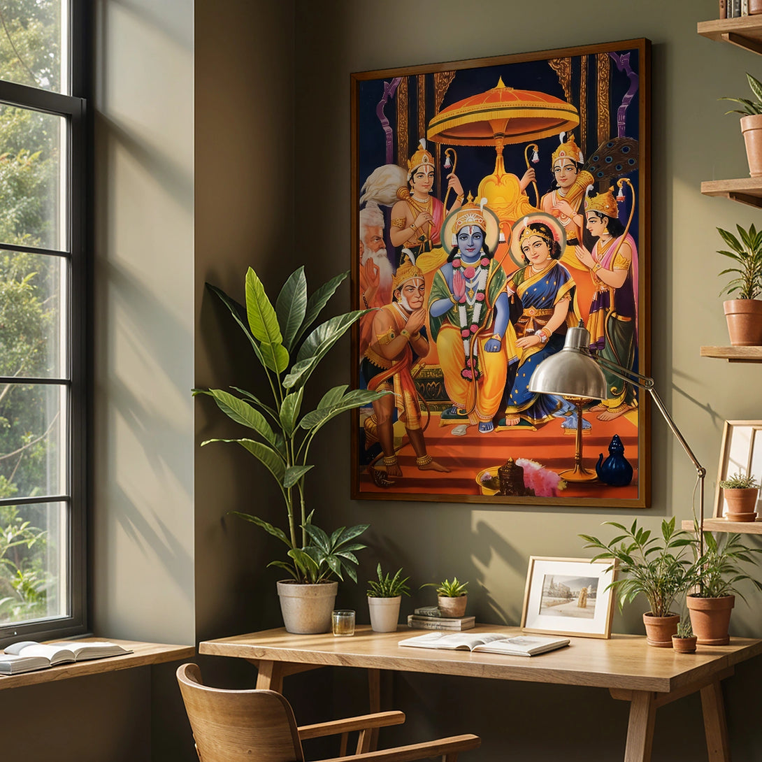 Step into divine serenity with Ram Darbar Divine Painting, a sacred portrayal of Lord Ram and Goddess Sita seated gracefully on their throne, surrounded by Lakshman, Bharat, Shatrughna, and the ever-devoted Hanuman Ji. This timeless scene celebrates the eternal values of love, loyalty, righteousness, and unity, radiating the pure essence of Sanatan Dharma. Each detail, from the golden throne to the tranquil expressions, has been artistically crafted to capture the celestial glory of Ayodhya’s divine court.