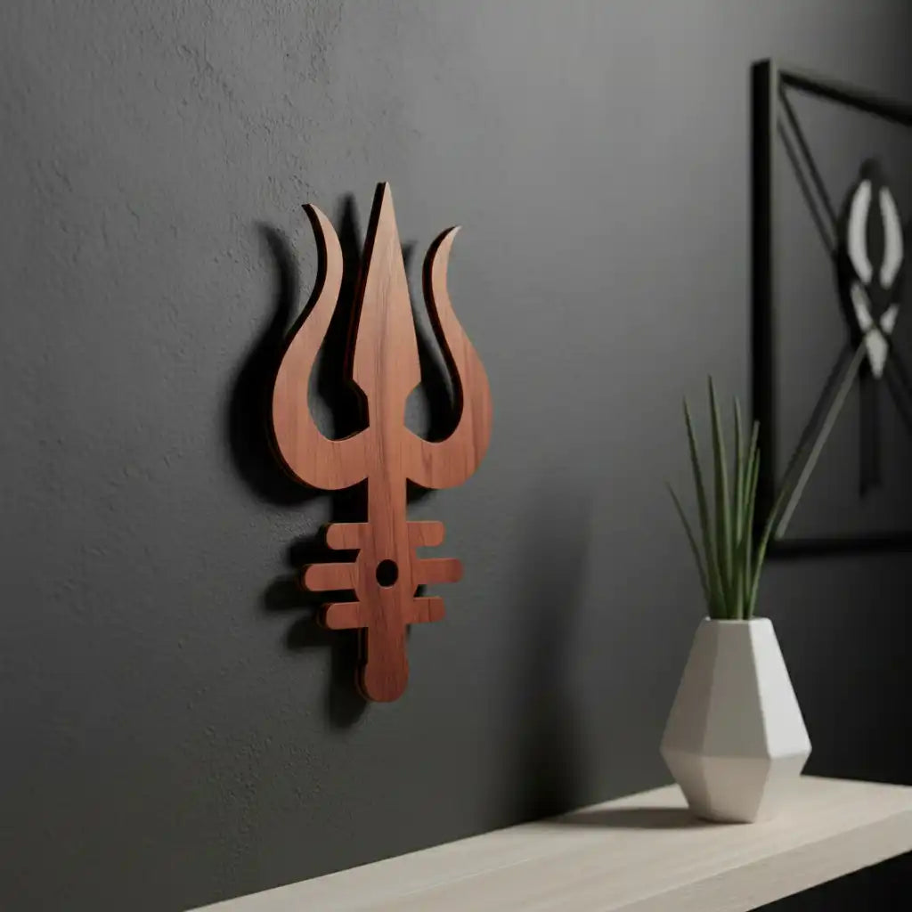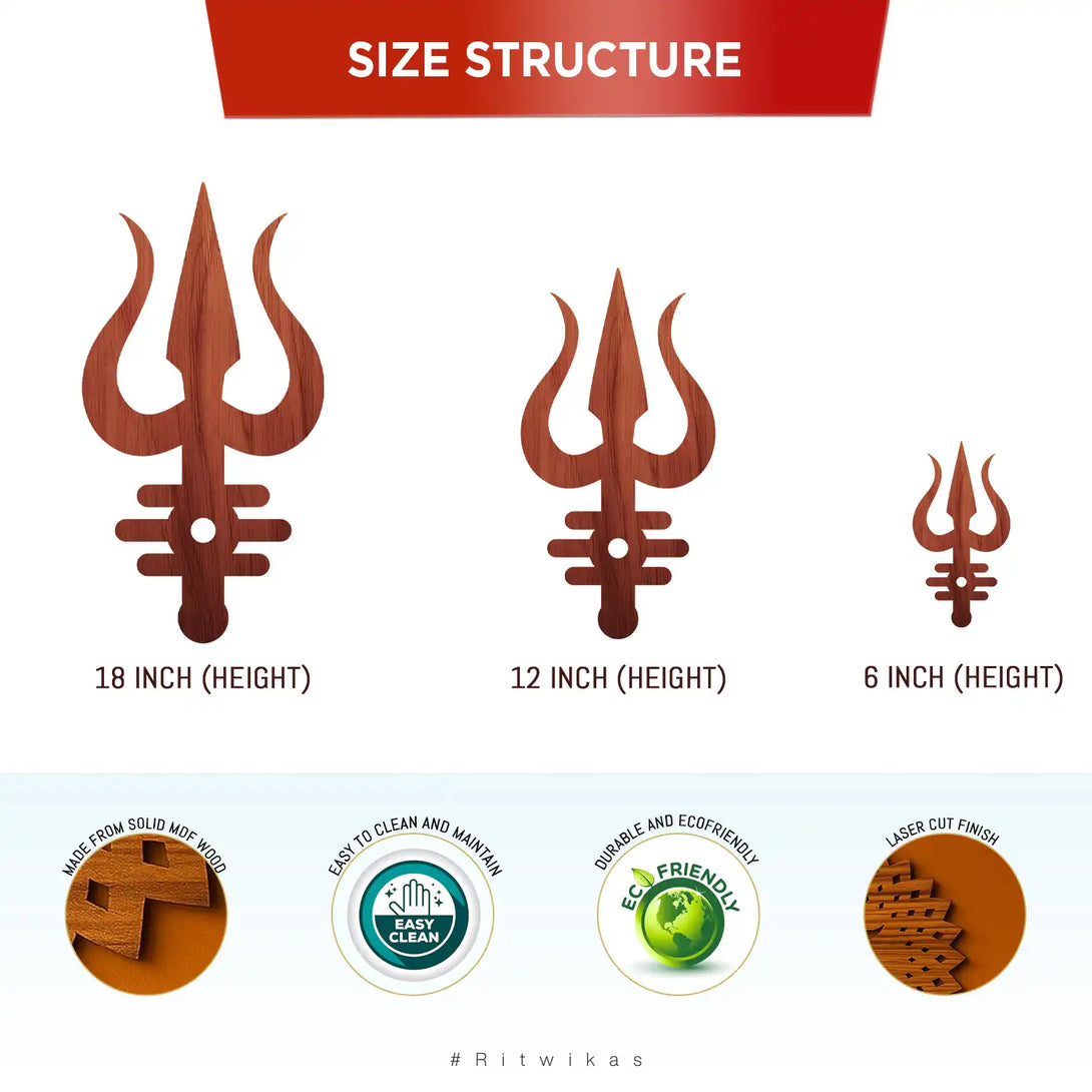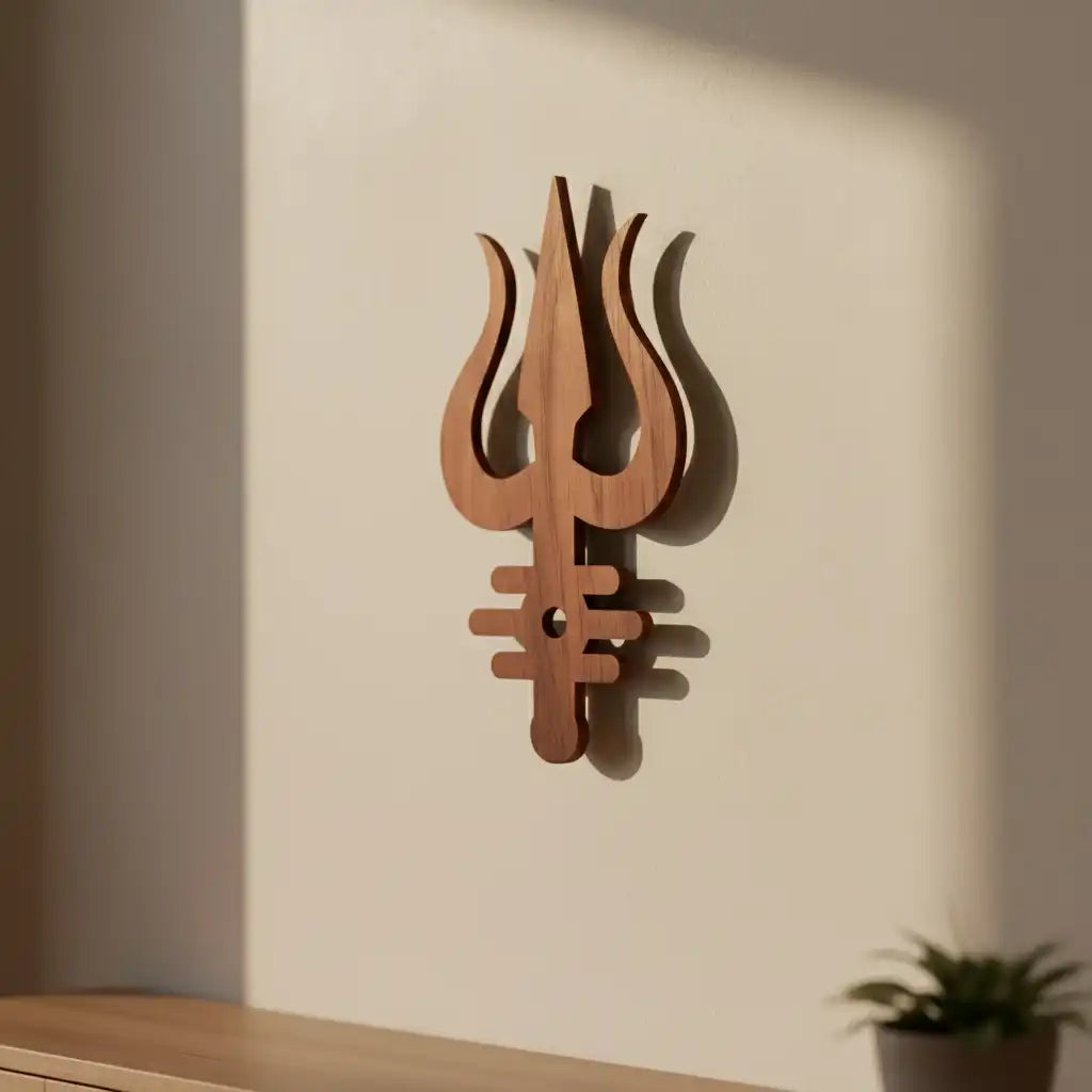 Transform your spiritual sanctuary with this exquisitely carved wooden Shiva's Trishul Tripund Tilak wall art. This masterfully designed piece honors the sacred trinity of Lord Shiva's symbols, blending profound spiritual meaning with contemporary home décor. The intricate cutout work reveals exceptional craftsmanship, capturing the essence of Hindu devotional art. Perfect for temples, prayer alcoves, or meditation corners, this wall hanging radiates divine presence while complementing modern and traditional interiors alike. Choose from three dimensions—6, 12, or 18 inches in height—to suit your space perfectly. Crafted from premium wood with meticulous attention to detail, it serves as both a meaningful spiritual anchor and an artistic expression of faith.
