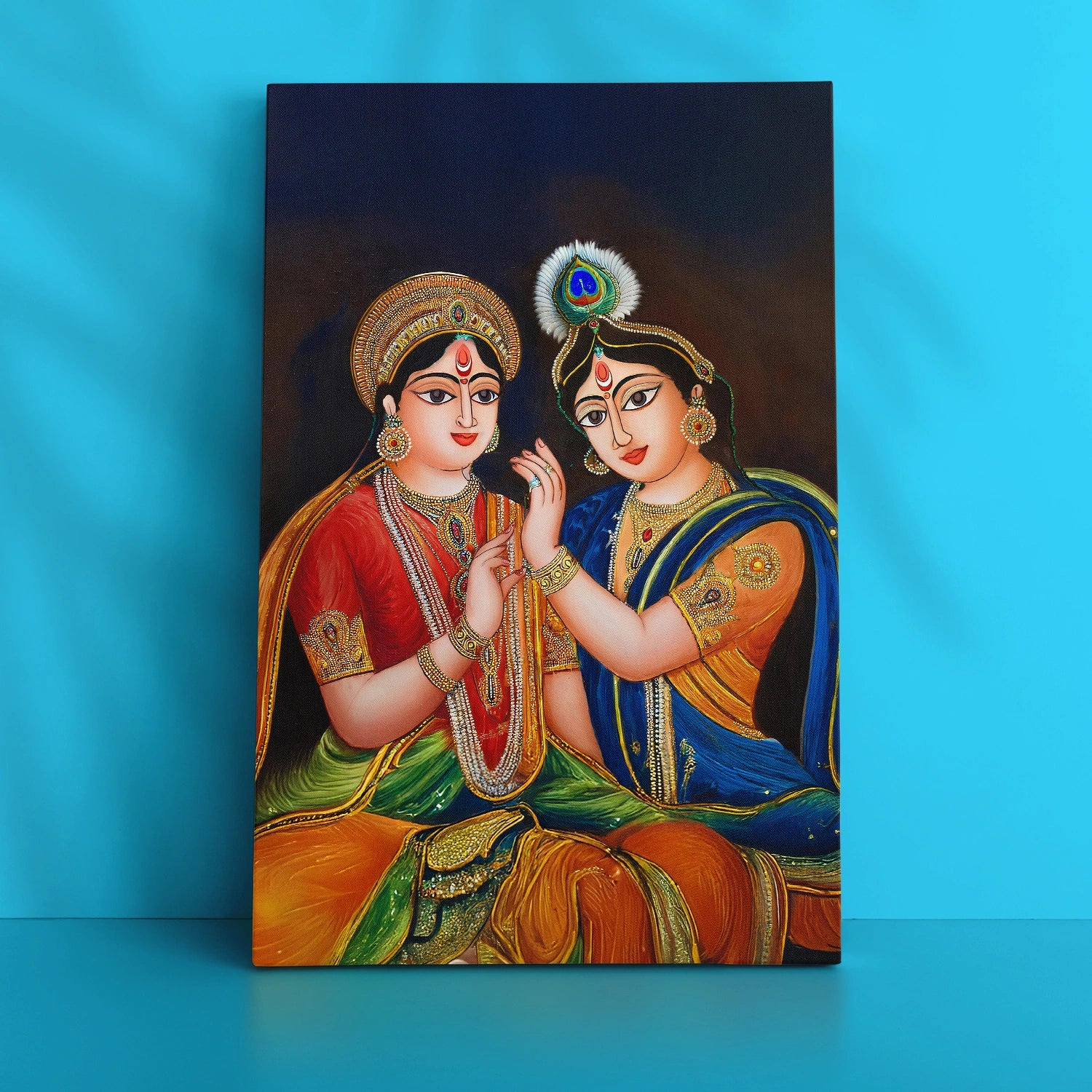 Ritwika's Radha Krishna Tanjore styled painting is a stunning depiction of the divine love between Lord Krishna and Radha, captured through intricate craftsmanship and vibrant colors. The traditional Tanjore style, known for its rich texture and depth, is brought to life with the use of gold foil and stone embellishments, adding a radiant, almost ethereal glow to the figures. Radha and Krishna are portrayed in a moment of serene harmony, surrounded by delicate floral patterns and ornate details, symbolizing the spiritual unity and devotion between them. The combination of fine artistry and sacred symbolism in Ritwika's painting creates a timeless, captivating piece that invites both admiration and devotion.