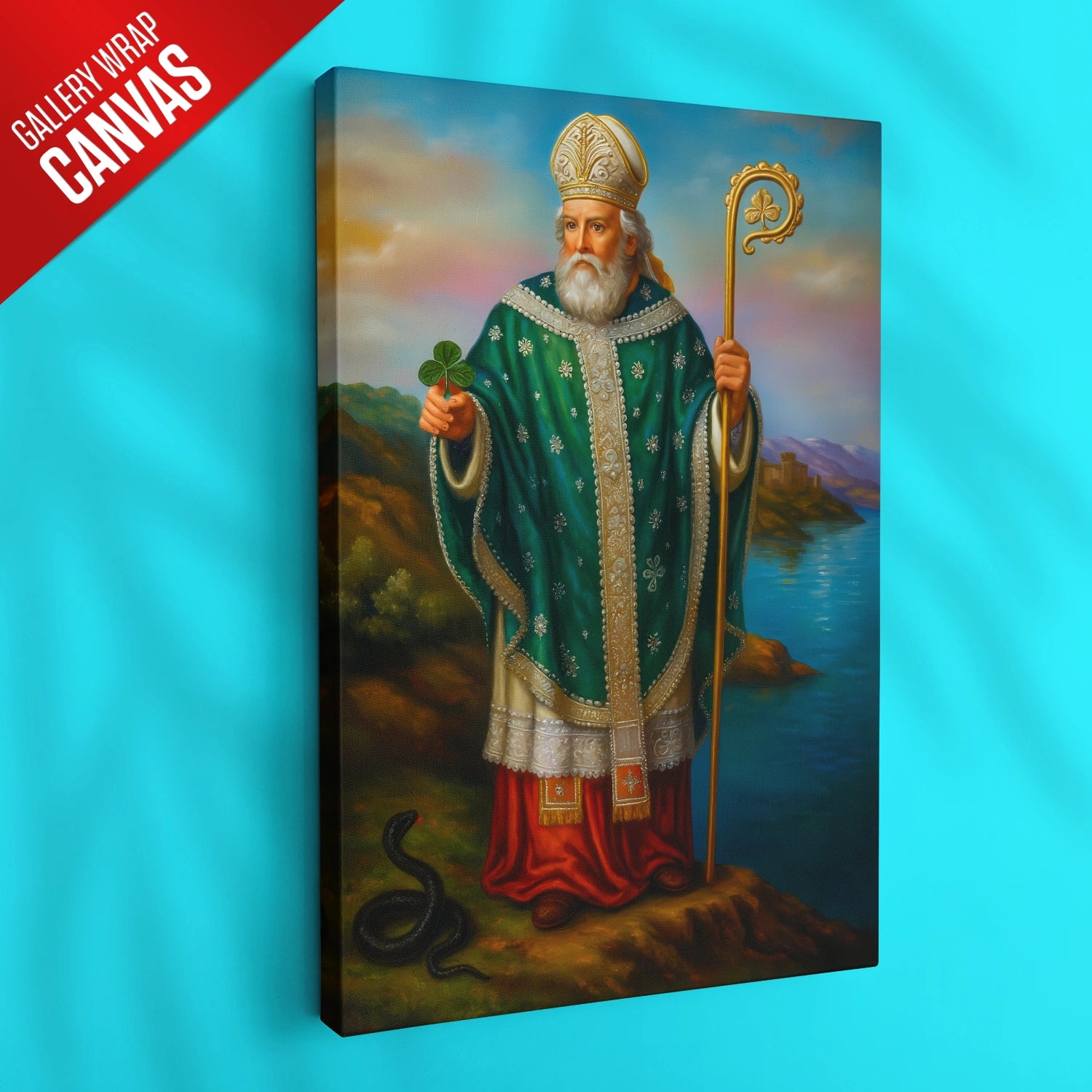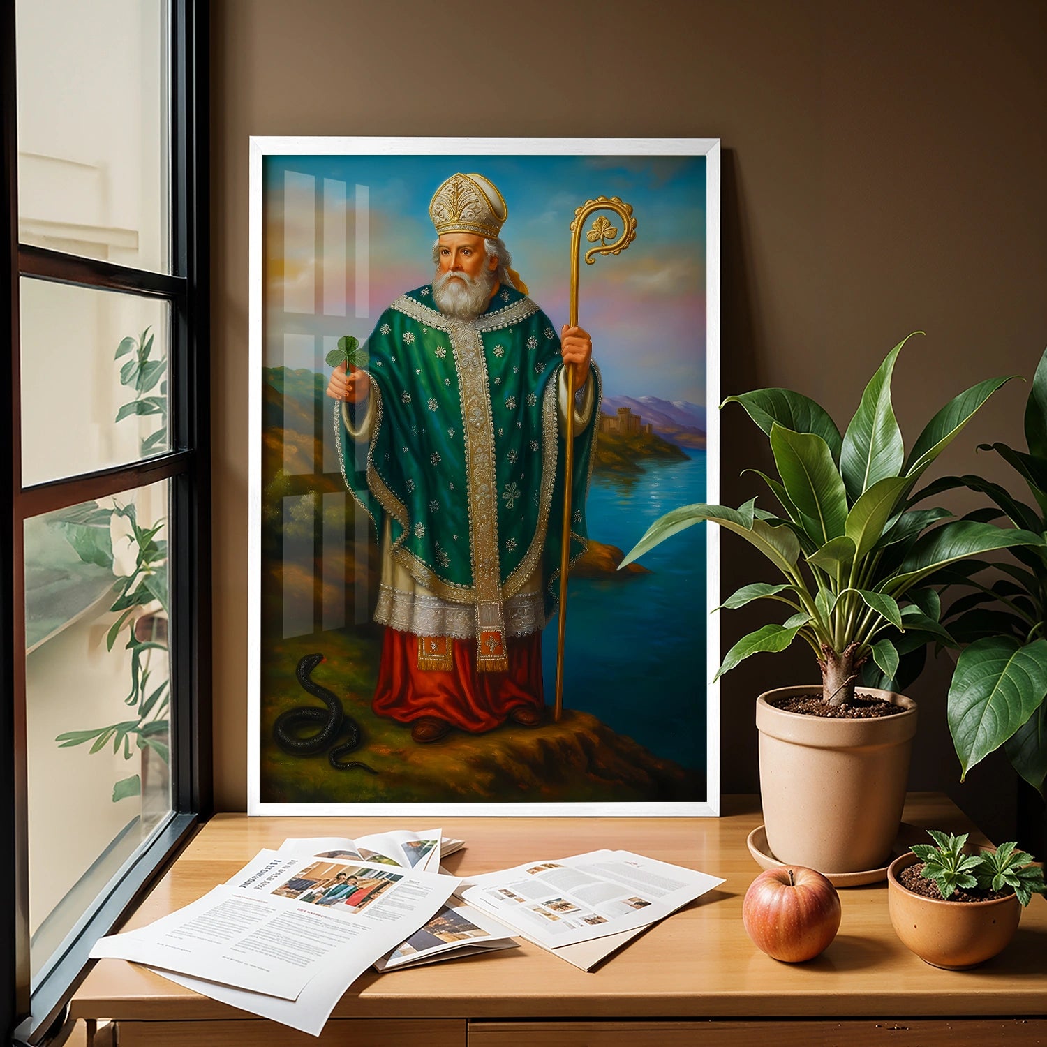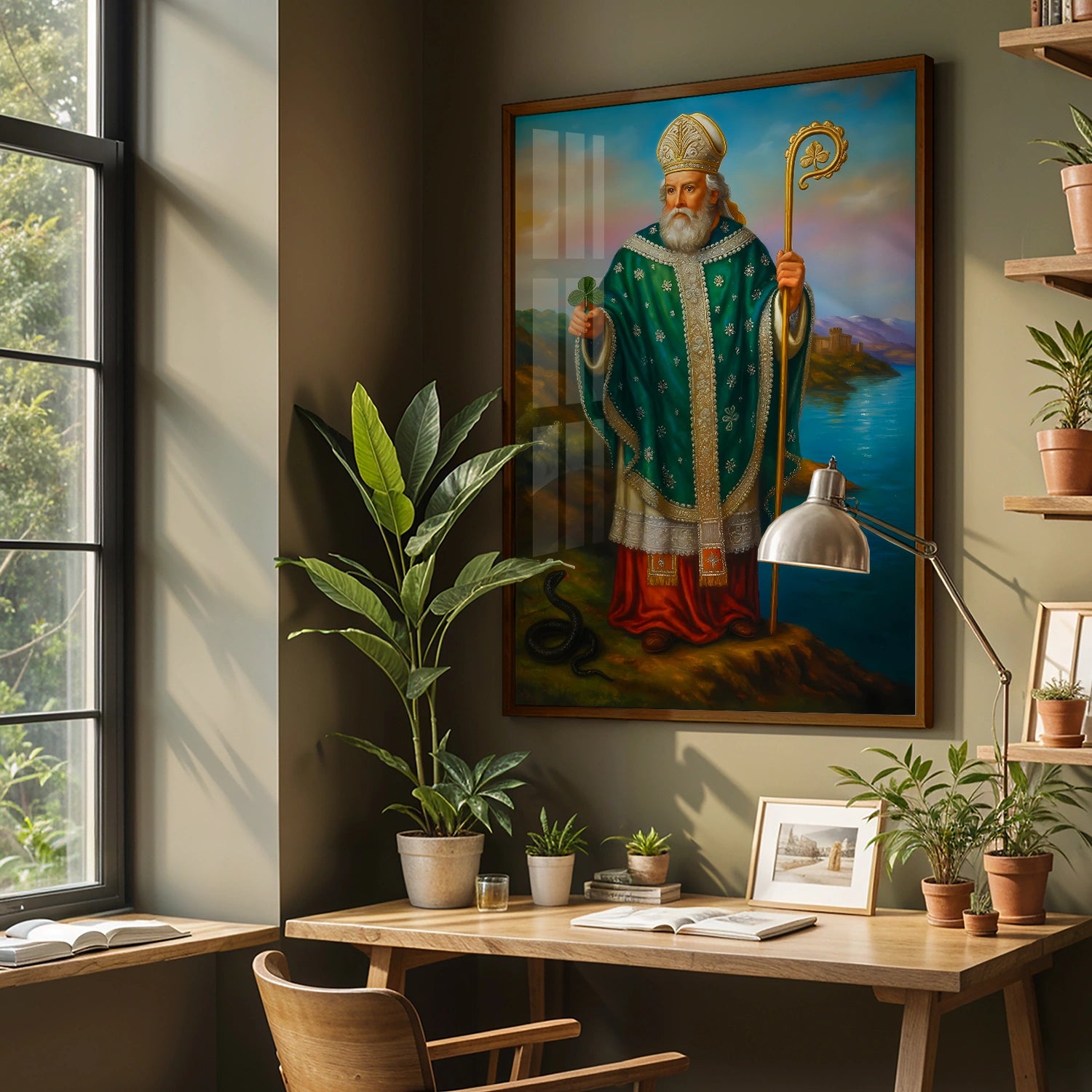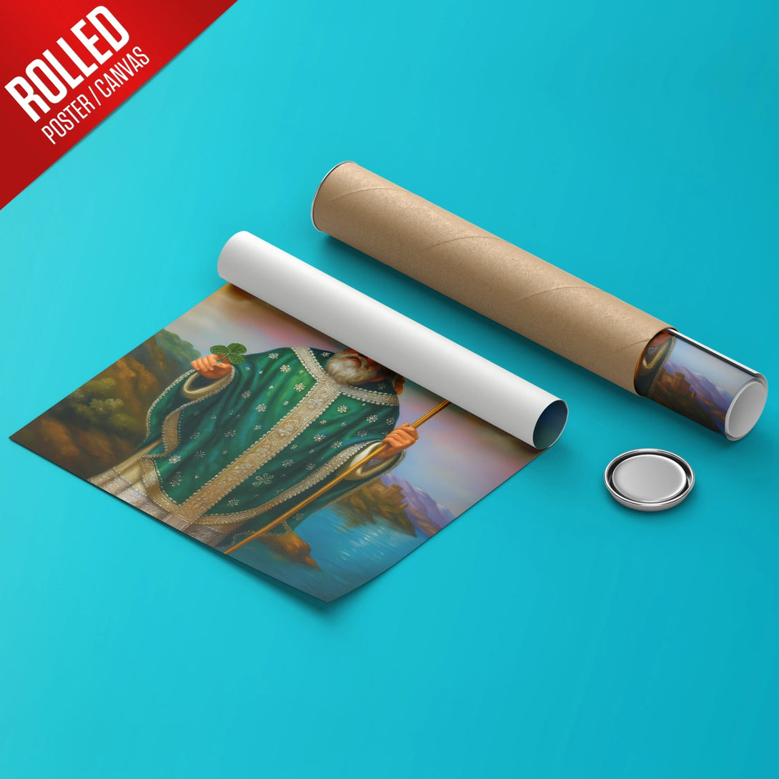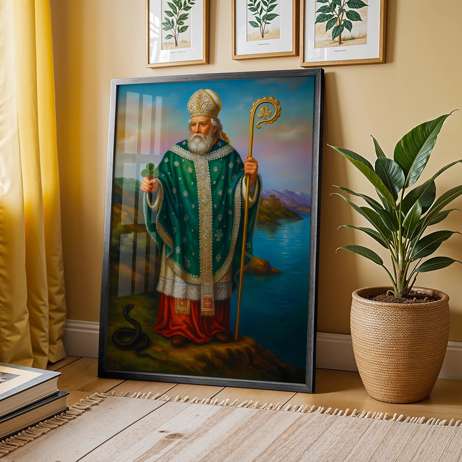 This St. Patrick–inspired artwork captures the legendary figure in a moment of serene power — holding the shamrock, standing above the rolling Irish landscape, and radiating wisdom through every fold of his ornate green cloak. The scene is painted with vivid detail, from the golden crosier to the calm waters behind him, creating a visually rich masterpiece that reflects centuries of cultural symbolism. Whether you're drawn to Irish history, spiritual art, or meaningful decor, this artwork brings a sense of heritage and strength into any room.