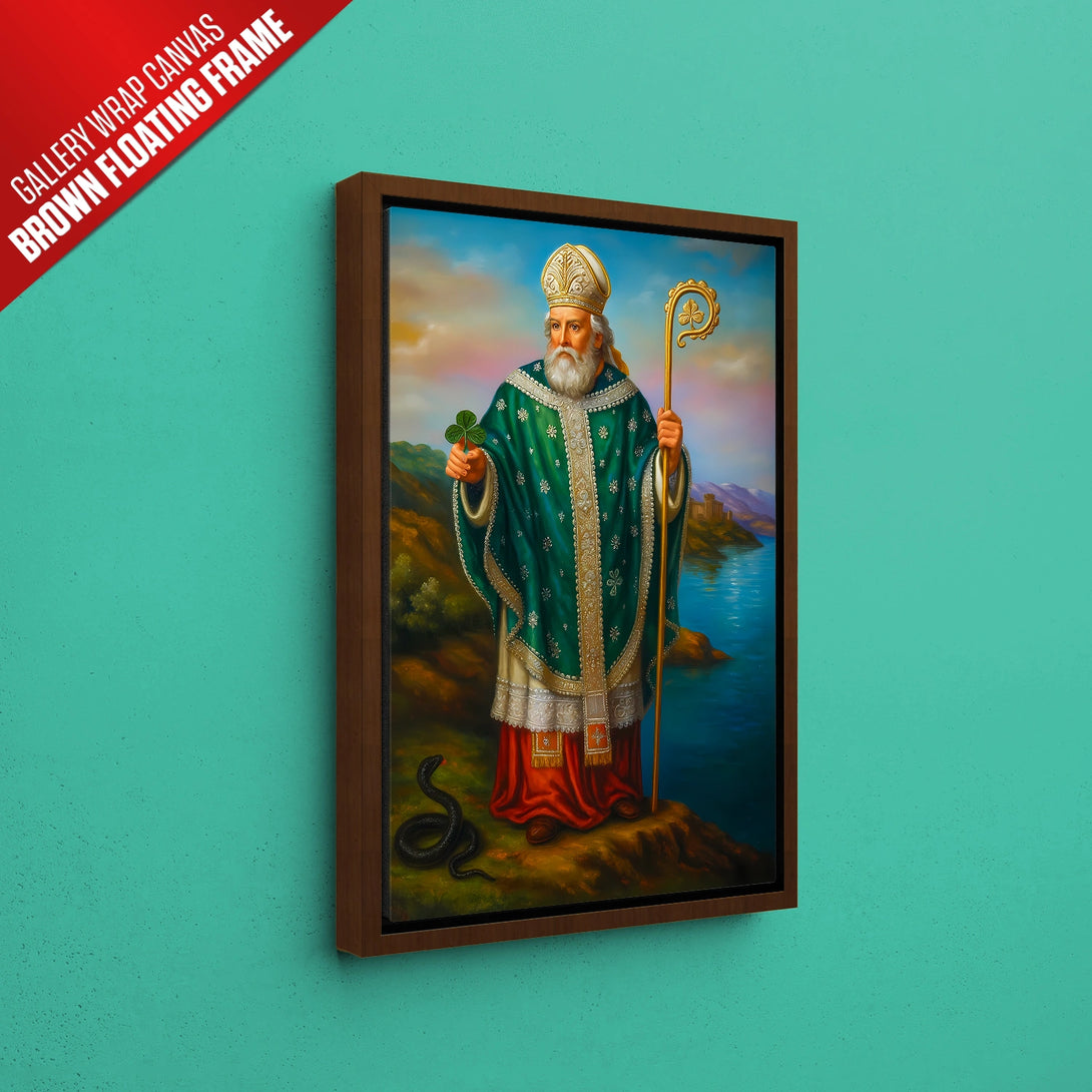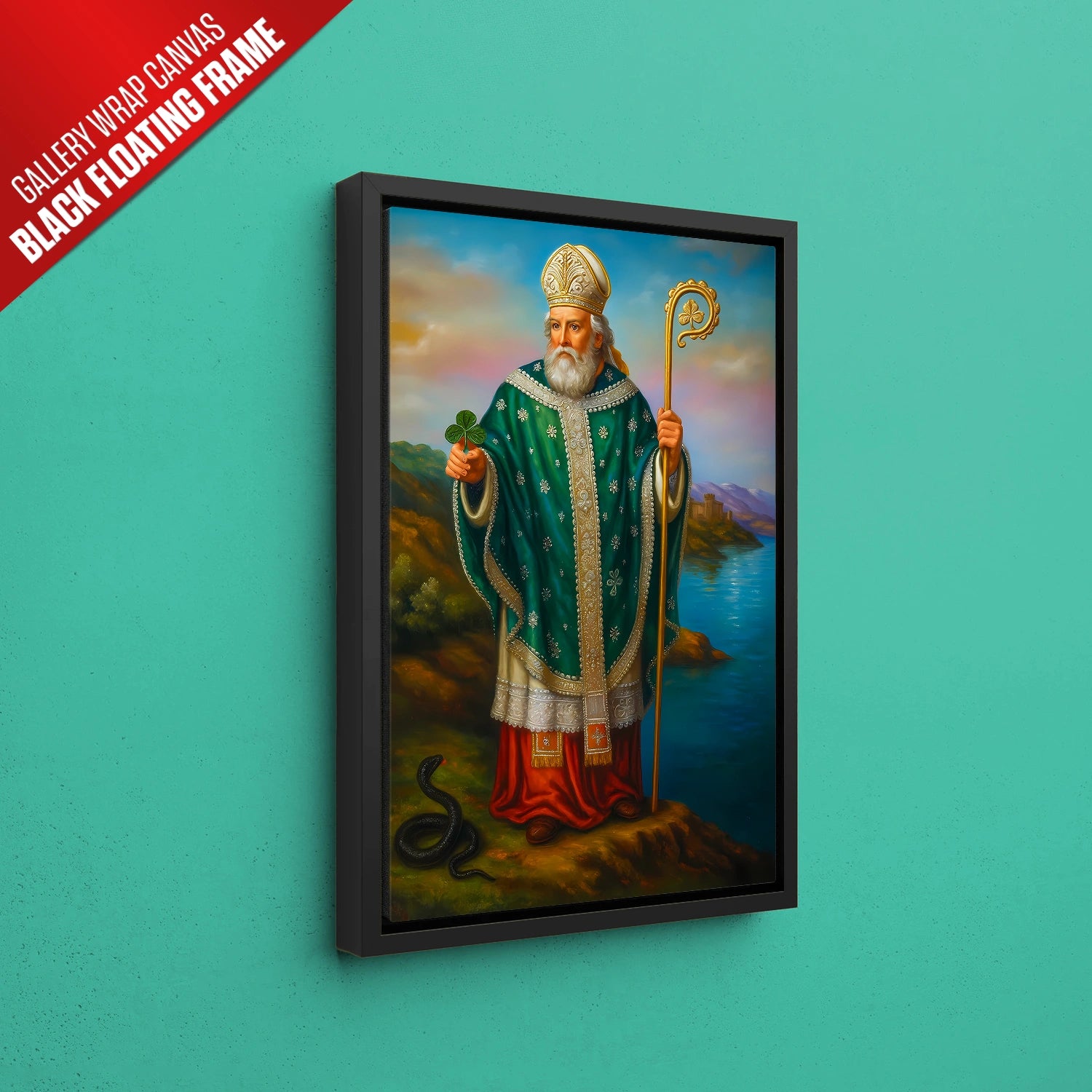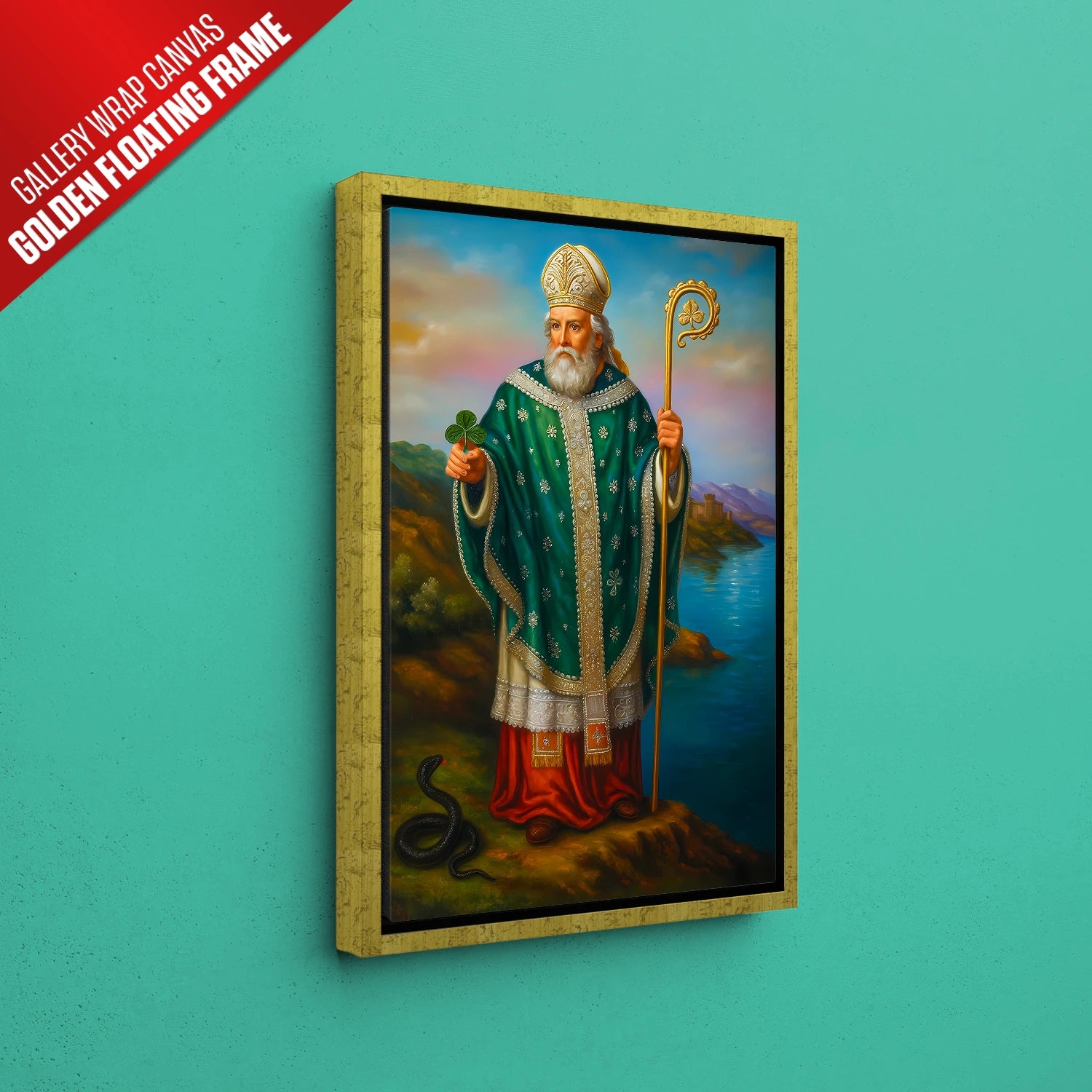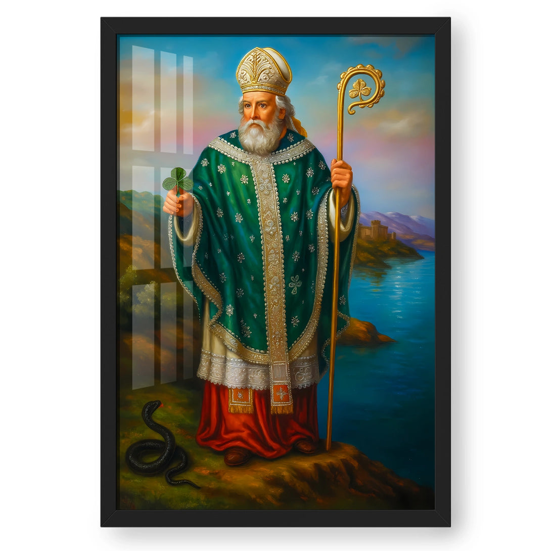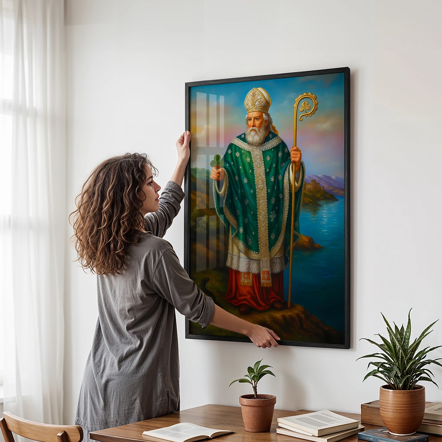 This St. Patrick–inspired artwork captures the legendary figure in a moment of serene power — holding the shamrock, standing above the rolling Irish landscape, and radiating wisdom through every fold of his ornate green cloak. The scene is painted with vivid detail, from the golden crosier to the calm waters behind him, creating a visually rich masterpiece that reflects centuries of cultural symbolism. Whether you're drawn to Irish history, spiritual art, or meaningful decor, this artwork brings a sense of heritage and strength into any room.