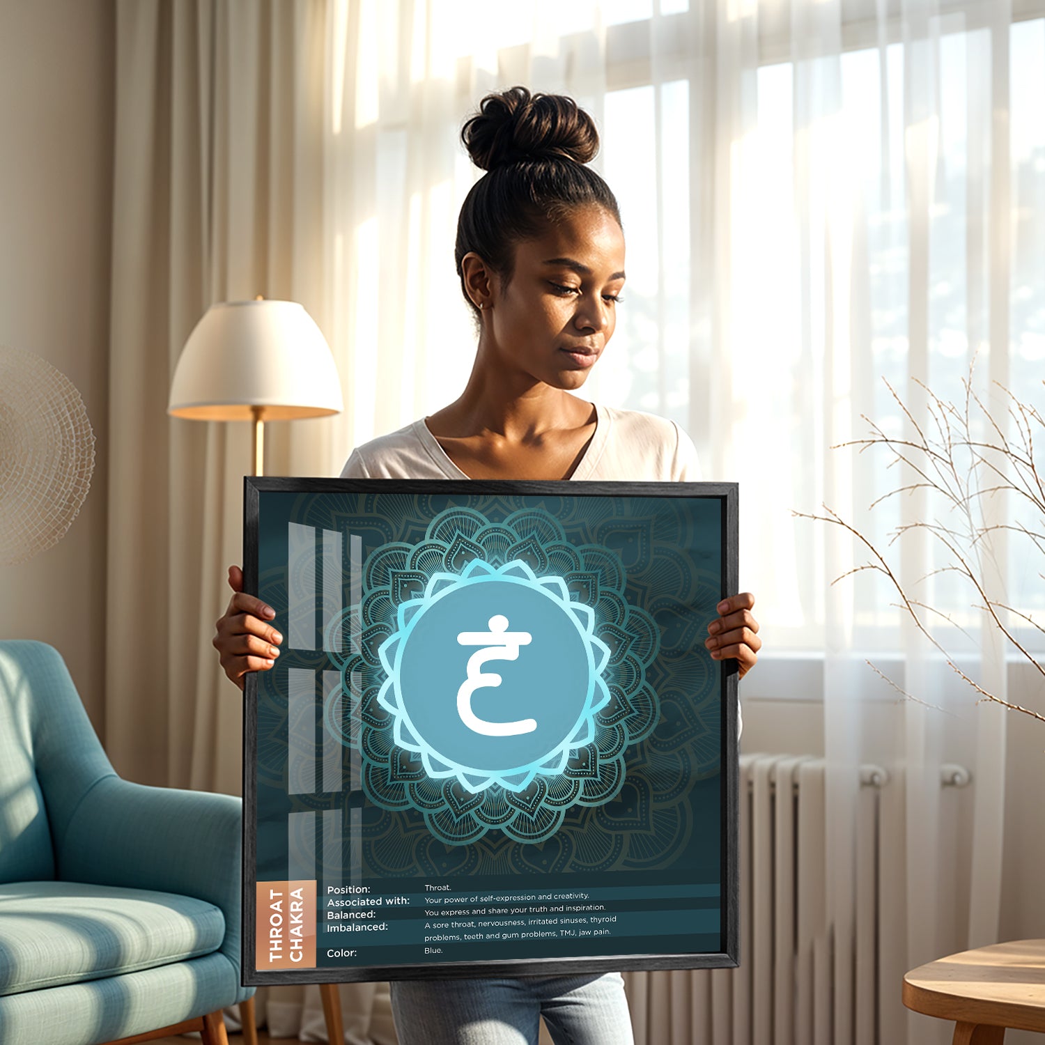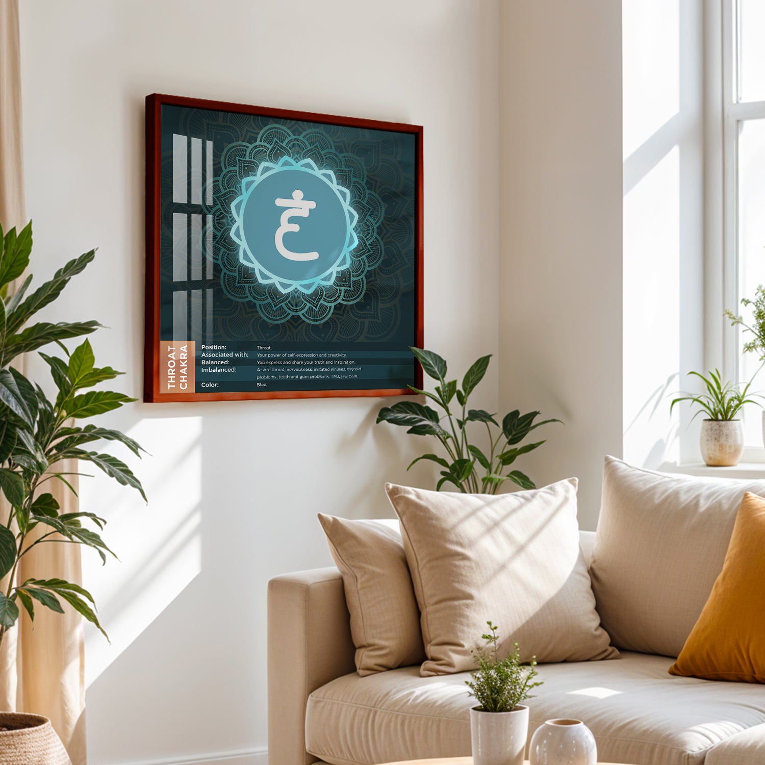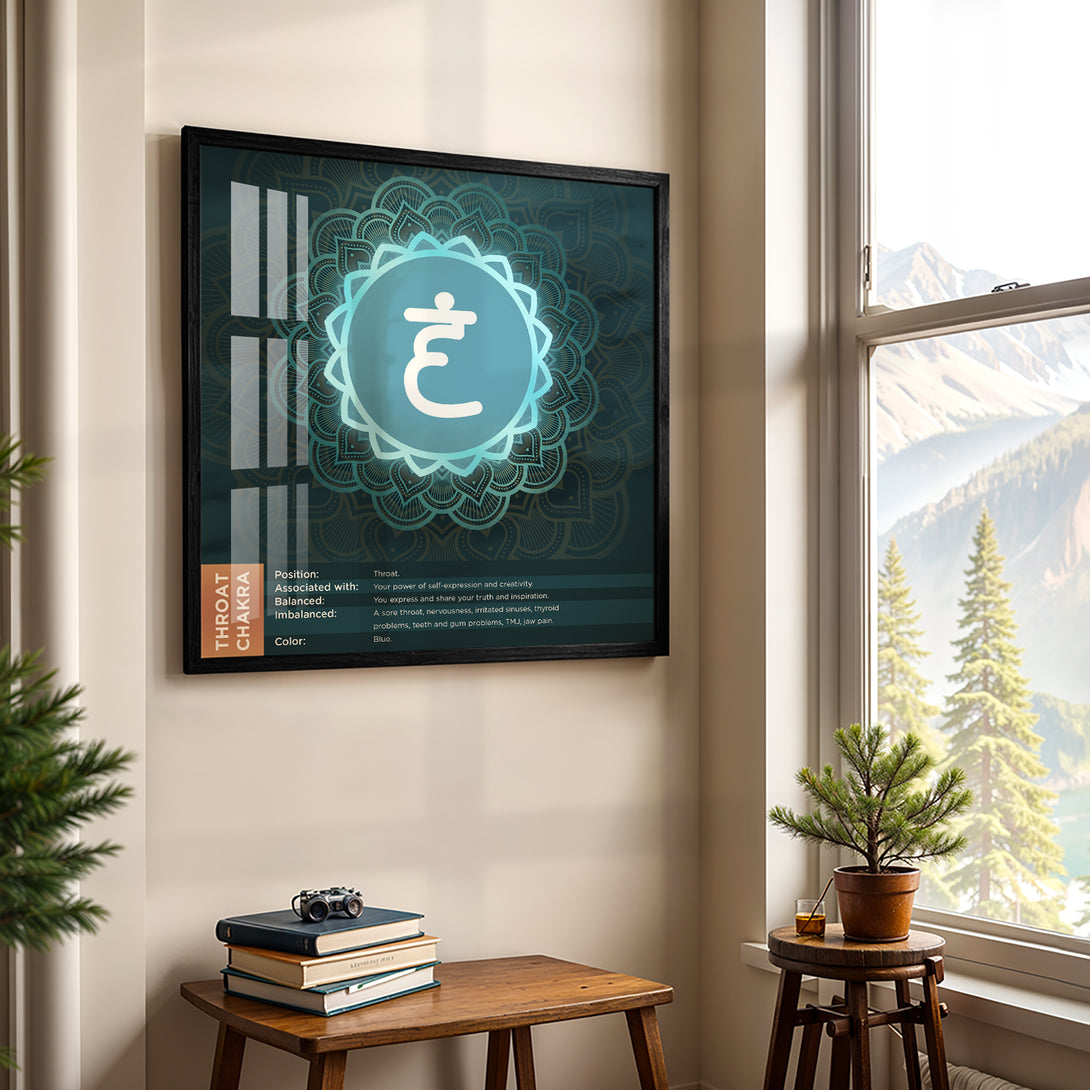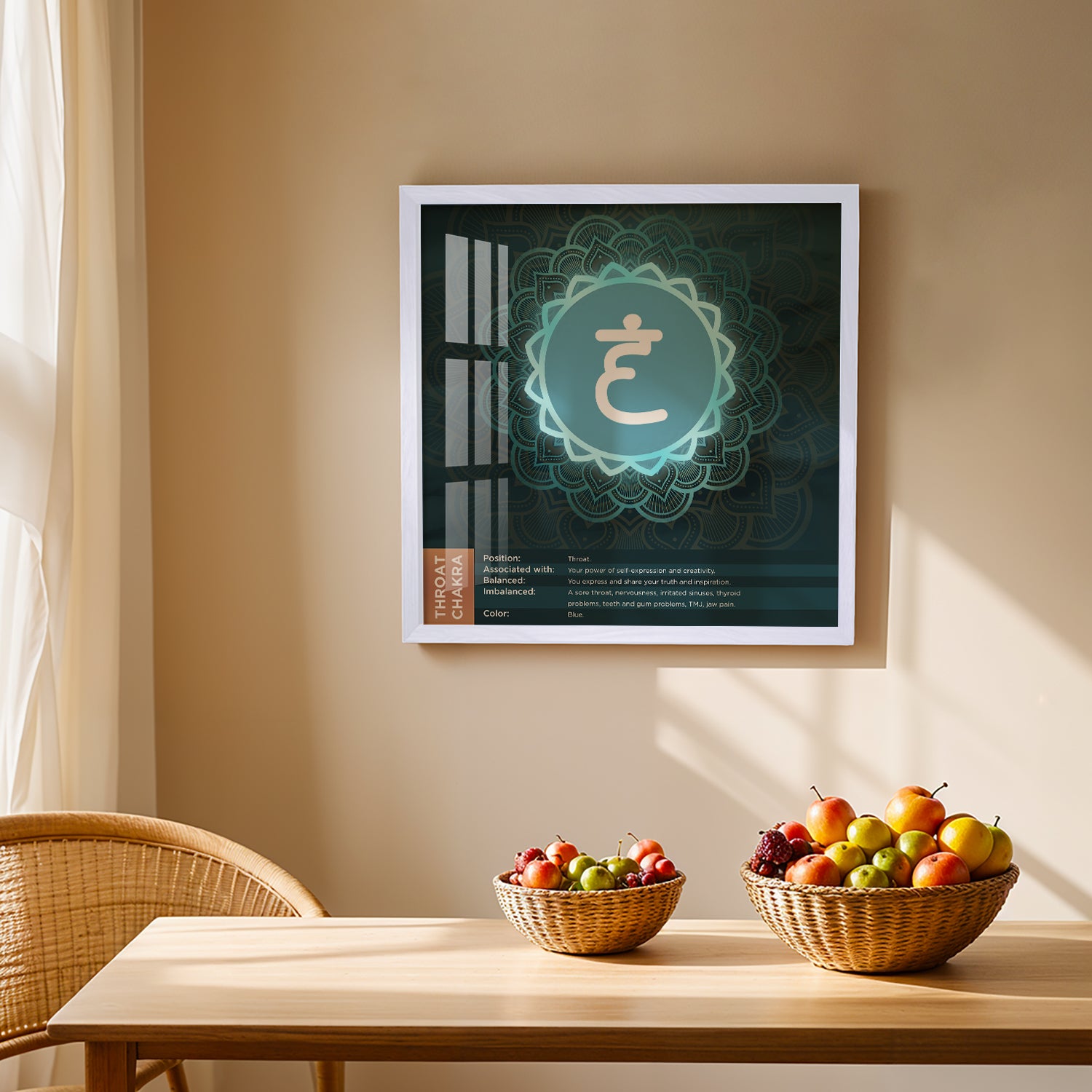 This Throat Chakra (Vishuddha) mandala artwork with the HAM beej mantra highlights shades of turquoise and blue, symbolizing clarity and expression. A striking choice for creative spaces, studios, or meditation areas, it encourages calm and focus. Available in framed, canvas, and poster prints, this artwork also makes a thoughtful gift for art and décor lovers.