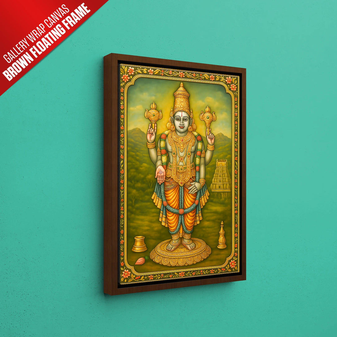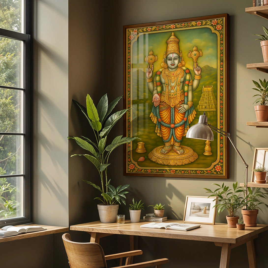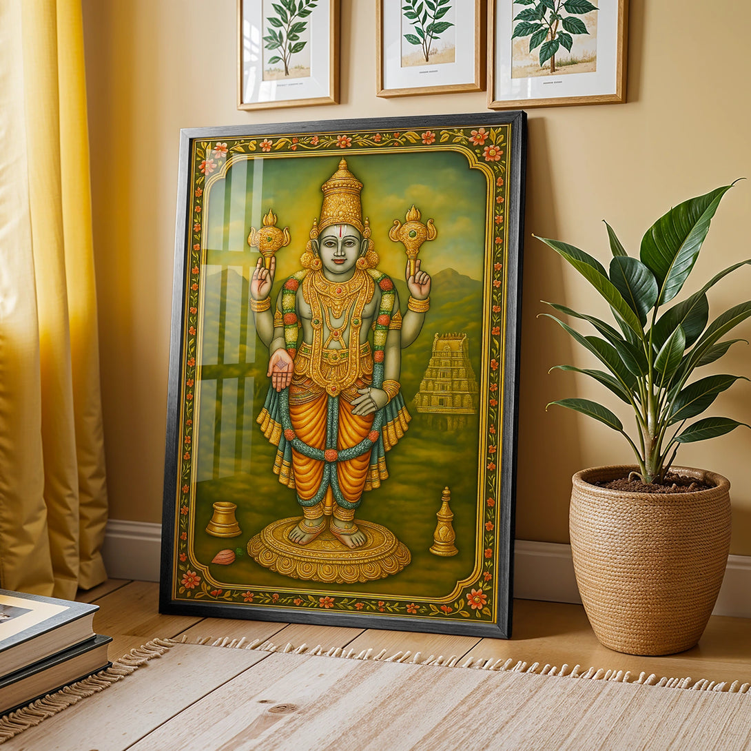 Immerse yourself in the divine aura of Lord Chaturbuja Vishnu with this exquisite artwork, inspired by rich spiritual traditions. Crafted with vibrant colors and intricate detailing, this piece beautifully captures the serene and powerful presence of Vishnu, the protector and sustainer of the universe. Every fan of spiritual art must adorn their living space with this captivating depiction, creating a peaceful and divine ambiance. Whether for your own home or as a heartfelt gift, this artwork elevates any area—be it your living room, prayer room, or office. Available in stunning poster prints, luxurious gallery wrap canvases, and elegant frames in black, white, or dark brown, this piece promises to be a timeless addition to your collection.
