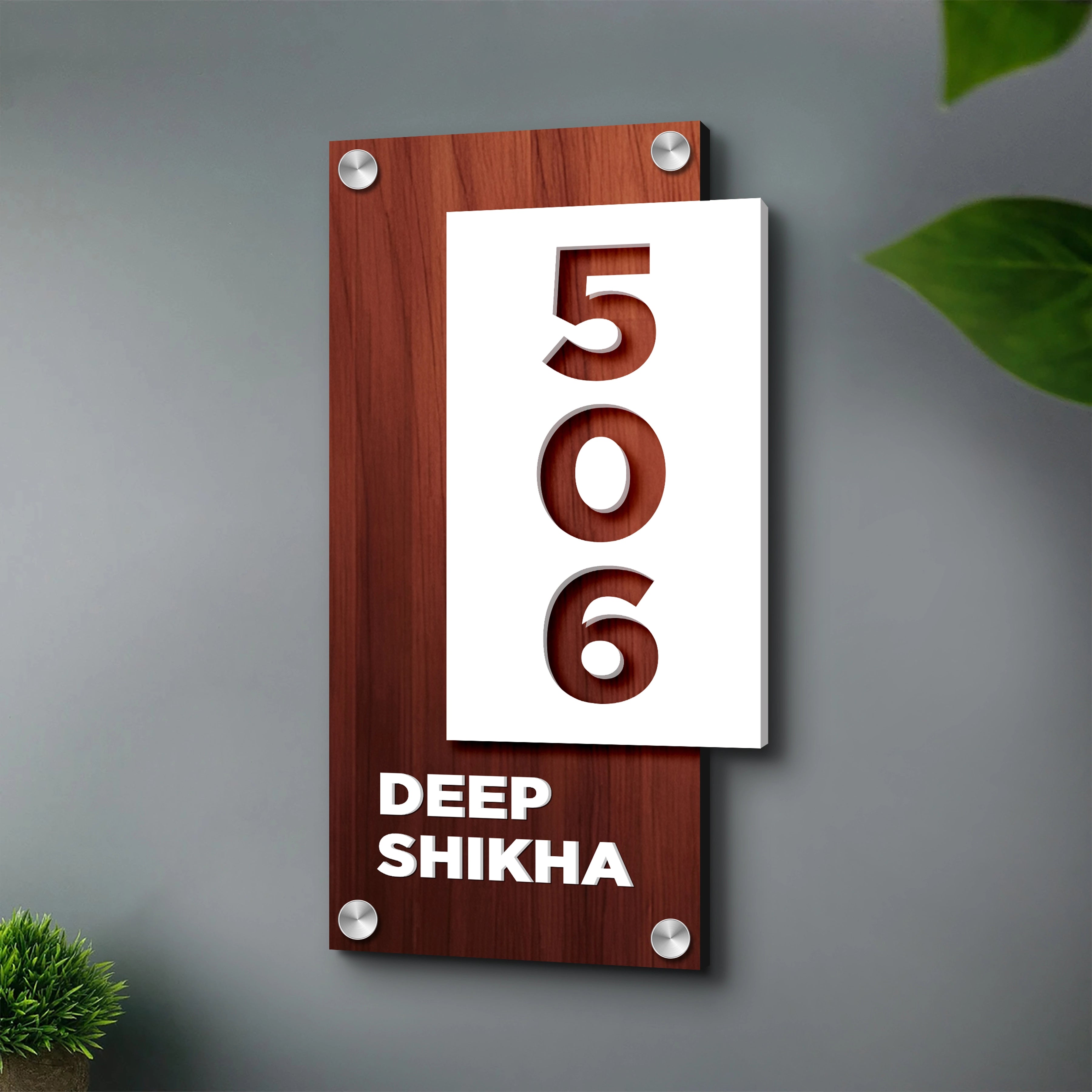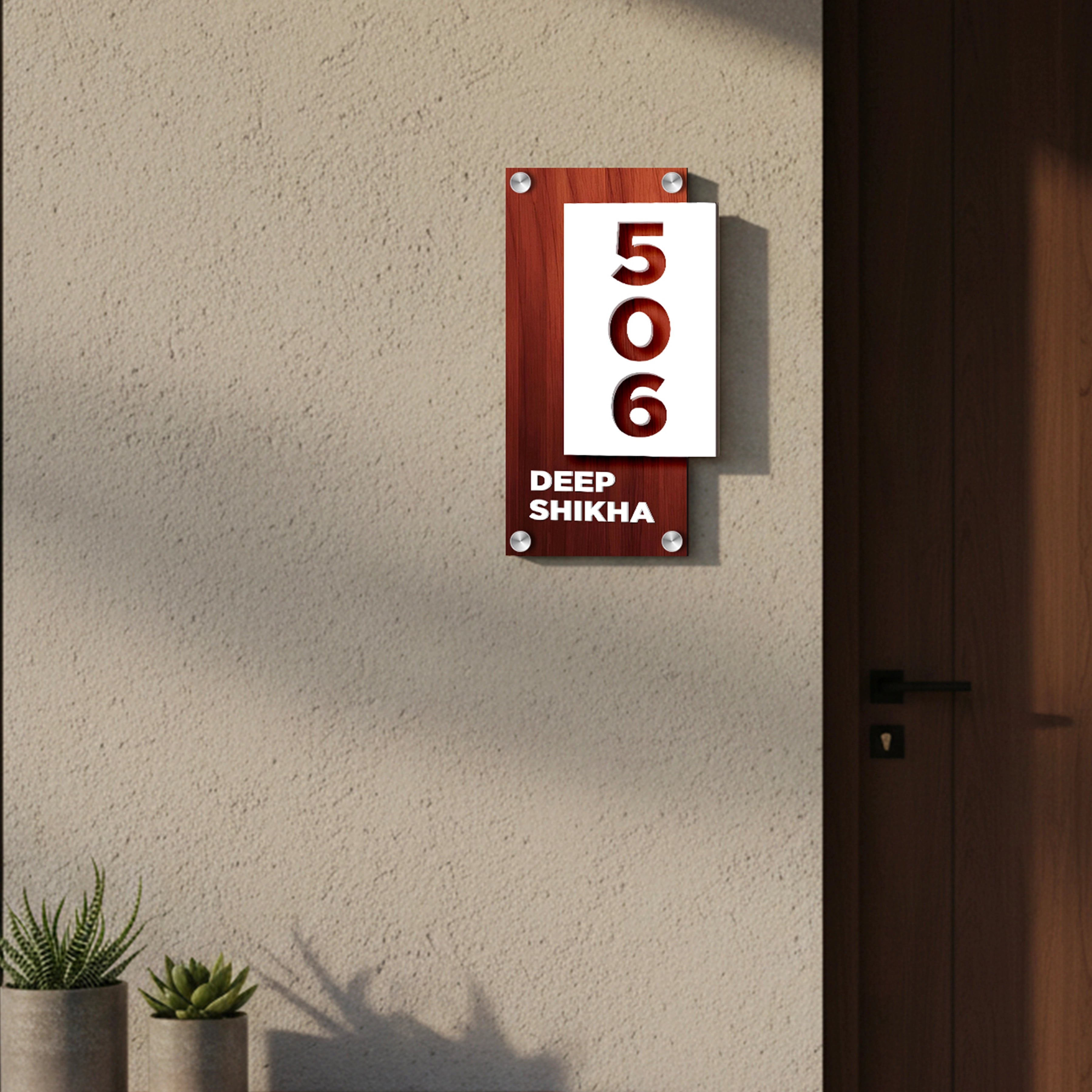 This 3D wooden name plate transforms your doorway with a contemporary vertical design that instantly stands out. The rich wooden base paired with a striking white side panel creates a clean, layered contrast, while the engraved 3D numbers add depth and clarity. The design is inspired by modern apartment aesthetics, not associated with any licensed brand or style.